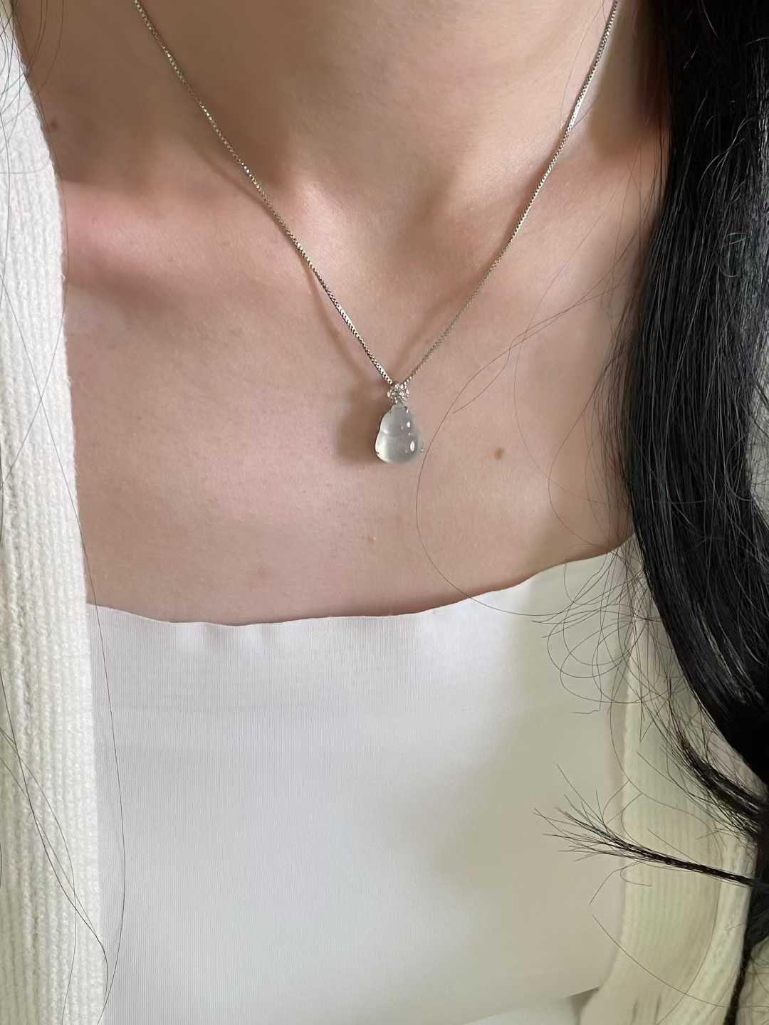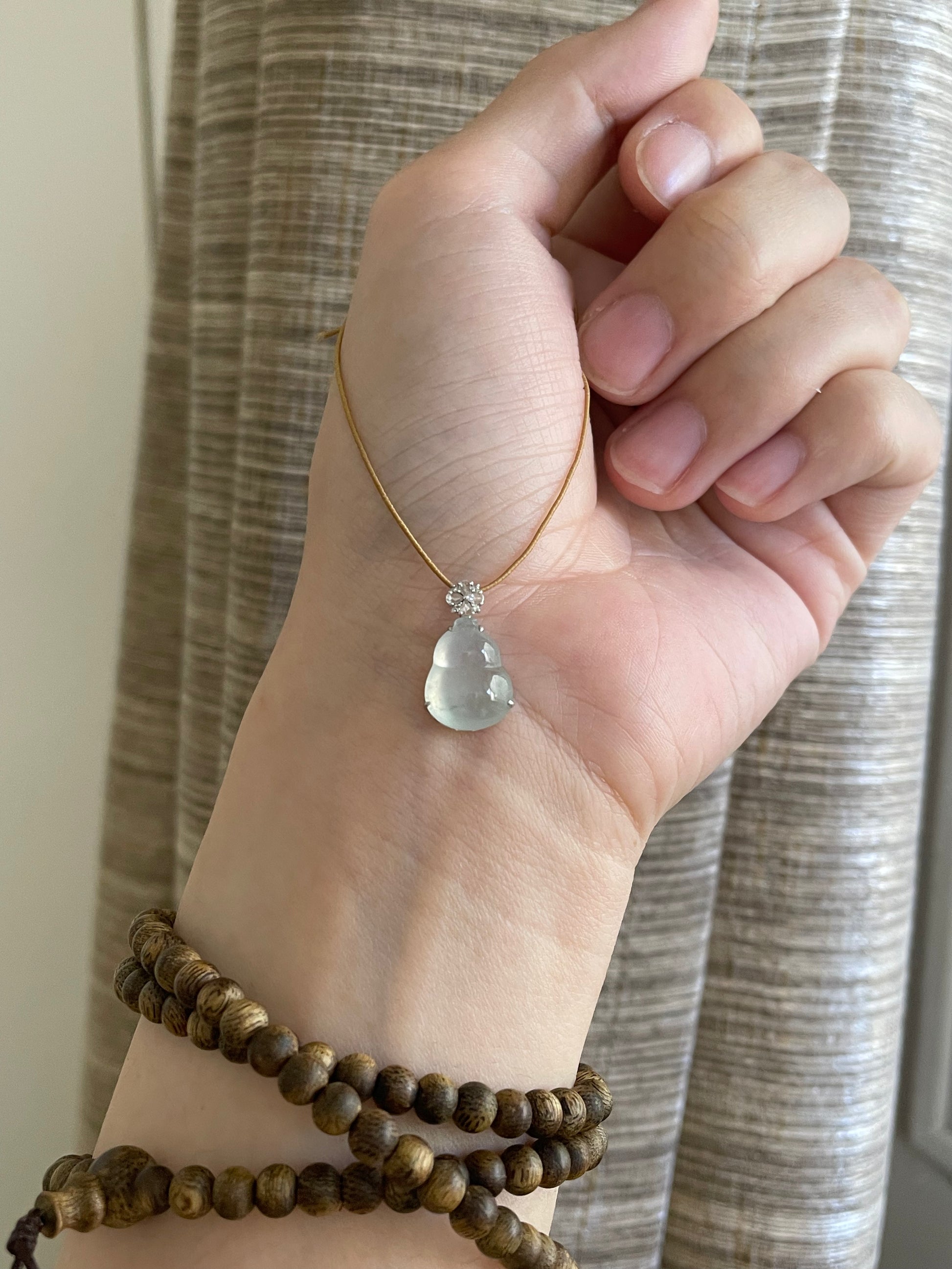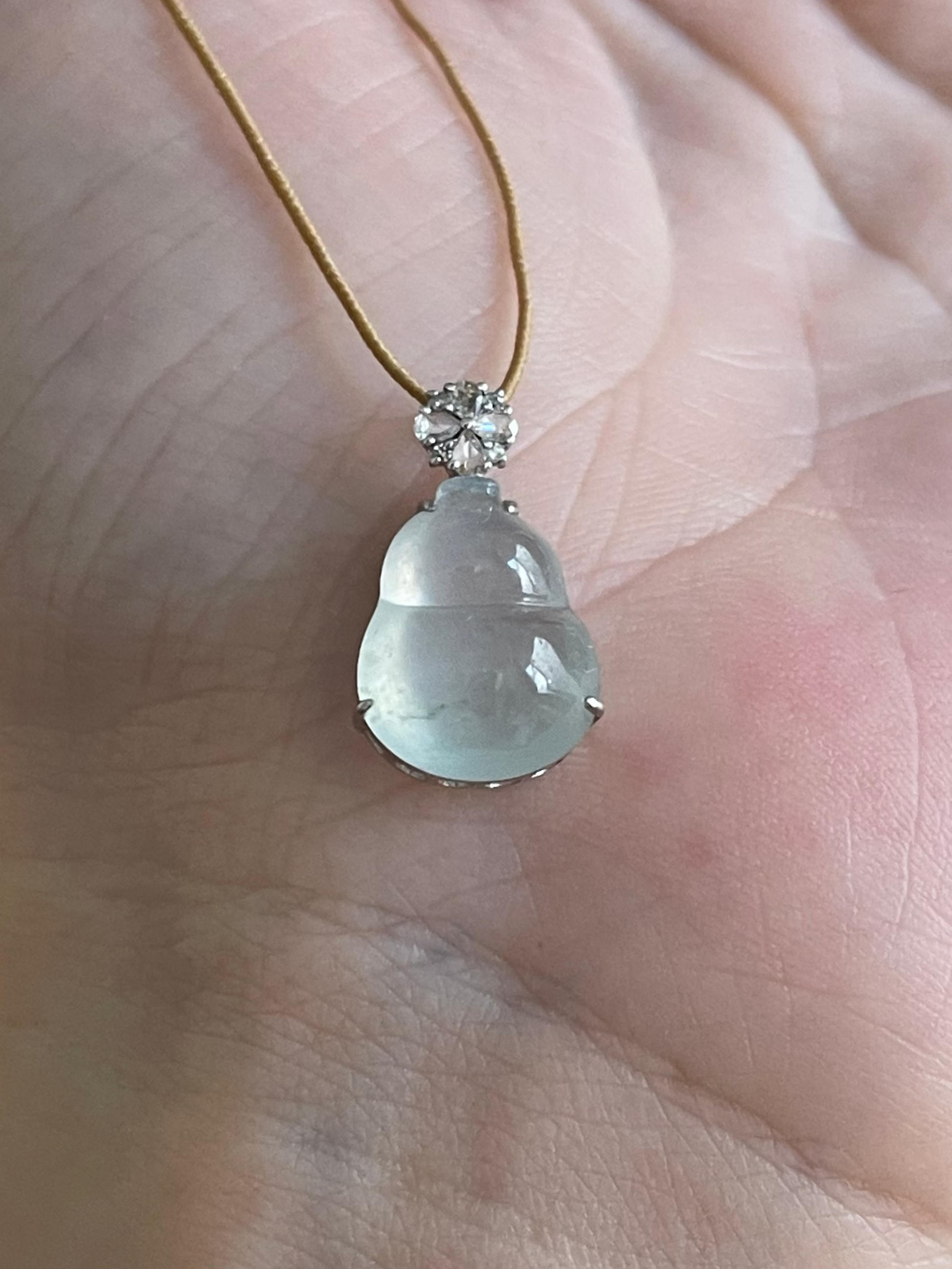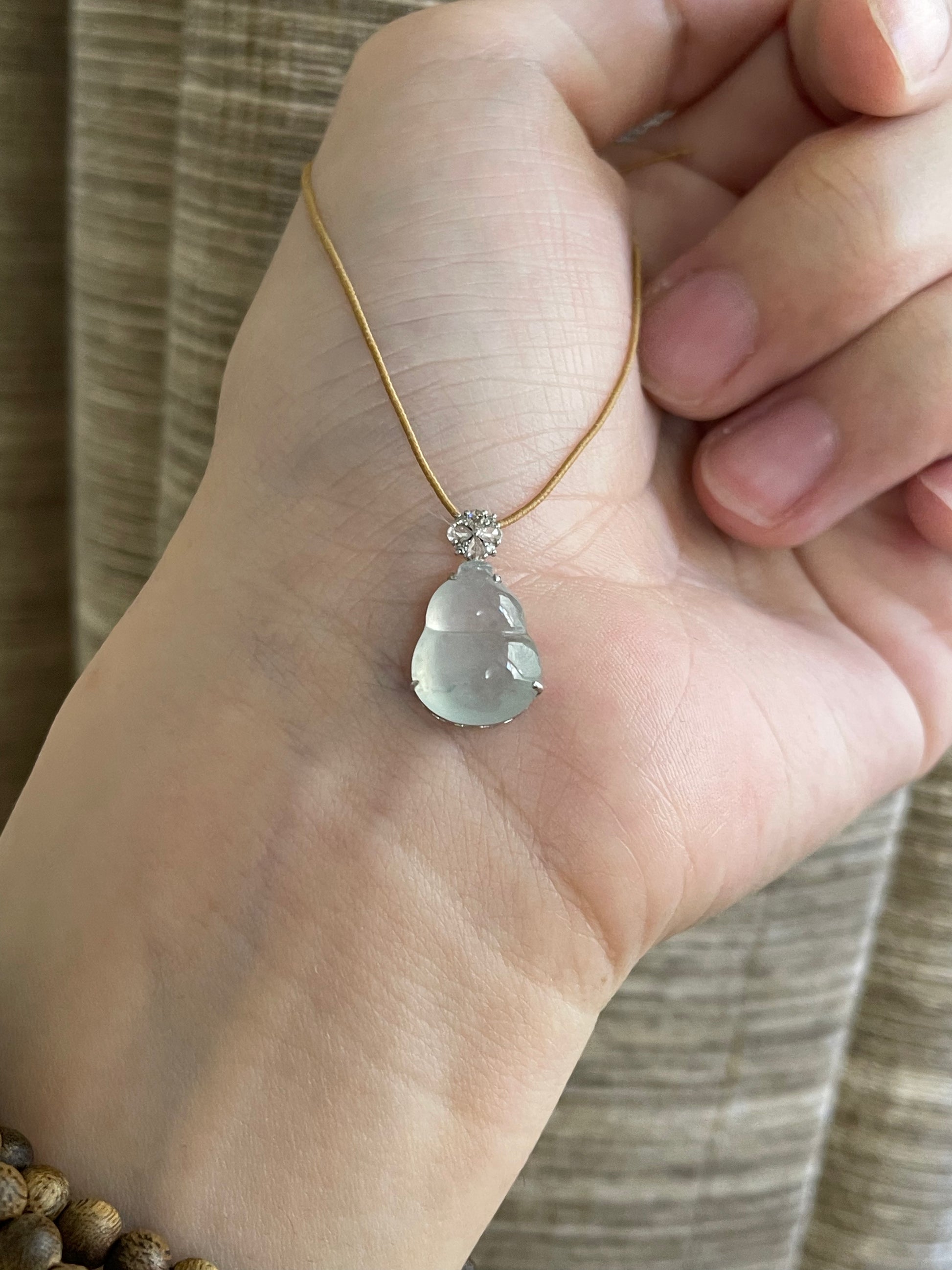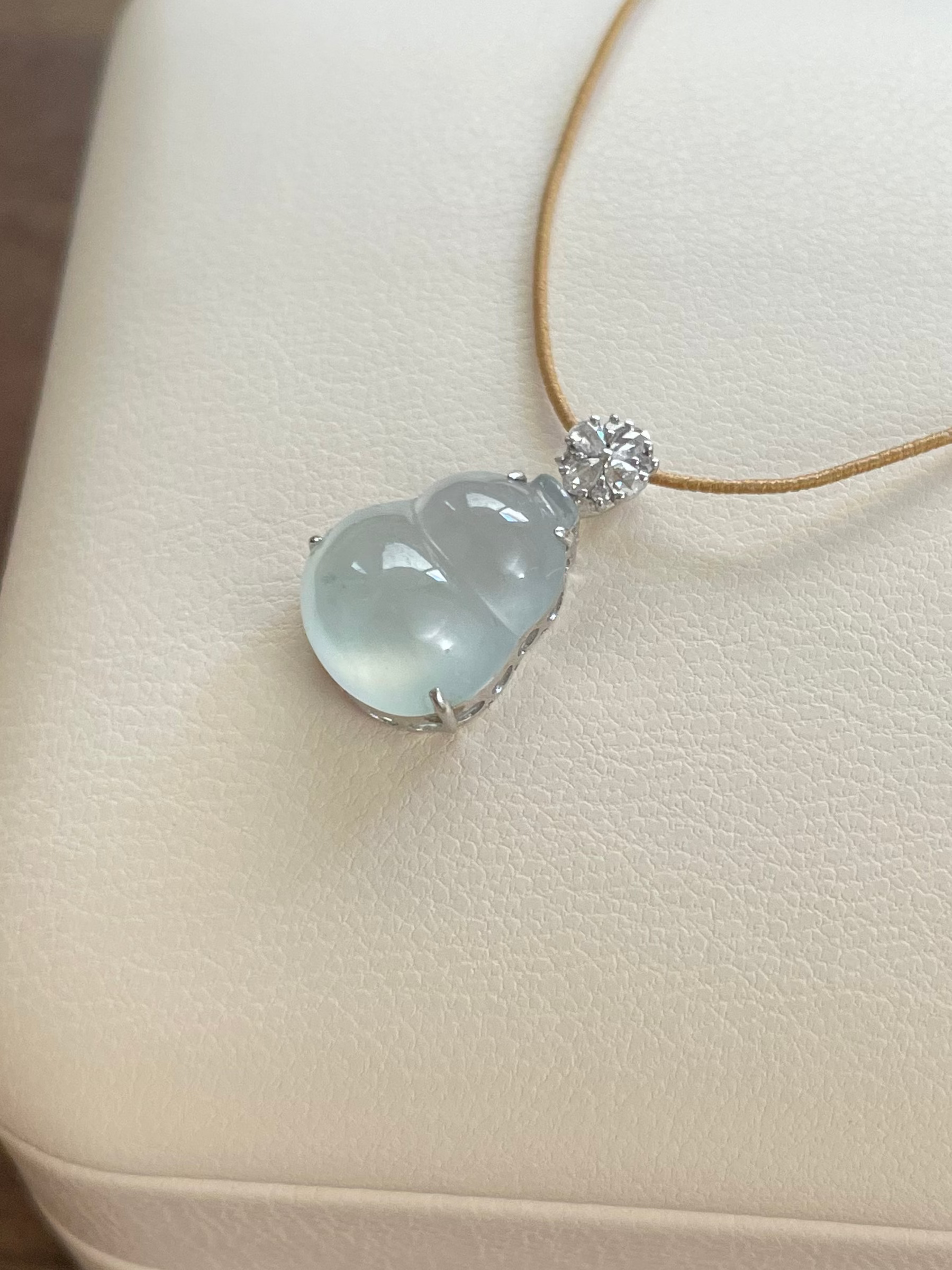 正冰高冰种水,起荧起光,冰透水灵,尺寸不小,厚度也很好,体形很正的胖葫芦,裸石13.2-10.6-5,整体17.8-10.6-7,18k真金真钻镶嵌,造型精致大方好看,寓意也好,葫芦谐音“福禄”,有福禄平安的寓意,自带送礼都是很不错的选择。