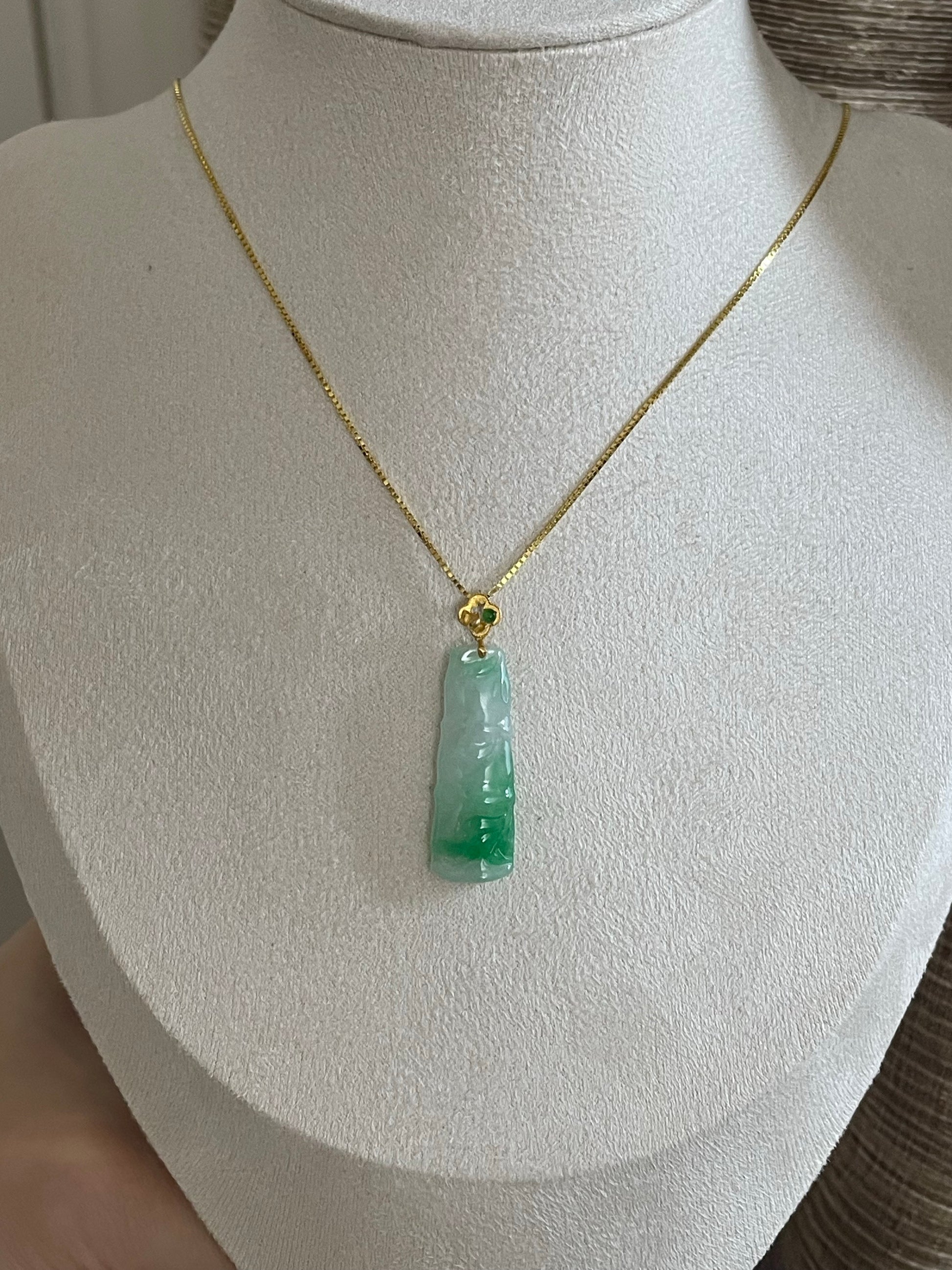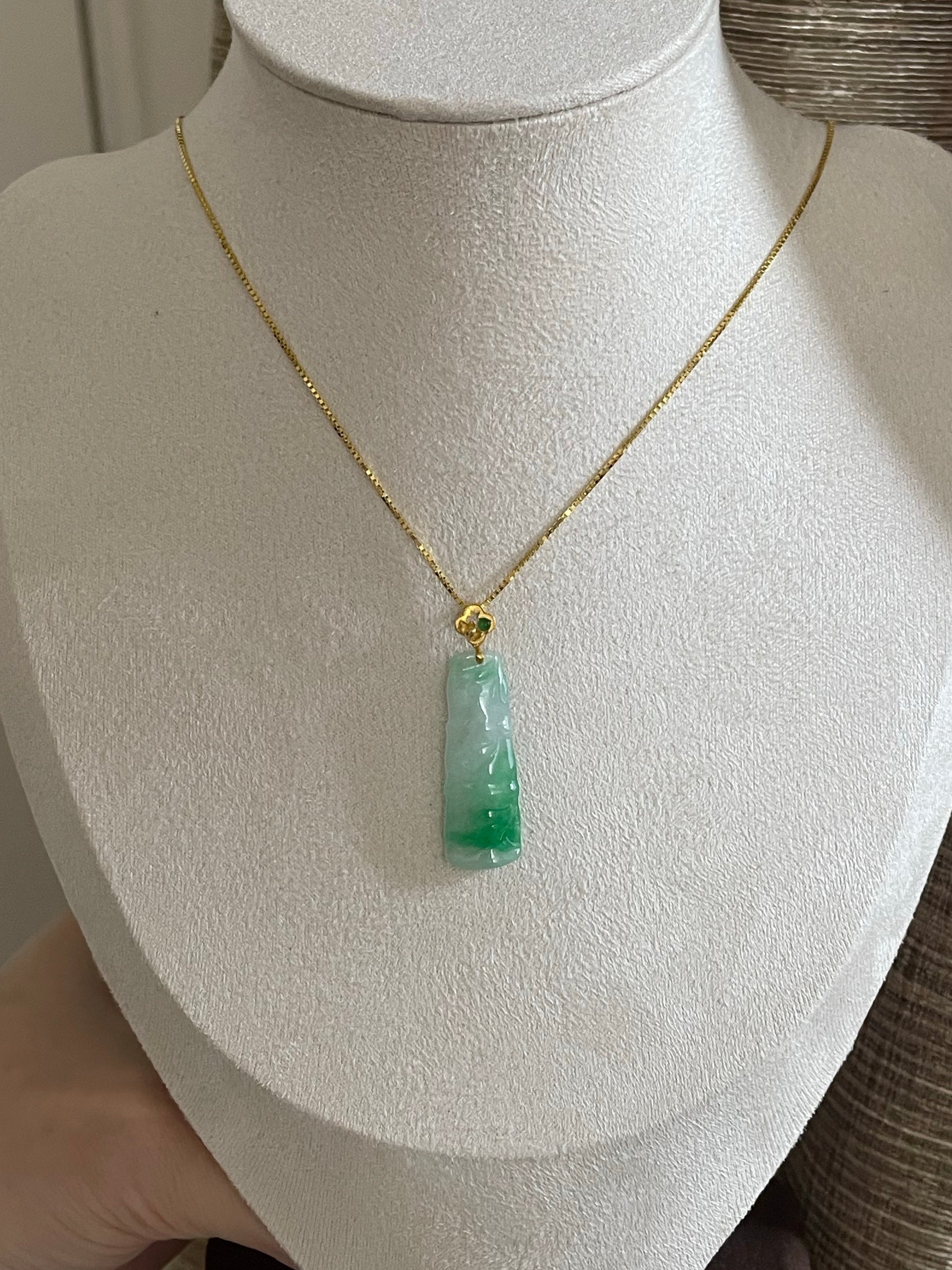 有冰润感,冰飘阳绿,色辣存在感强,雕工精致,竹节寓意步步高升,18k金镶嵌扣头