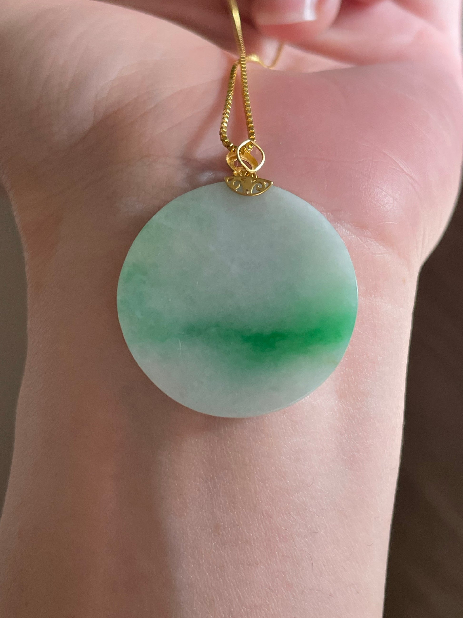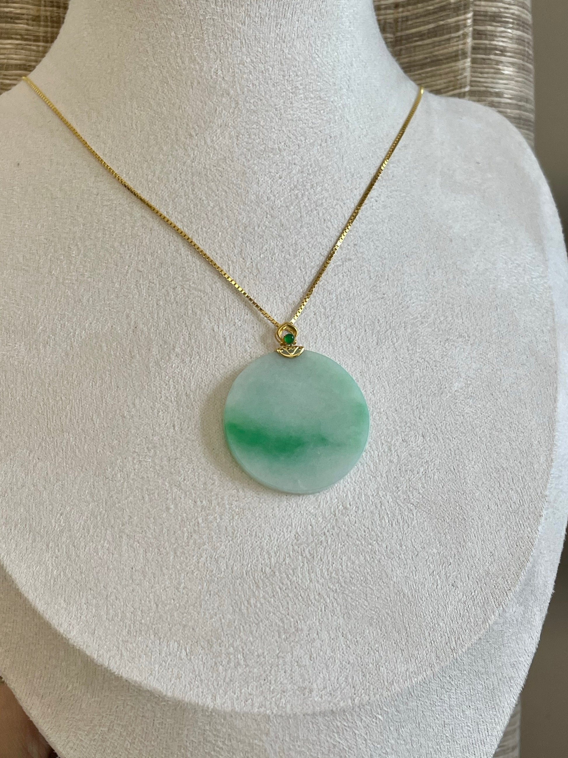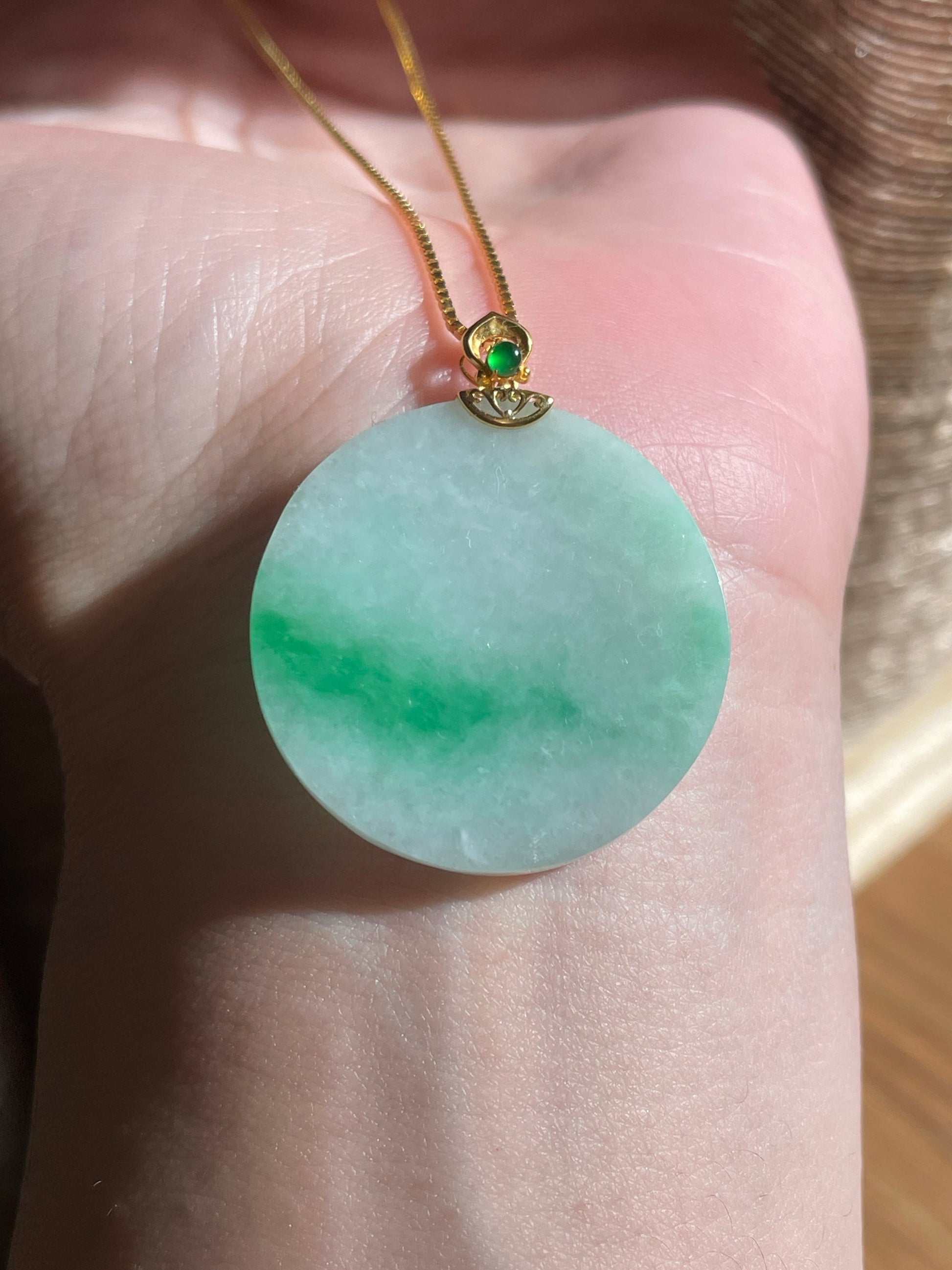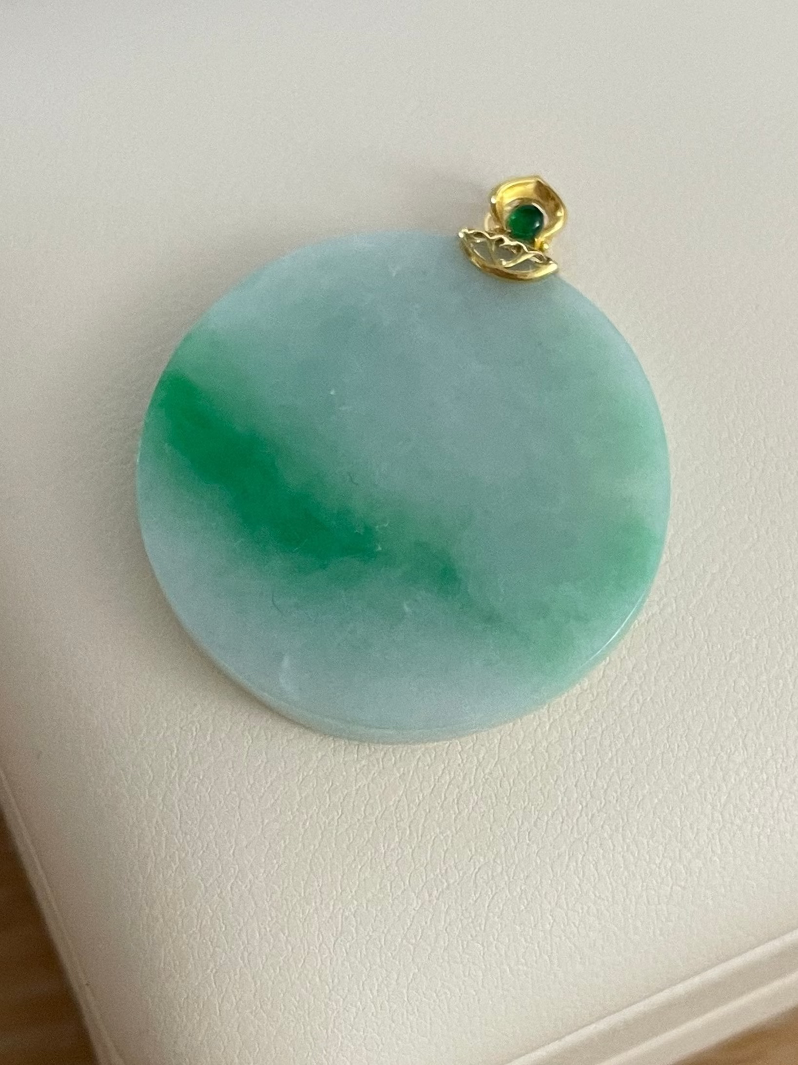 阳绿飘花,色辣色浓,飘花有意境感,尺寸大,存在感很强,用料扎实,18k金镶嵌扣头。