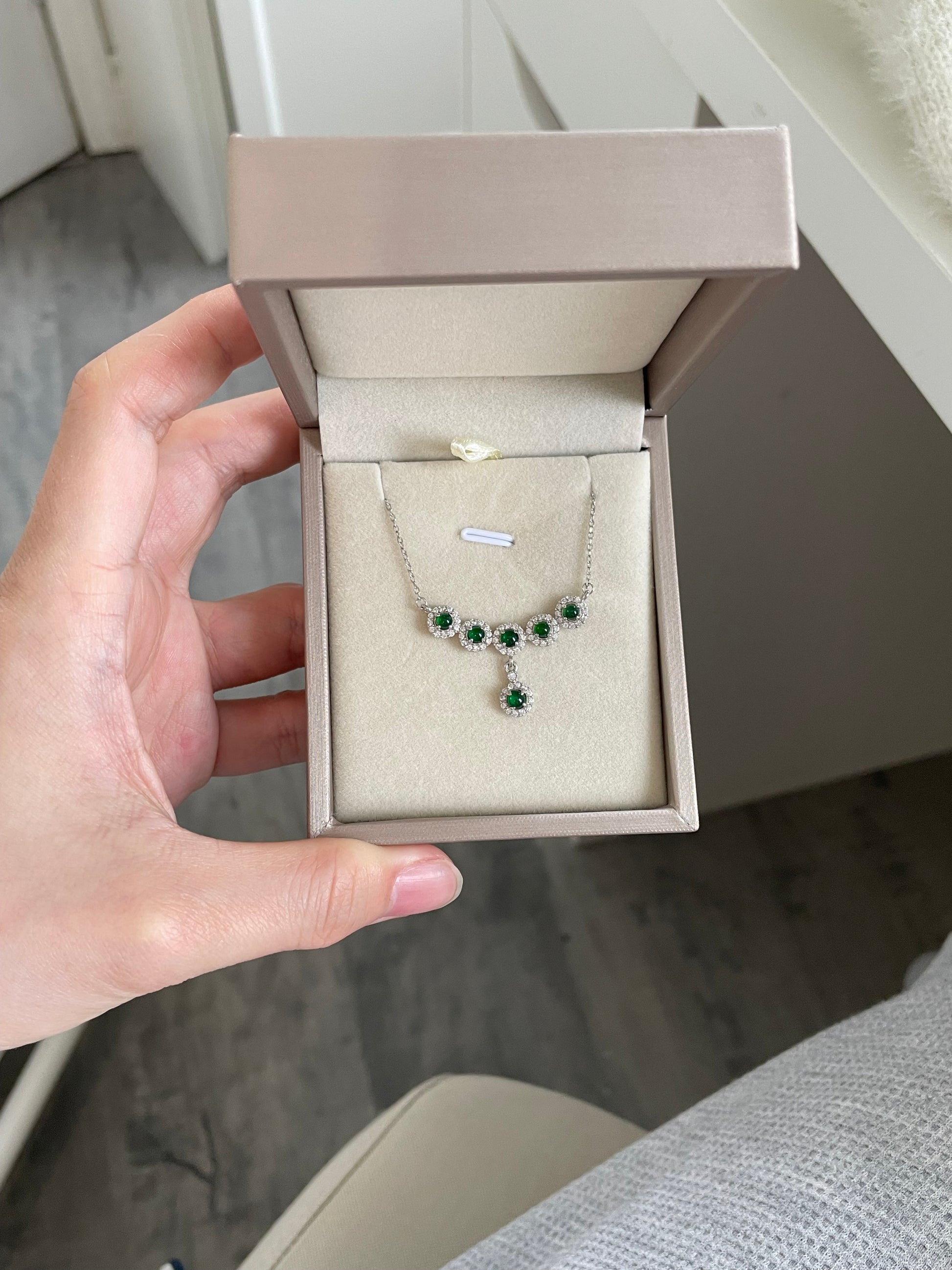 主石为多颗满绿色翡翠,颜色饱满,种水细腻;外圈以925银镶锆石点缀,整体设计款式经典,微笑项链也有乐观积极正能量的寓意;上身佩戴精致显气质,日常通勤皆适宜。