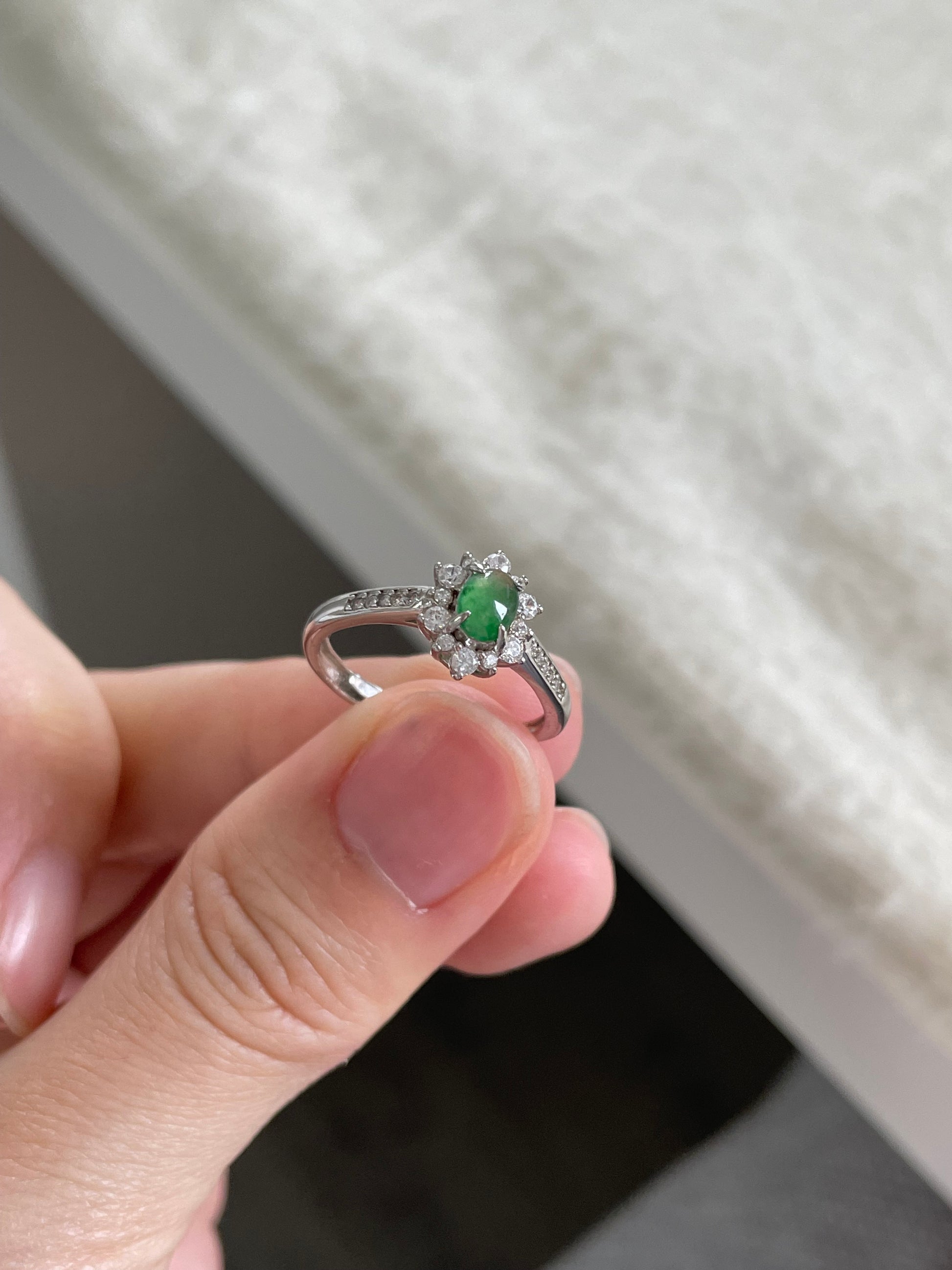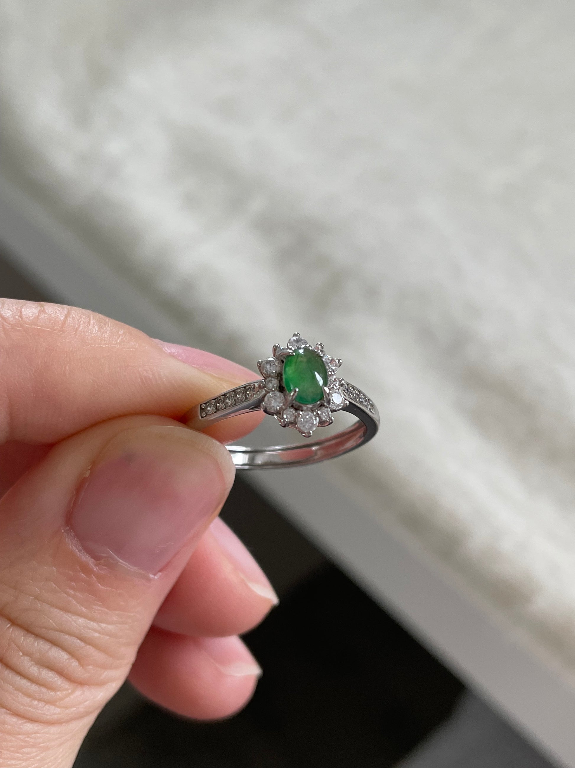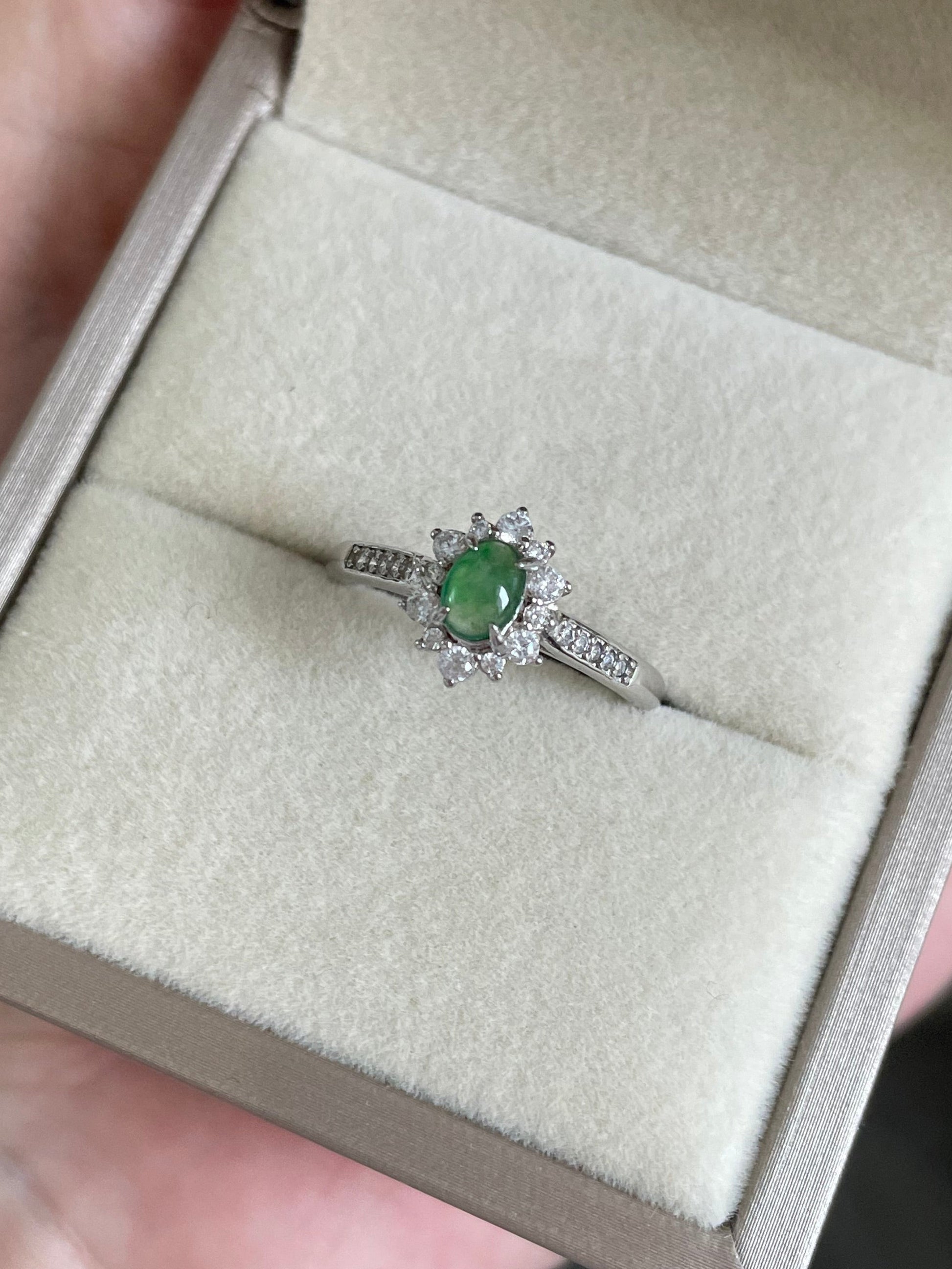 主石为淡绿色翡翠,种水细腻有光感。戒托为925银材质,造型优雅又简洁,是一款适合日常的百搭选择。翡翠裸石约5.7mm-4.3mm,厚度约1.7mm。