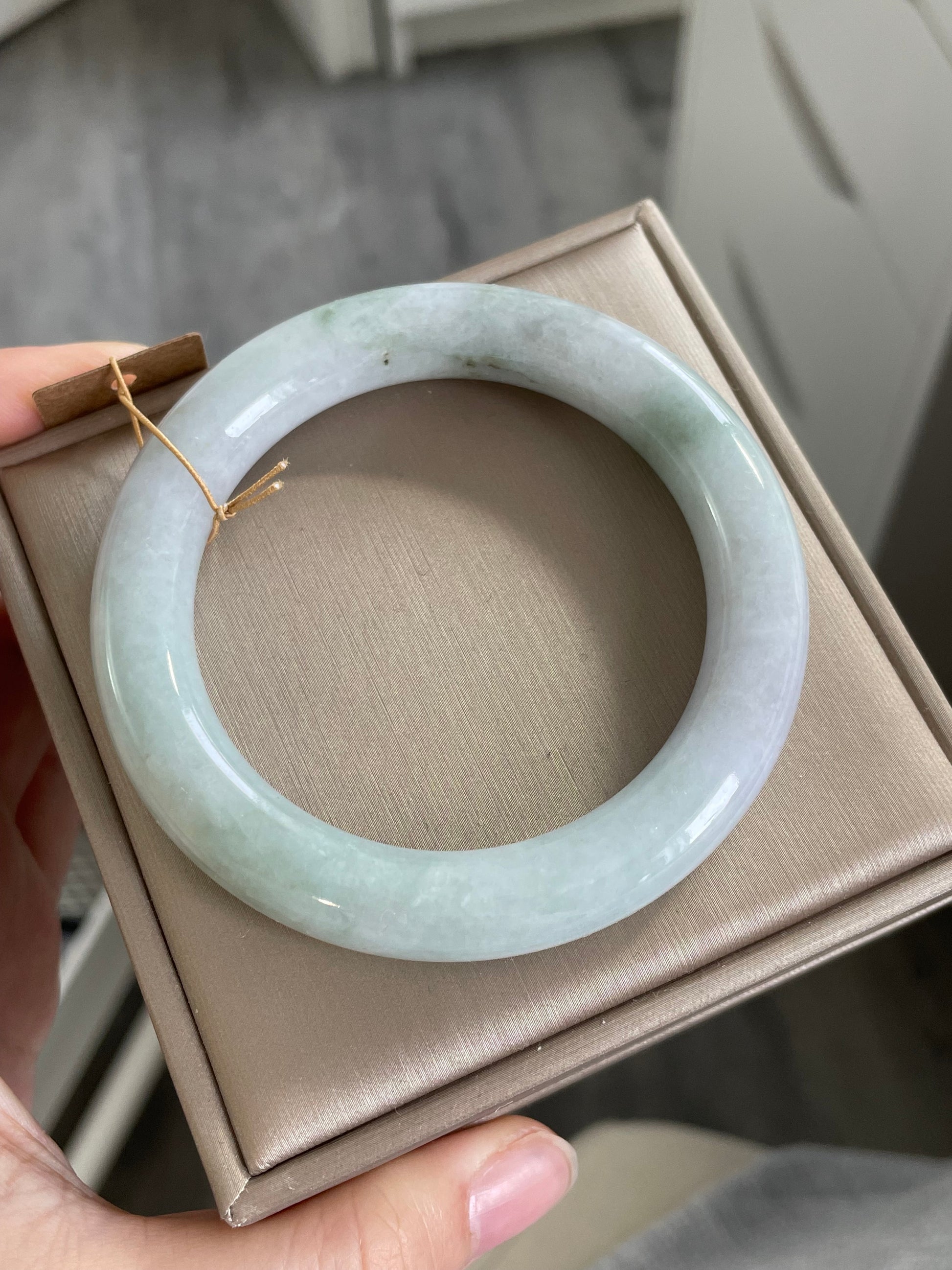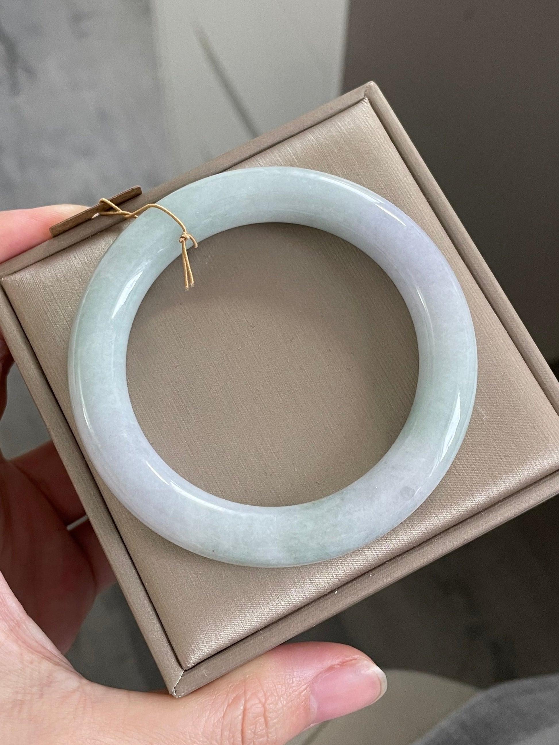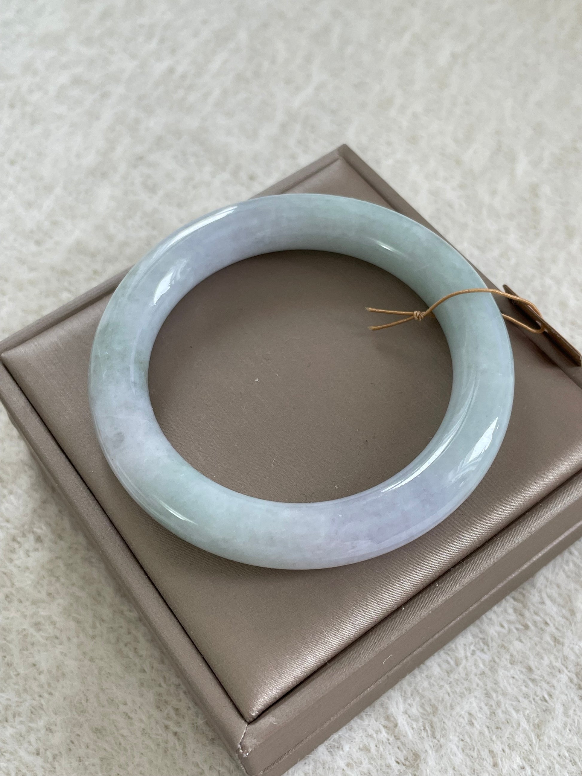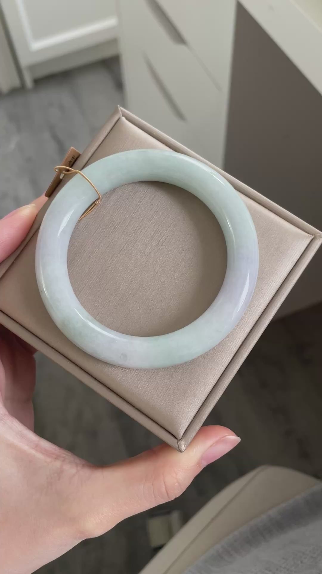 以绿色和紫色为底色,底子较细腻,颜色柔和过渡自然,条形饱满圆润;上手显气质温柔清爽,日常佩戴百搭耐看。尺寸约54.7mm,条宽约 10.6mm,厚度约 10.5mm。