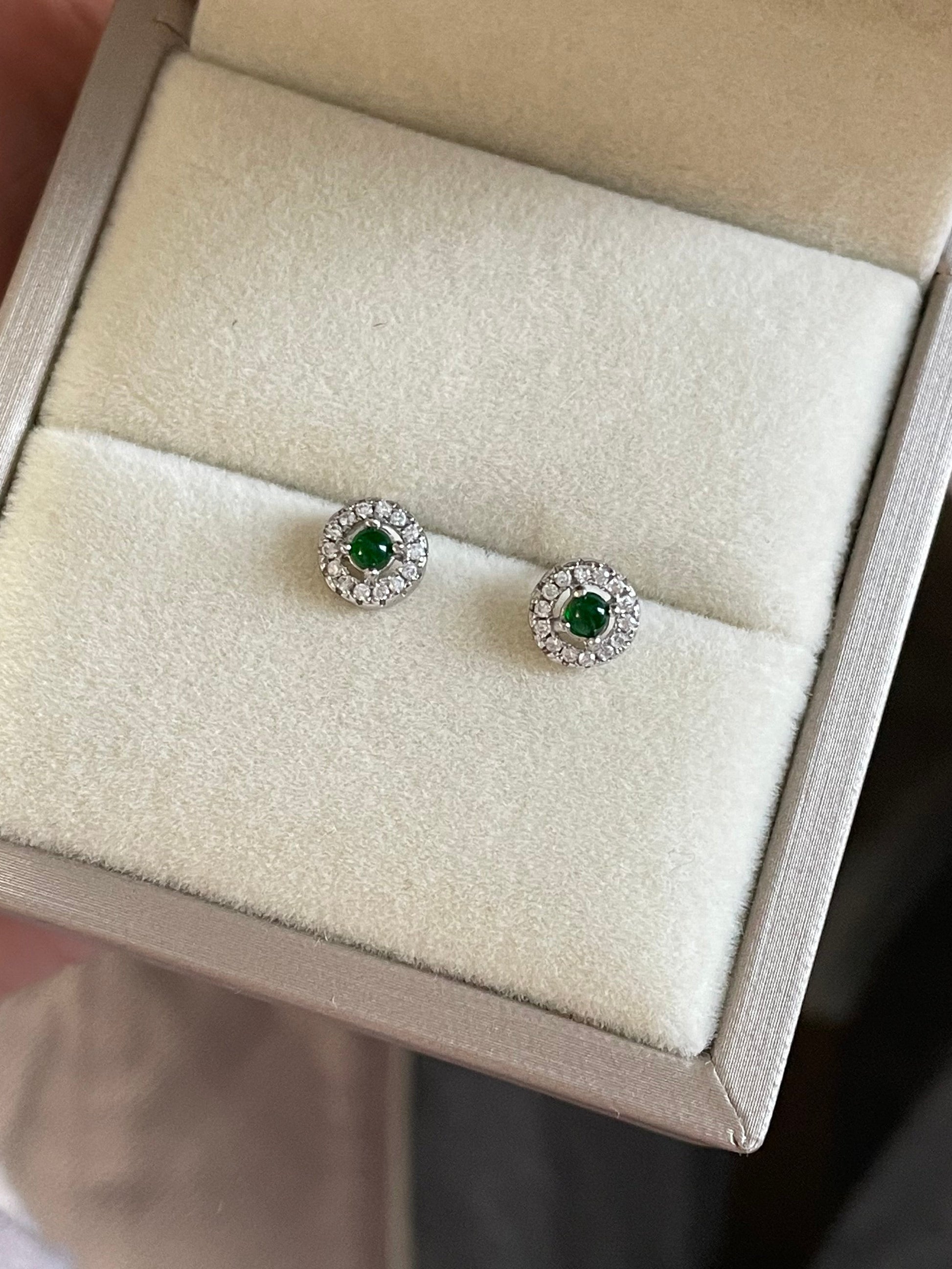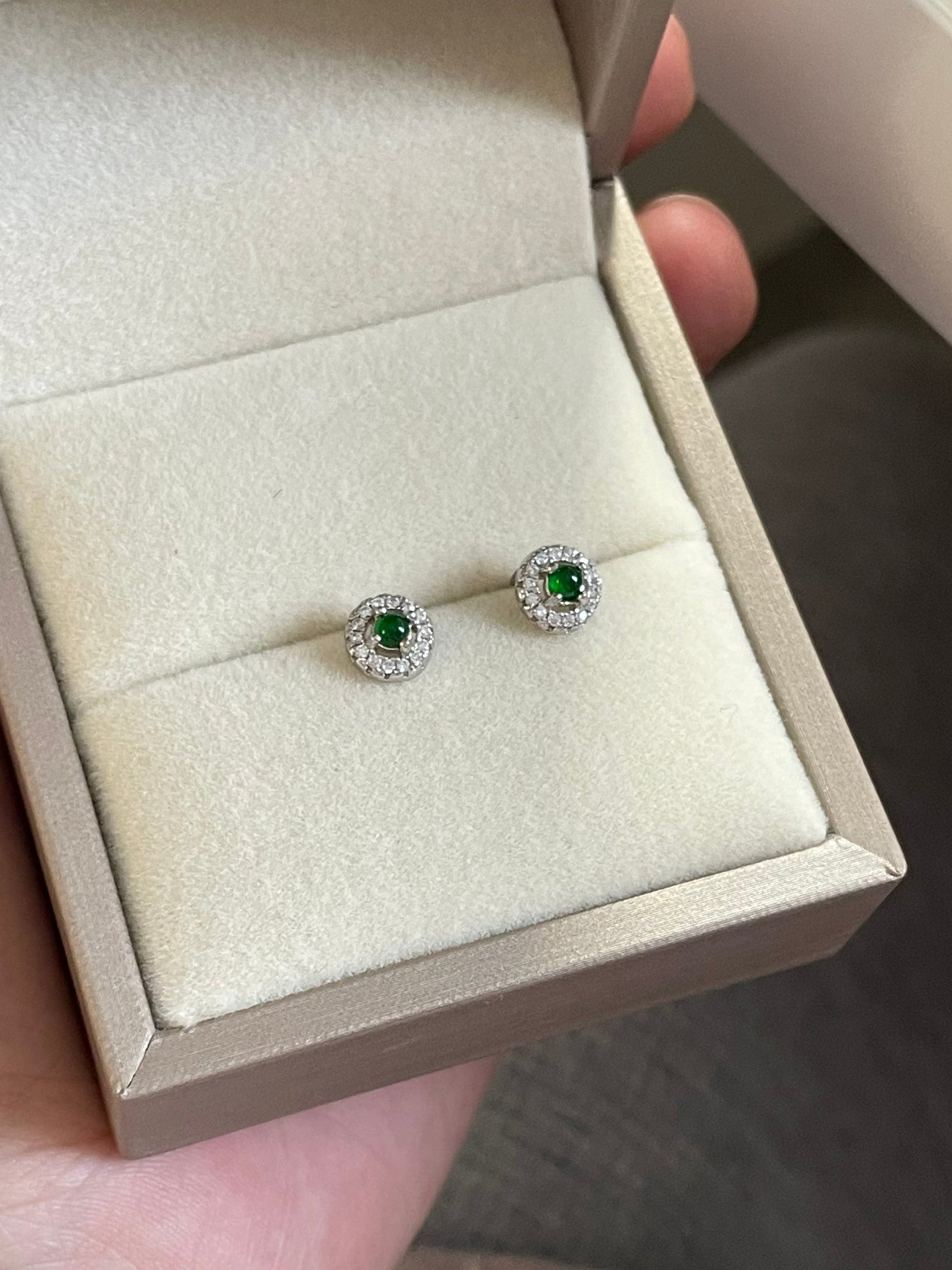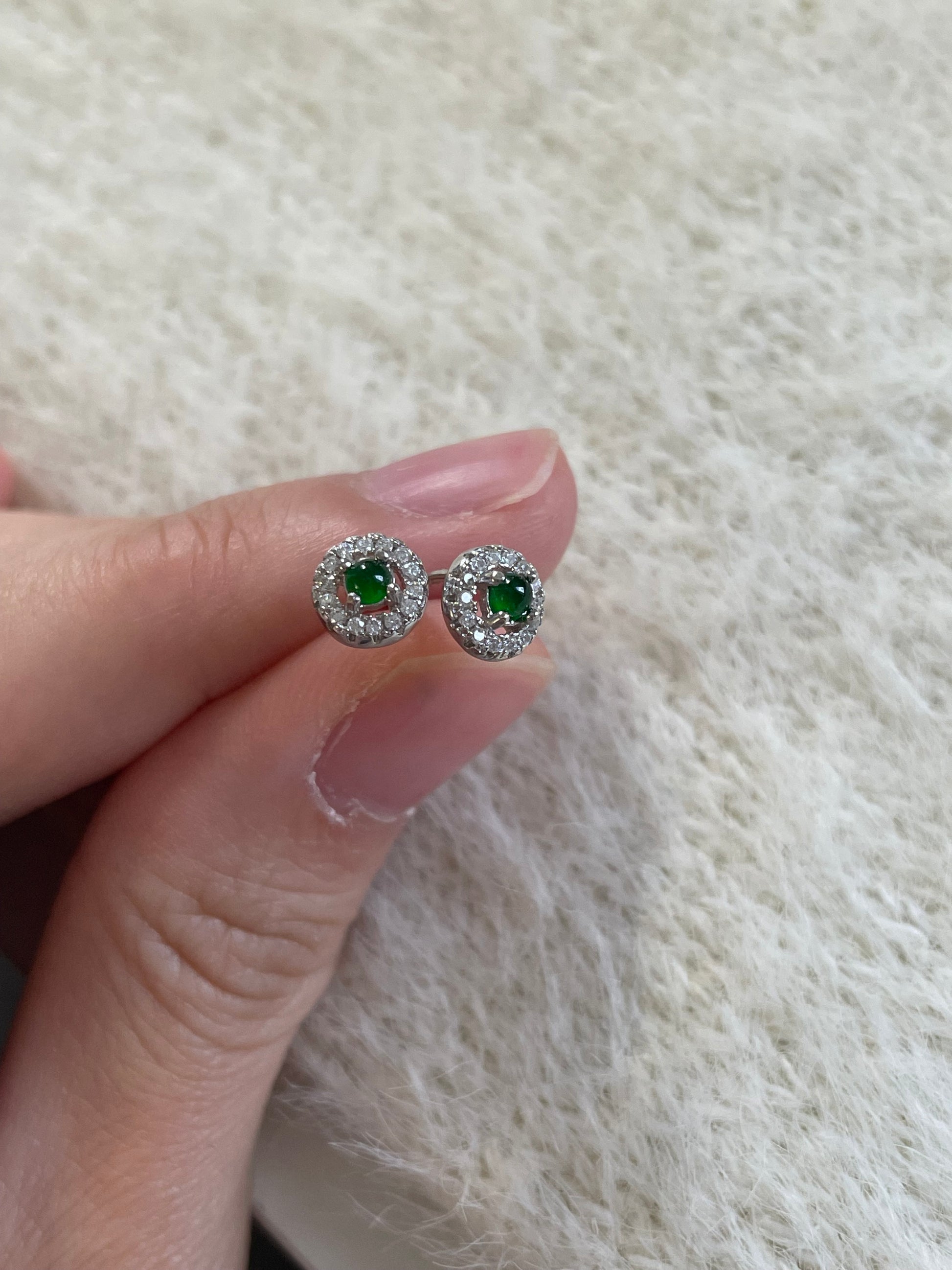 天然危地马拉翡翠,翡翠颜色深绿色,外圈是 925 银搭配锆石围镶,风格经典,小巧精致,日常戴也不会夸张的一对小耳钉。配证书。