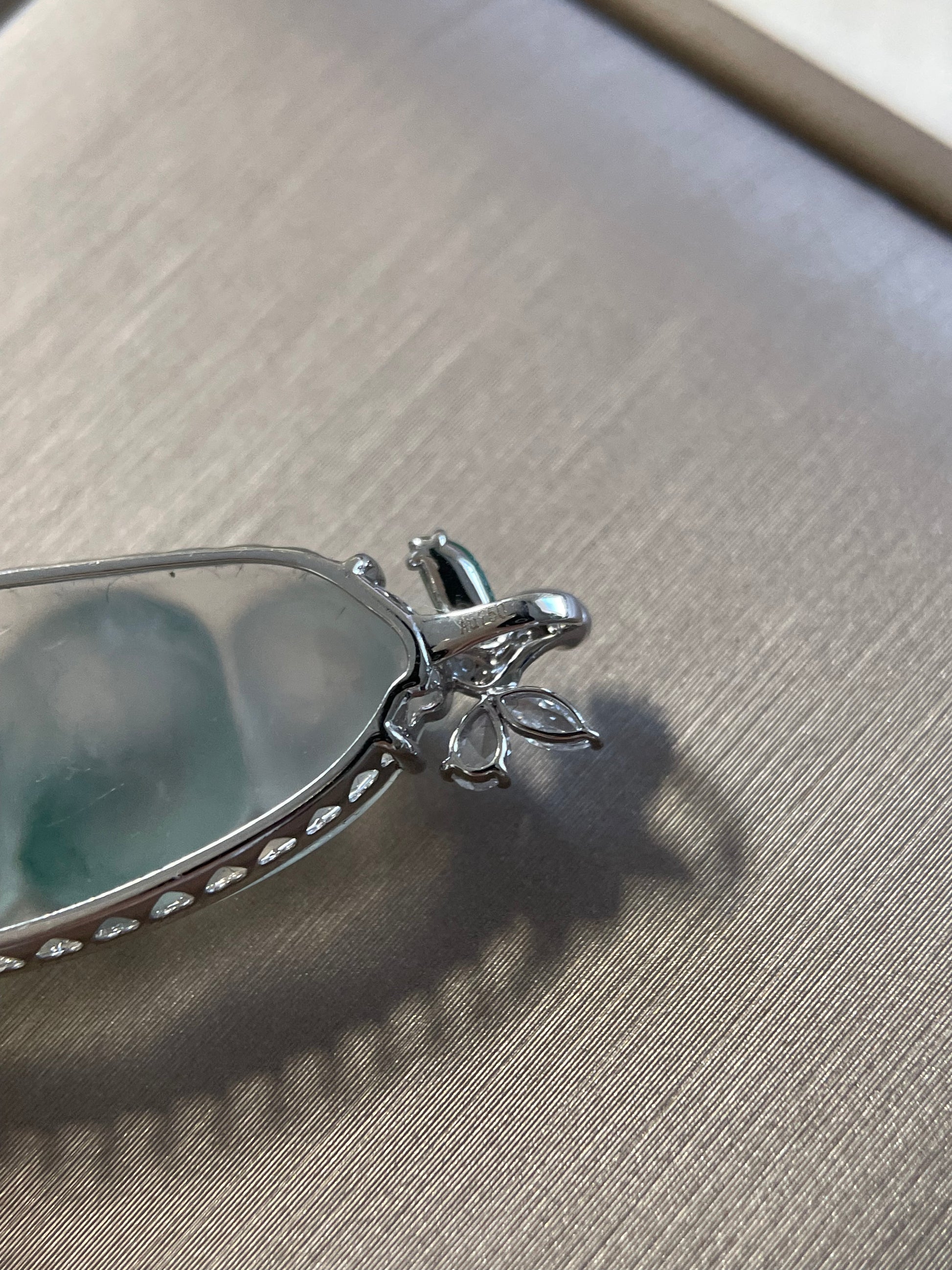 18k金伴真钻镶嵌扣头,重金镶嵌,枝节扣头生动形象,点缀的绿色随形也是帝王绿缅甸翡翠,有种有色,整体更显层次与精致,上身灵动又贵气。
