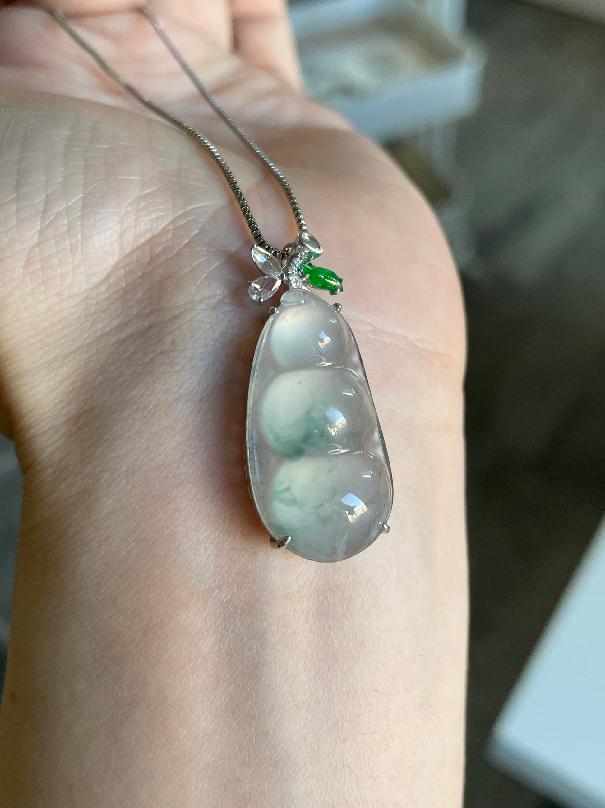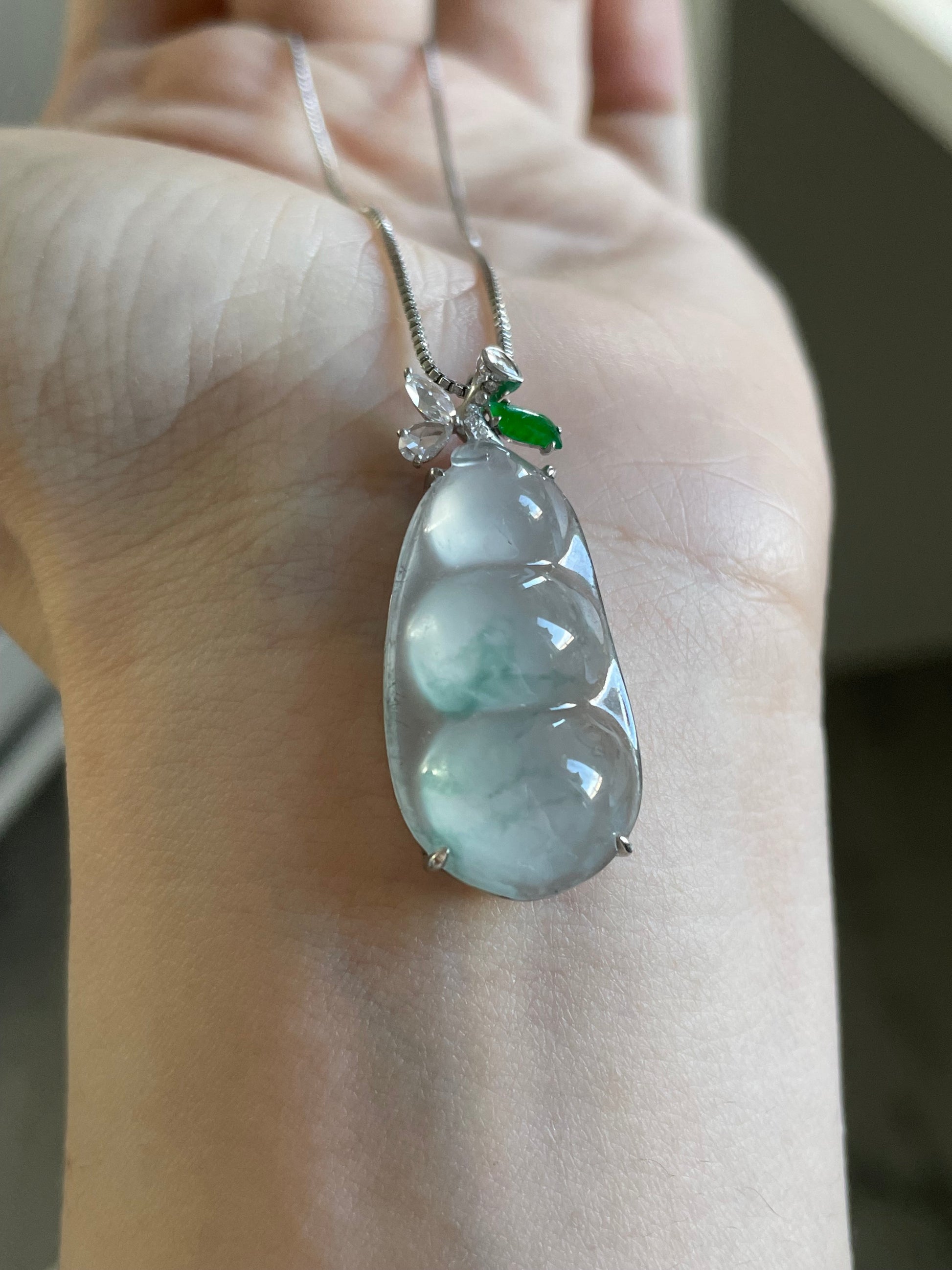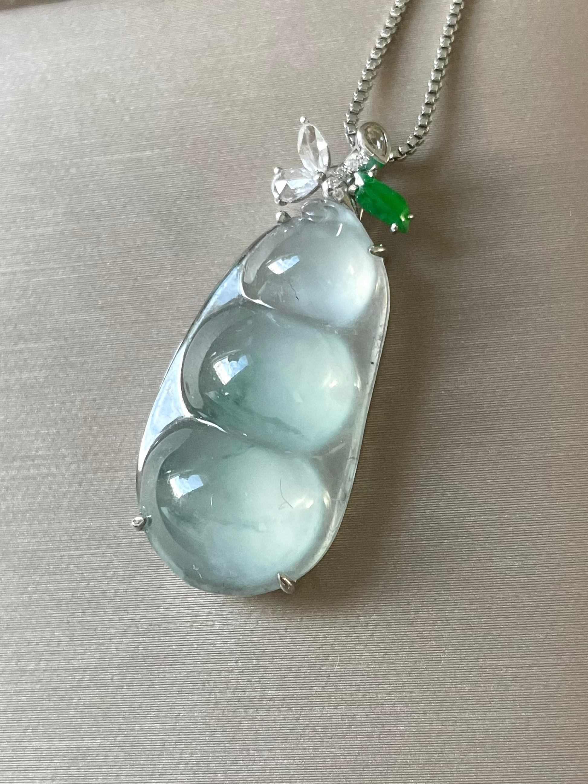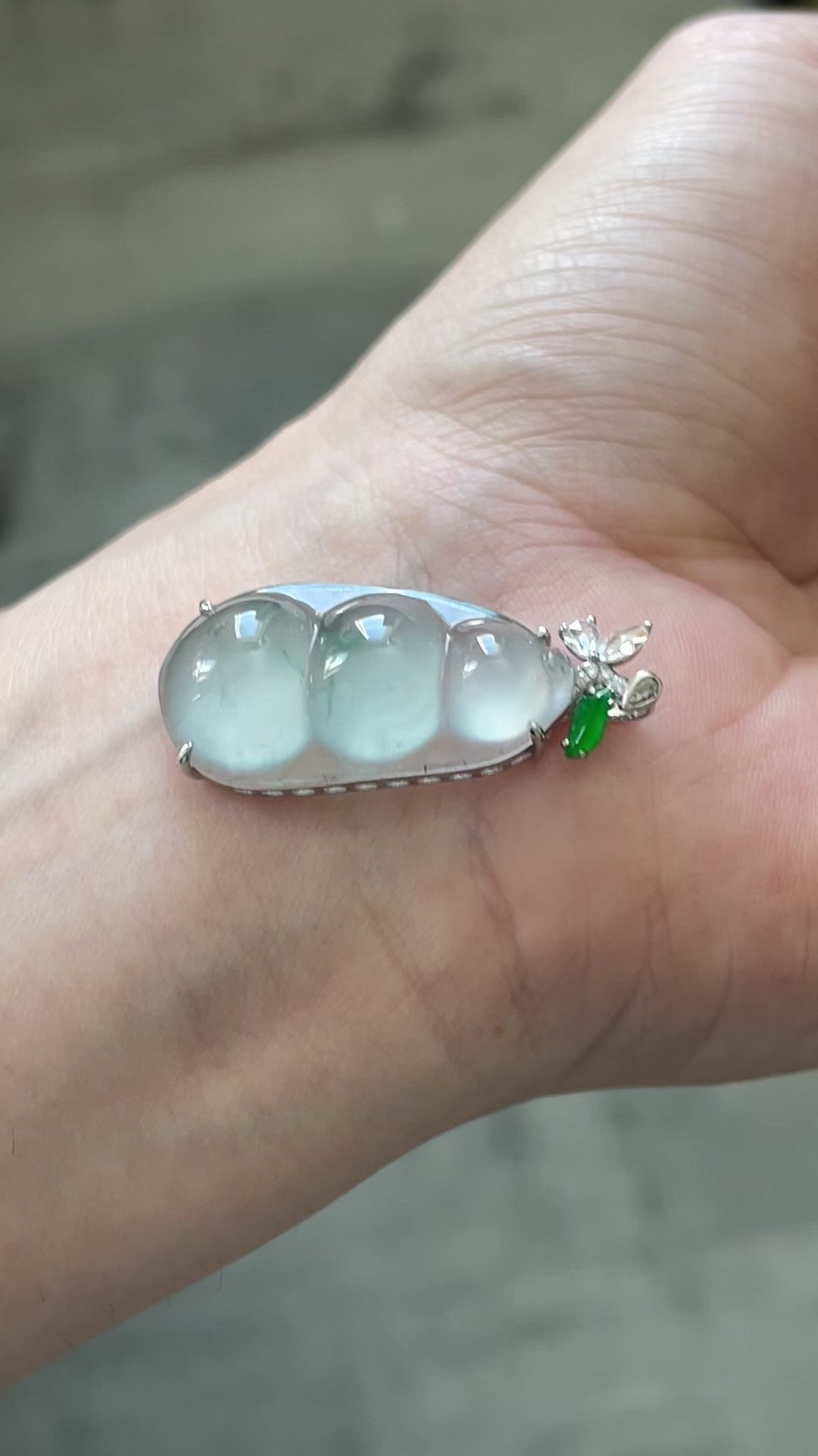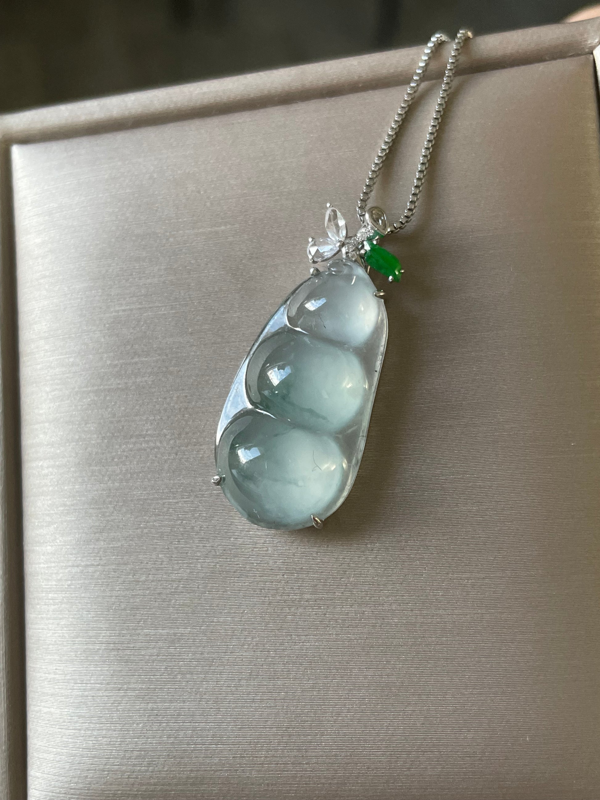 翡翠福豆整体为高冰晴底,通透感极佳,光感很强,底子很纯很细腻,种老肉细,放在水里感觉都快化了;点缀几抹绿飘花、灵动自然;三颗豆子形体饱满圆润,福豆寓意“福运连连、好运接连不断”。