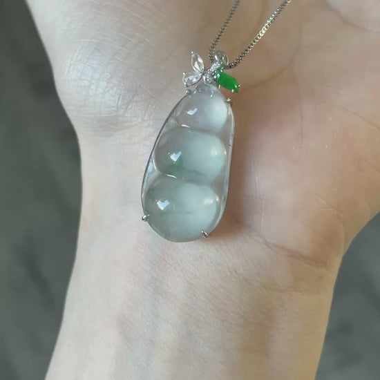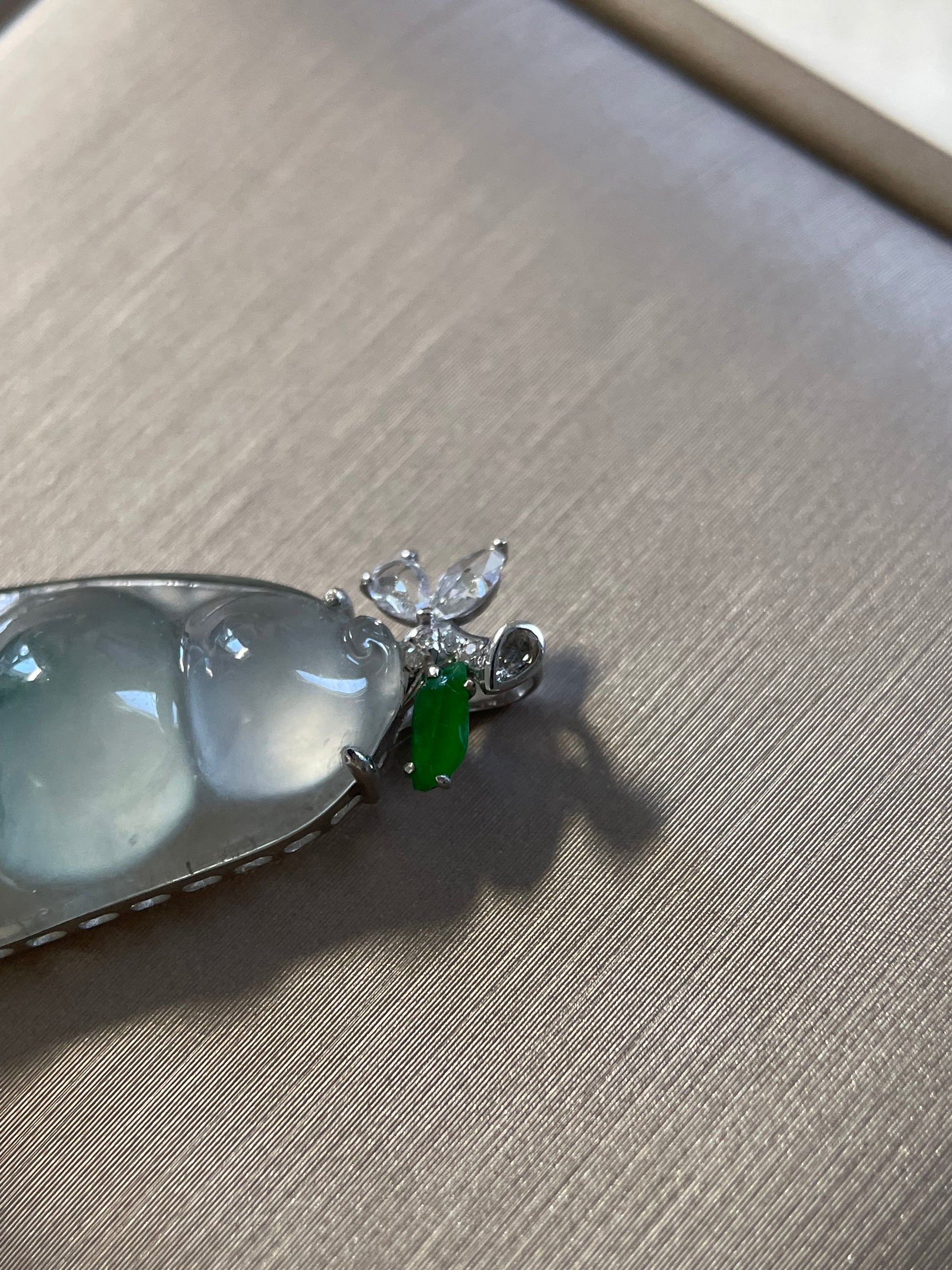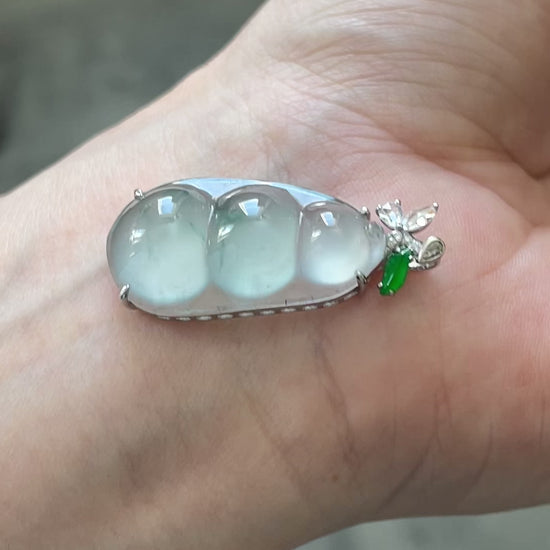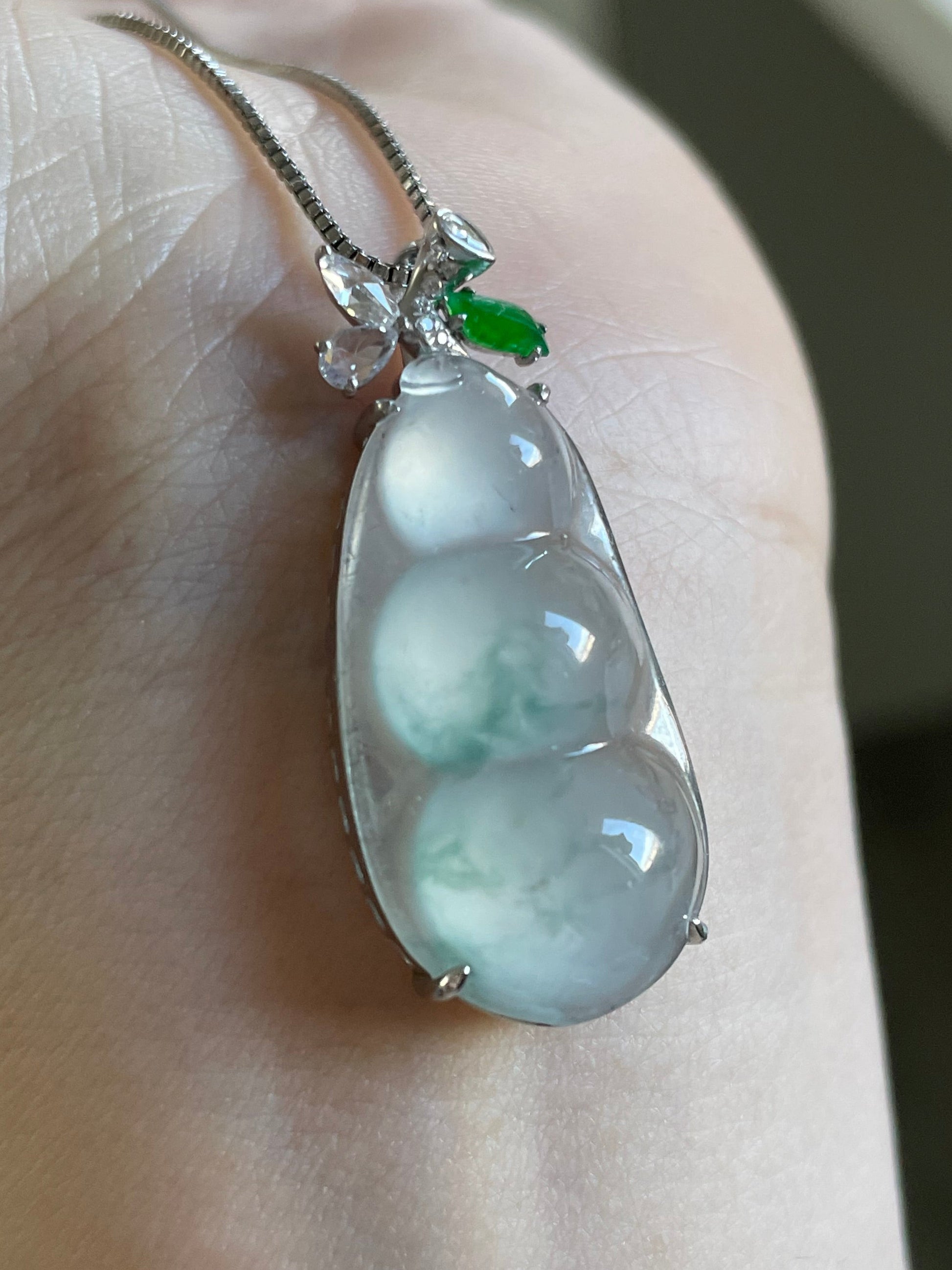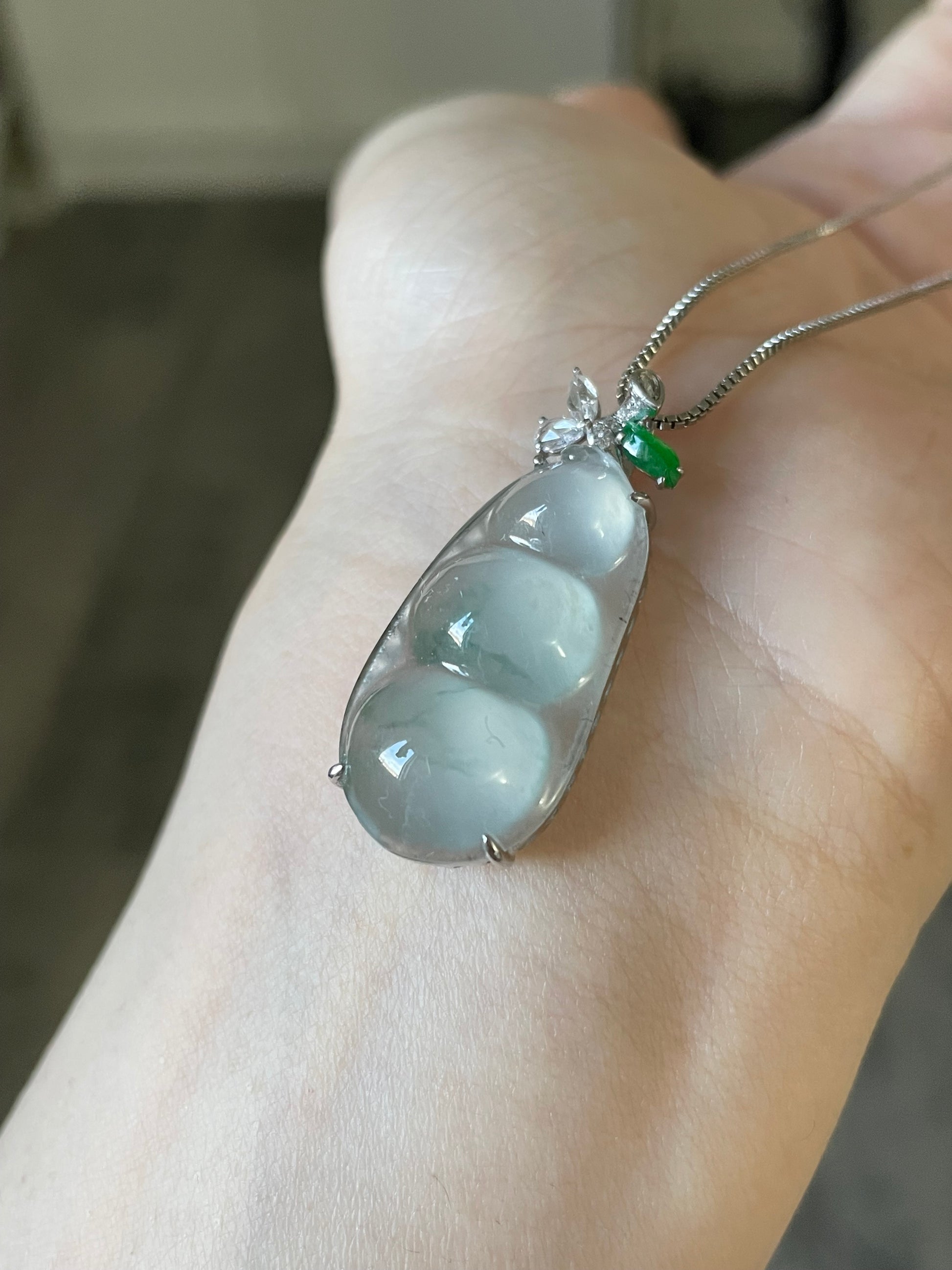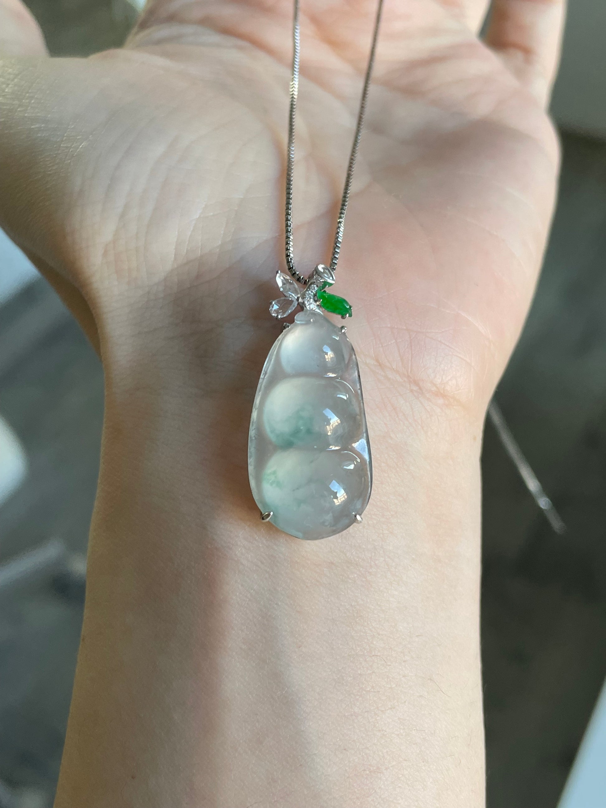 翡翠福豆整体为高冰晴底,通透感极佳,光感很强,底子很纯很细腻,种老肉细,放在水里感觉都快化了;点缀几抹绿飘花、灵动自然;三颗豆子形体饱满圆润,福豆寓意“福运连连、好运接连不断”。