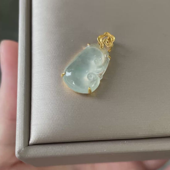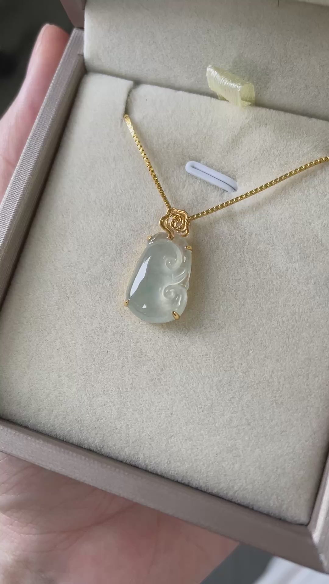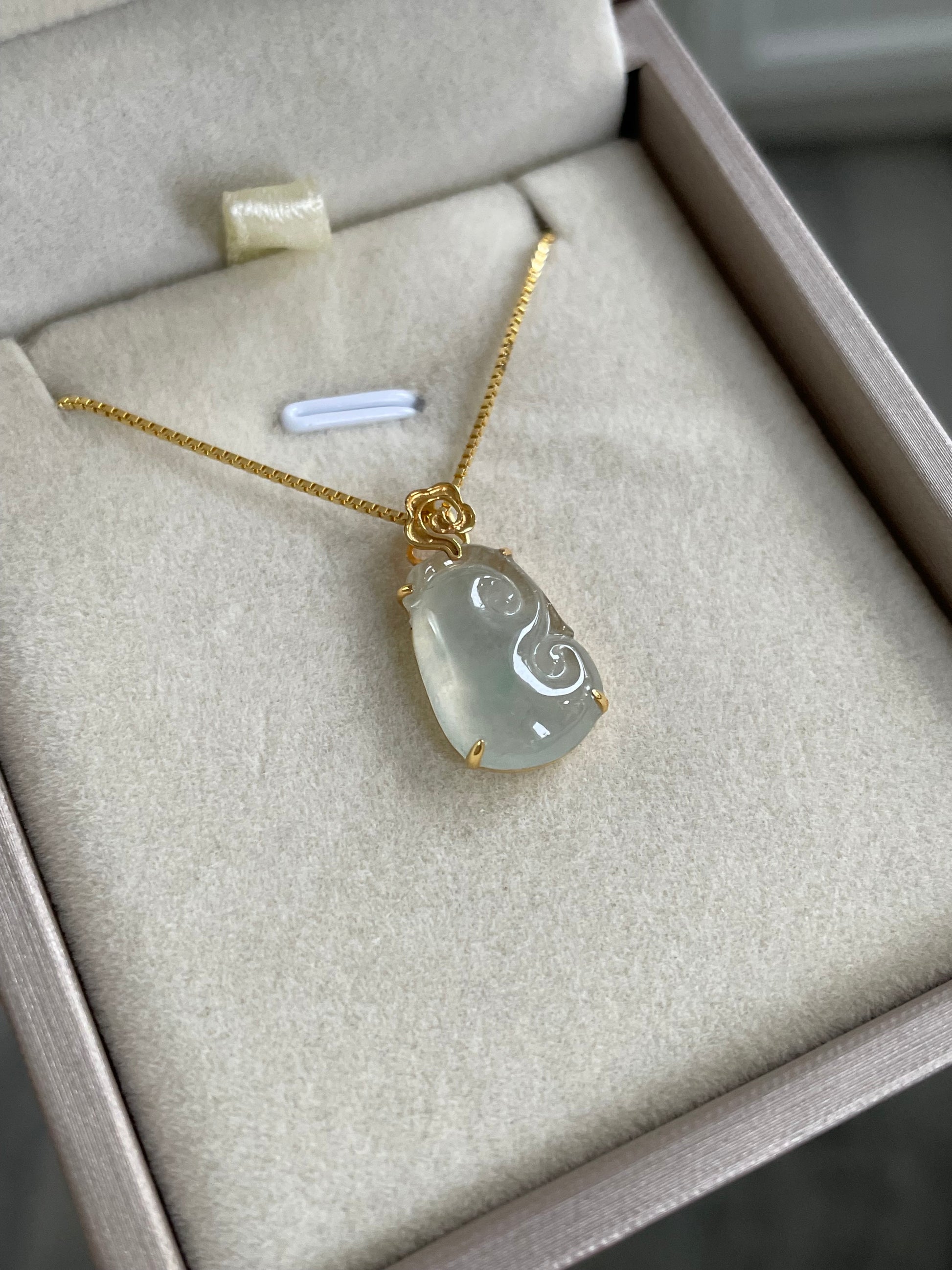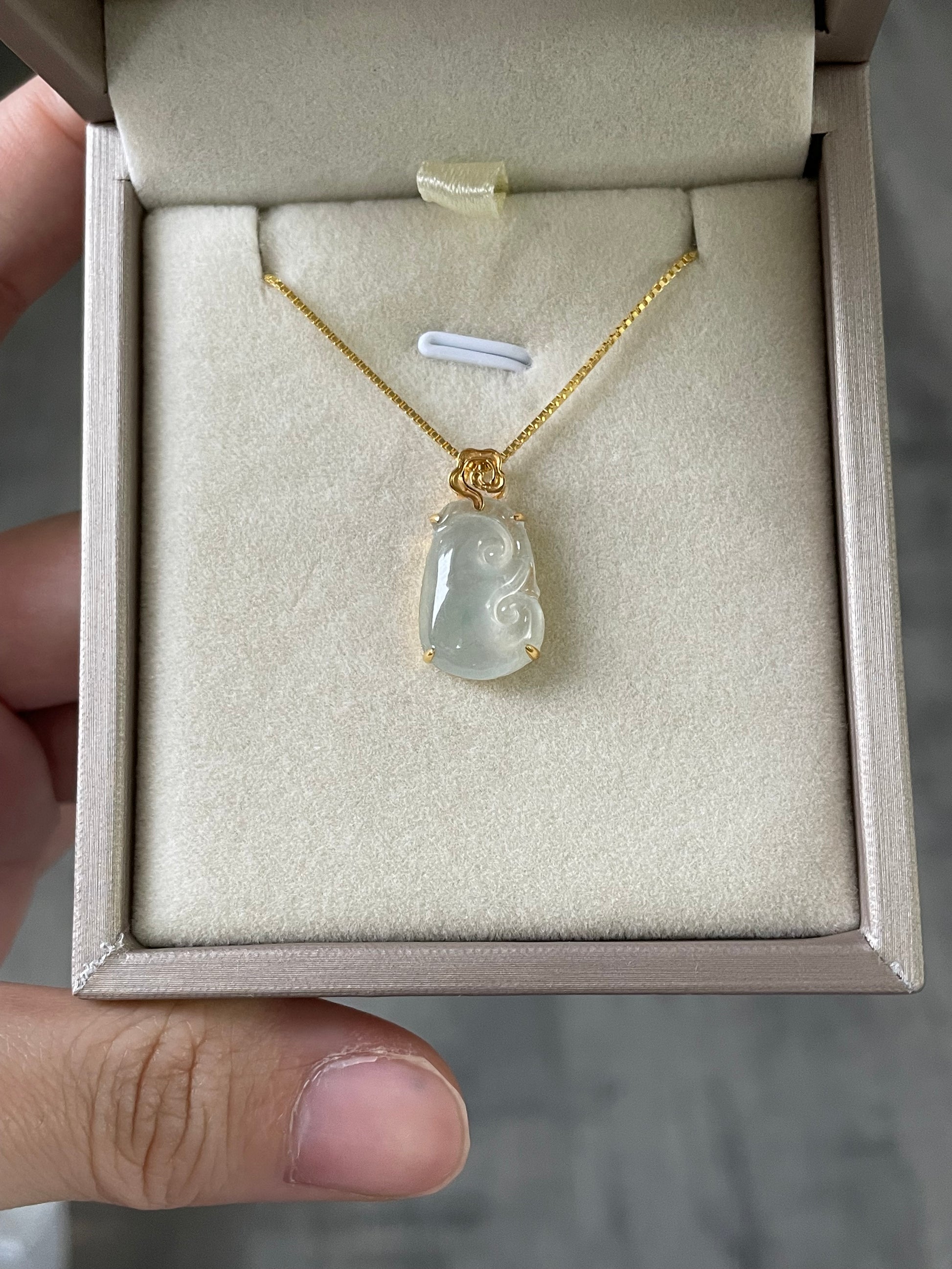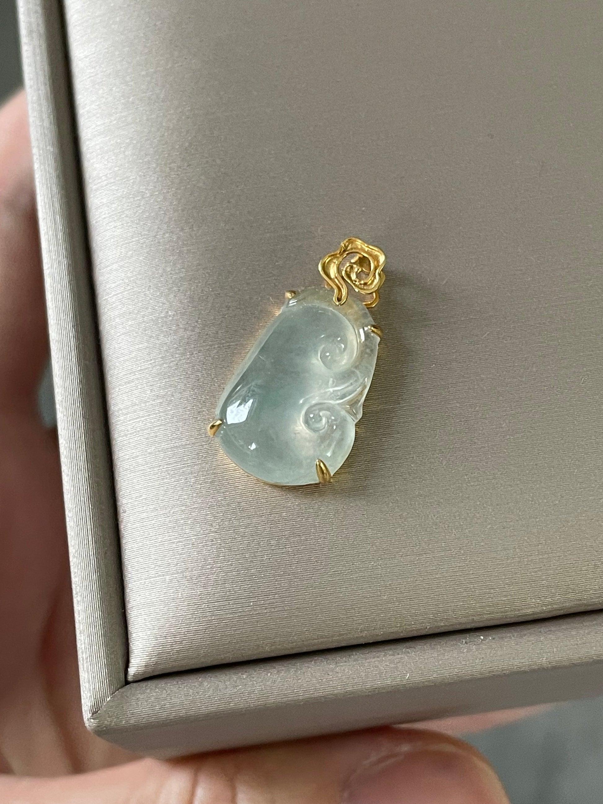 正冰高冰种水翡翠如意,起莹起光,高冰起寒光;雕刻线条流畅,卷云纹刻画细腻,如意饱满圆润;18k金镶嵌祥云扣头,整体有寓意“吉祥如意,事事顺遂‘的寓意。