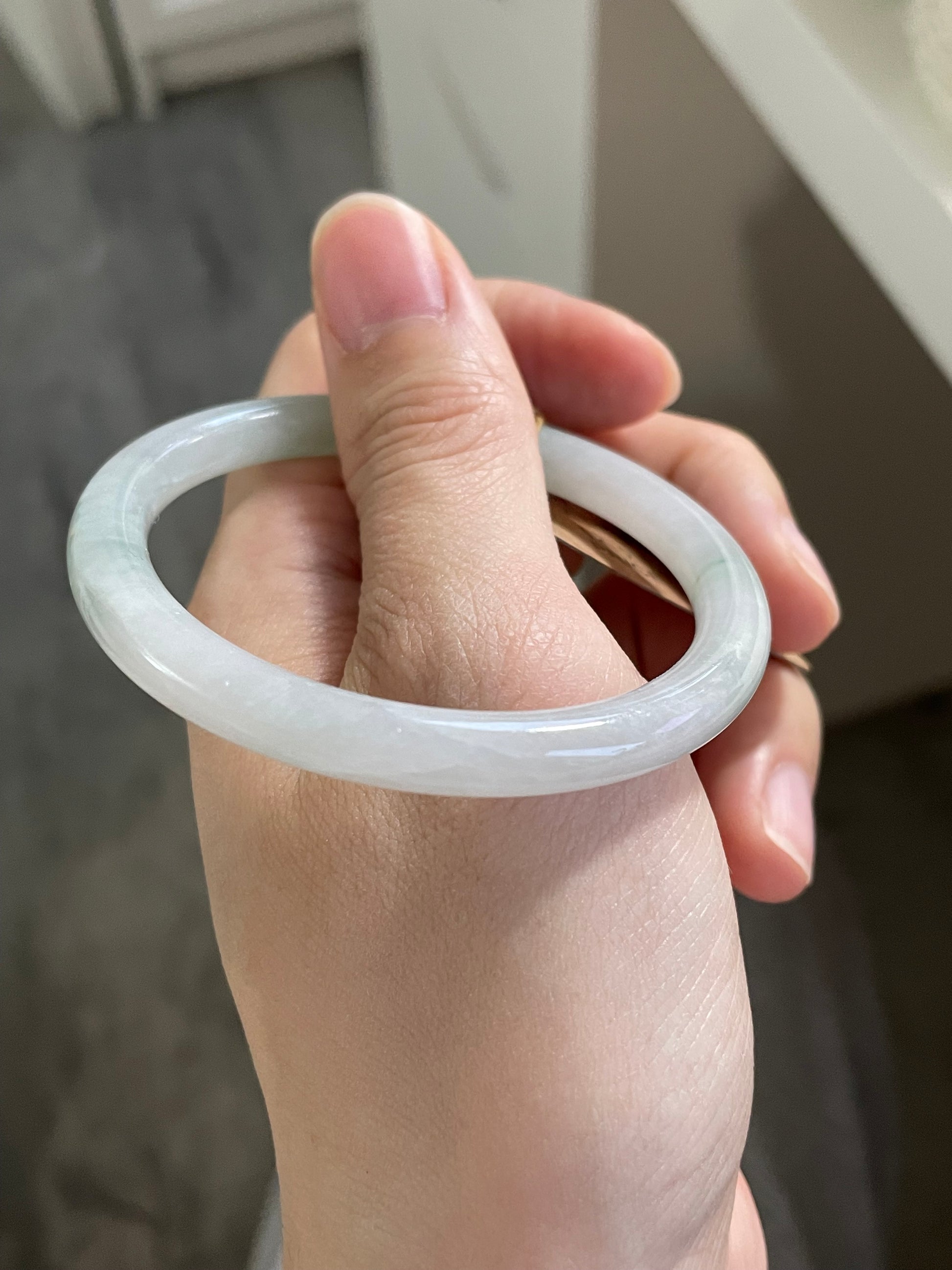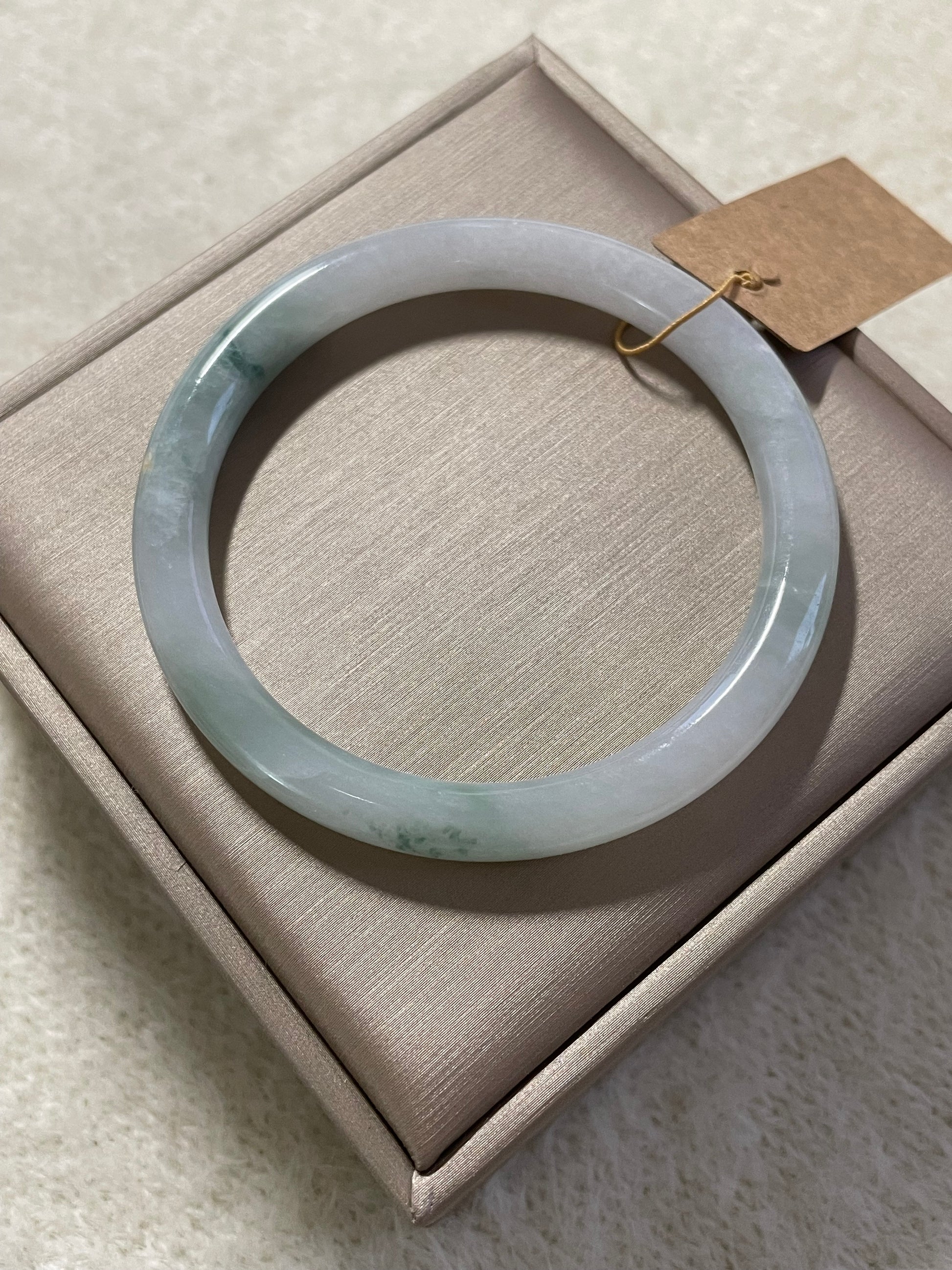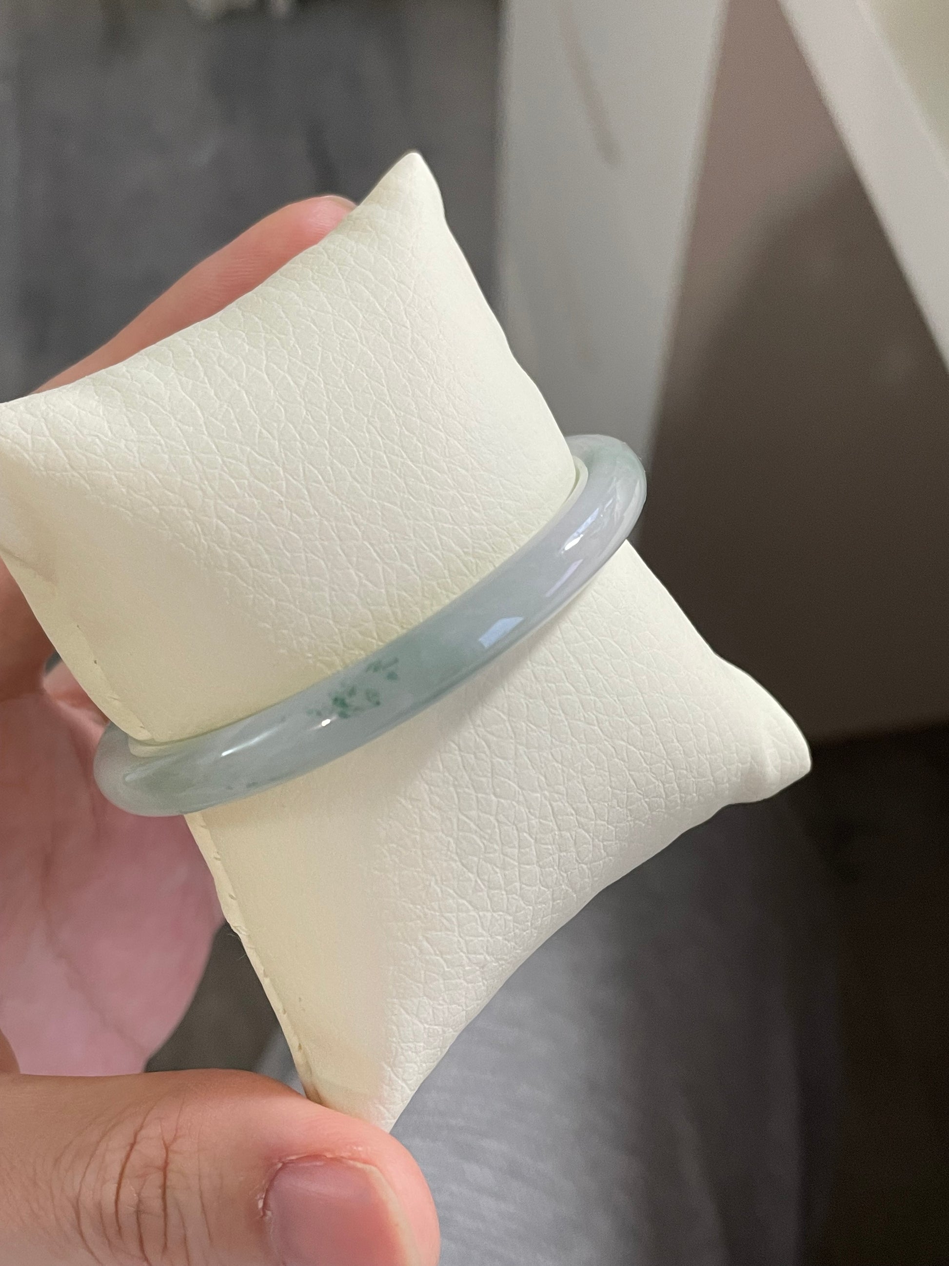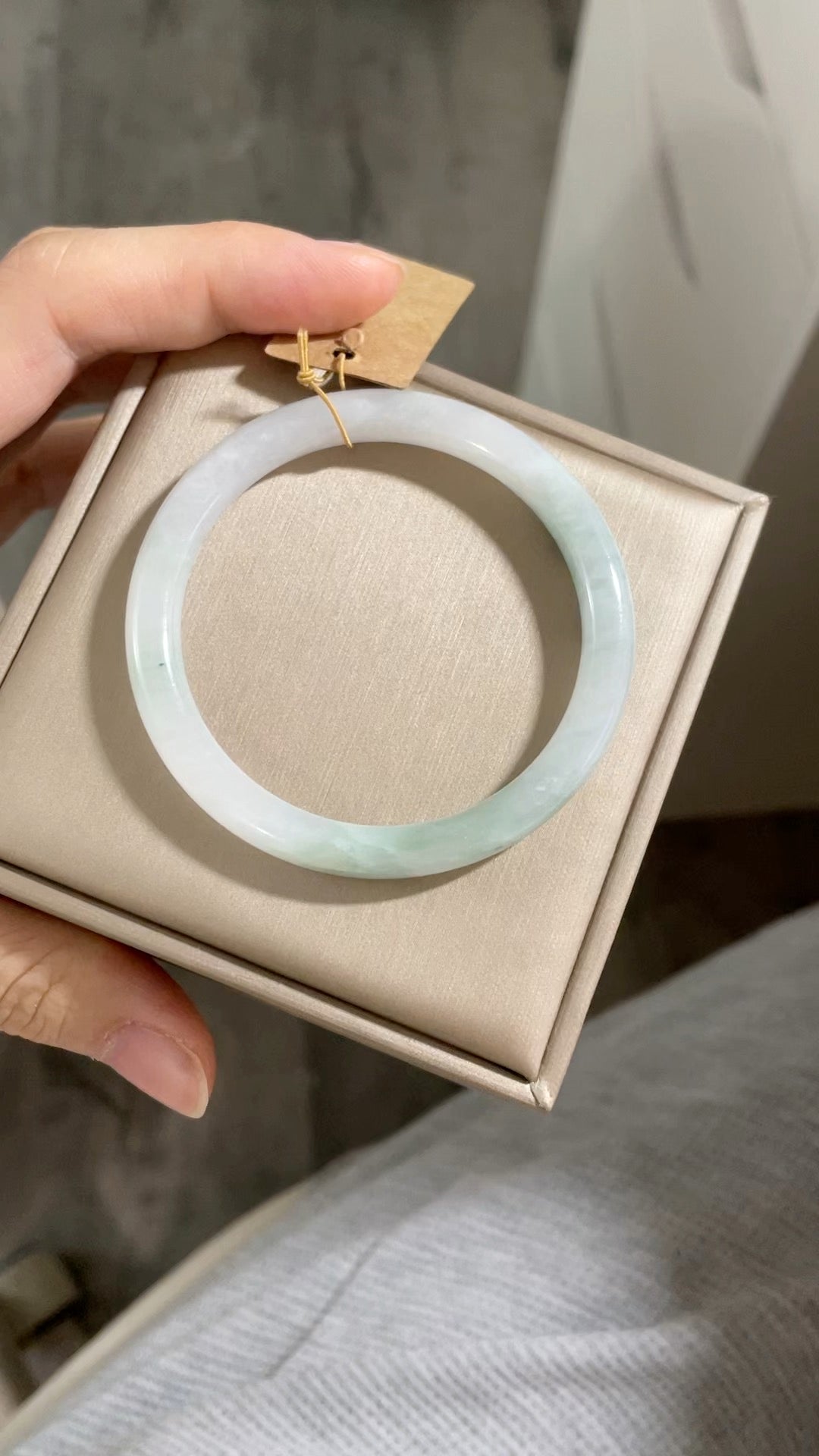天然缅甸翡翠手镯,冰透水润,淡淡的绿底,清爽柔和。尺寸为 52.5mm,条宽约 6.5mm,厚度约 6.5mm。