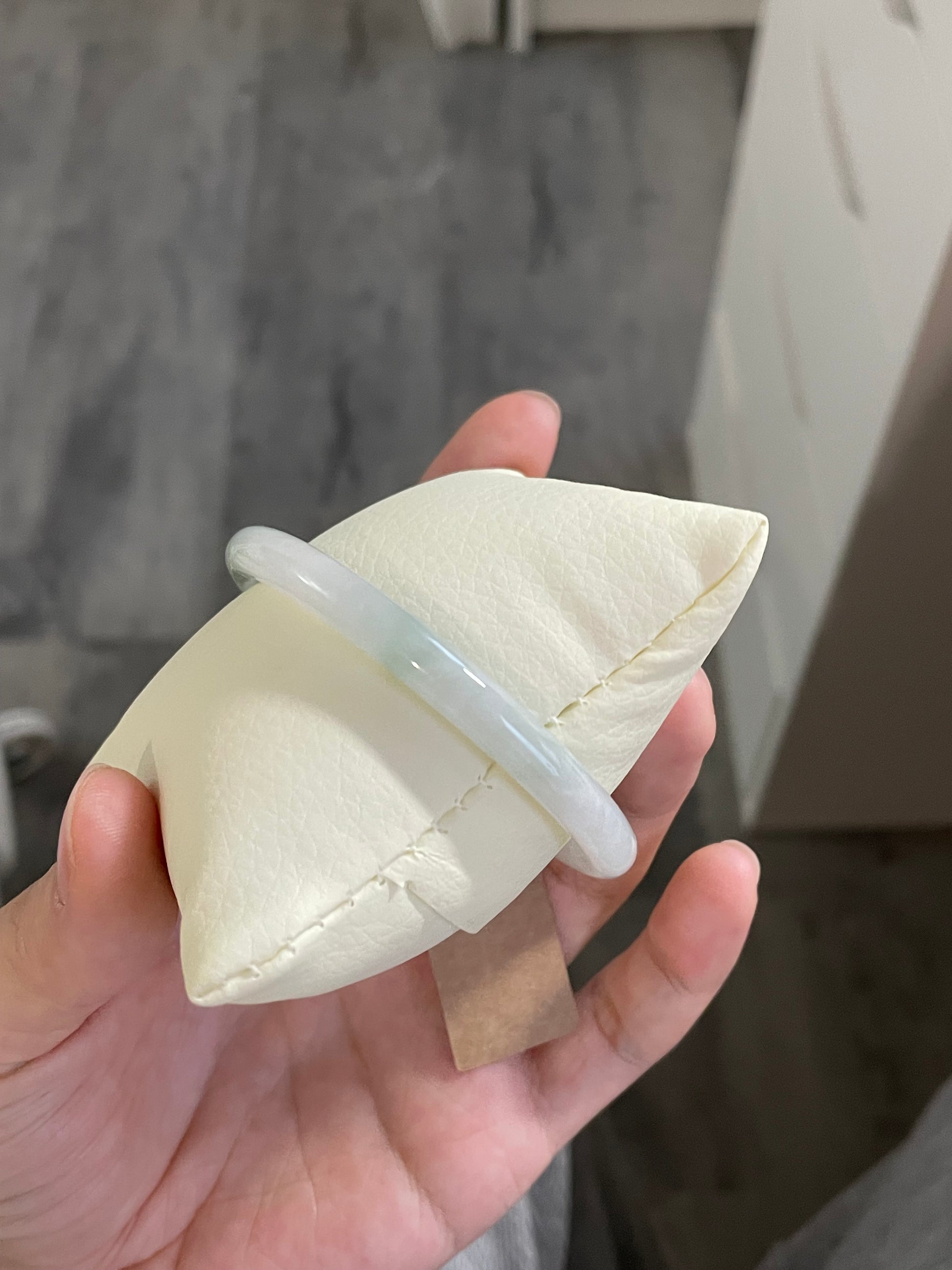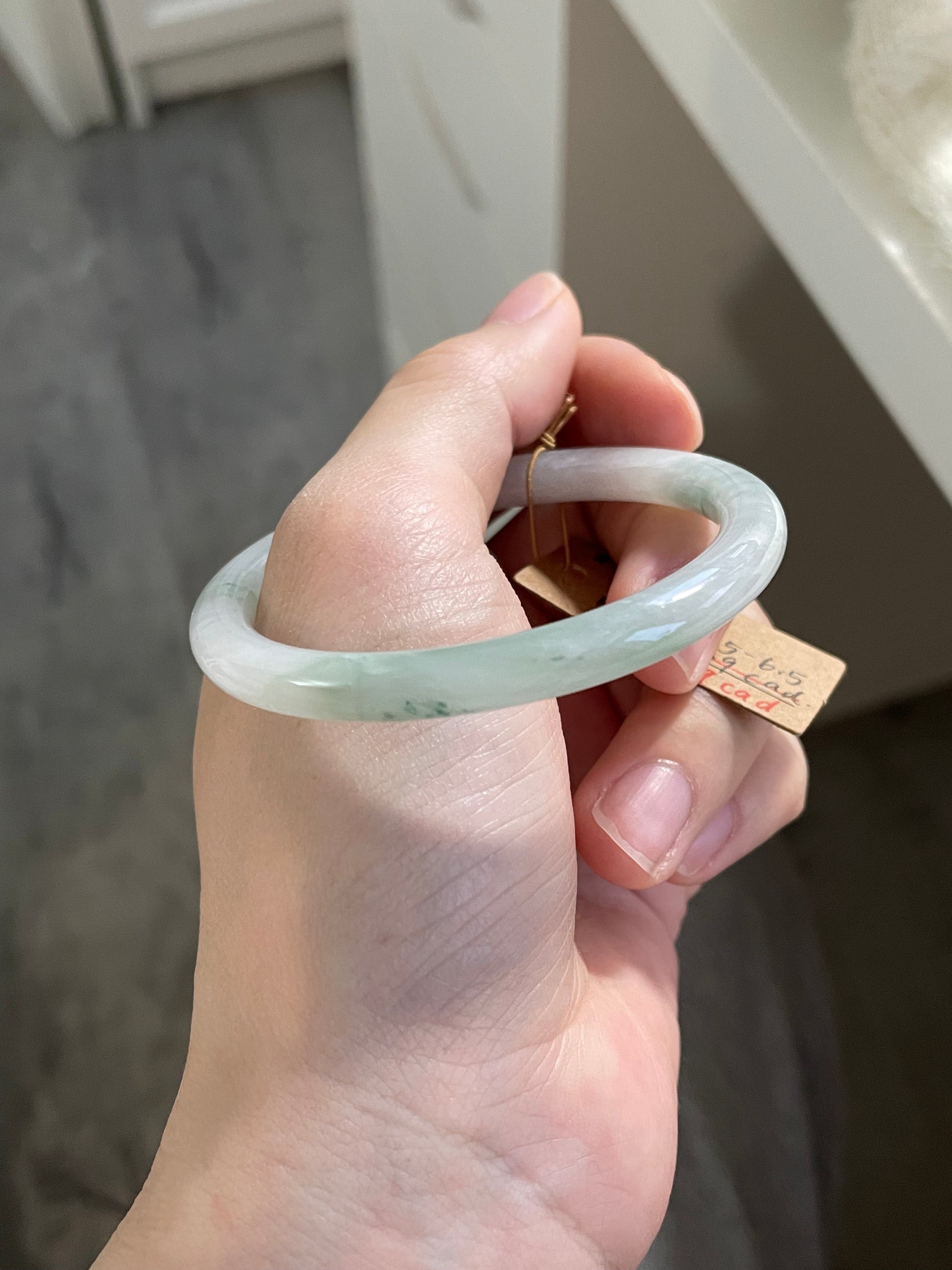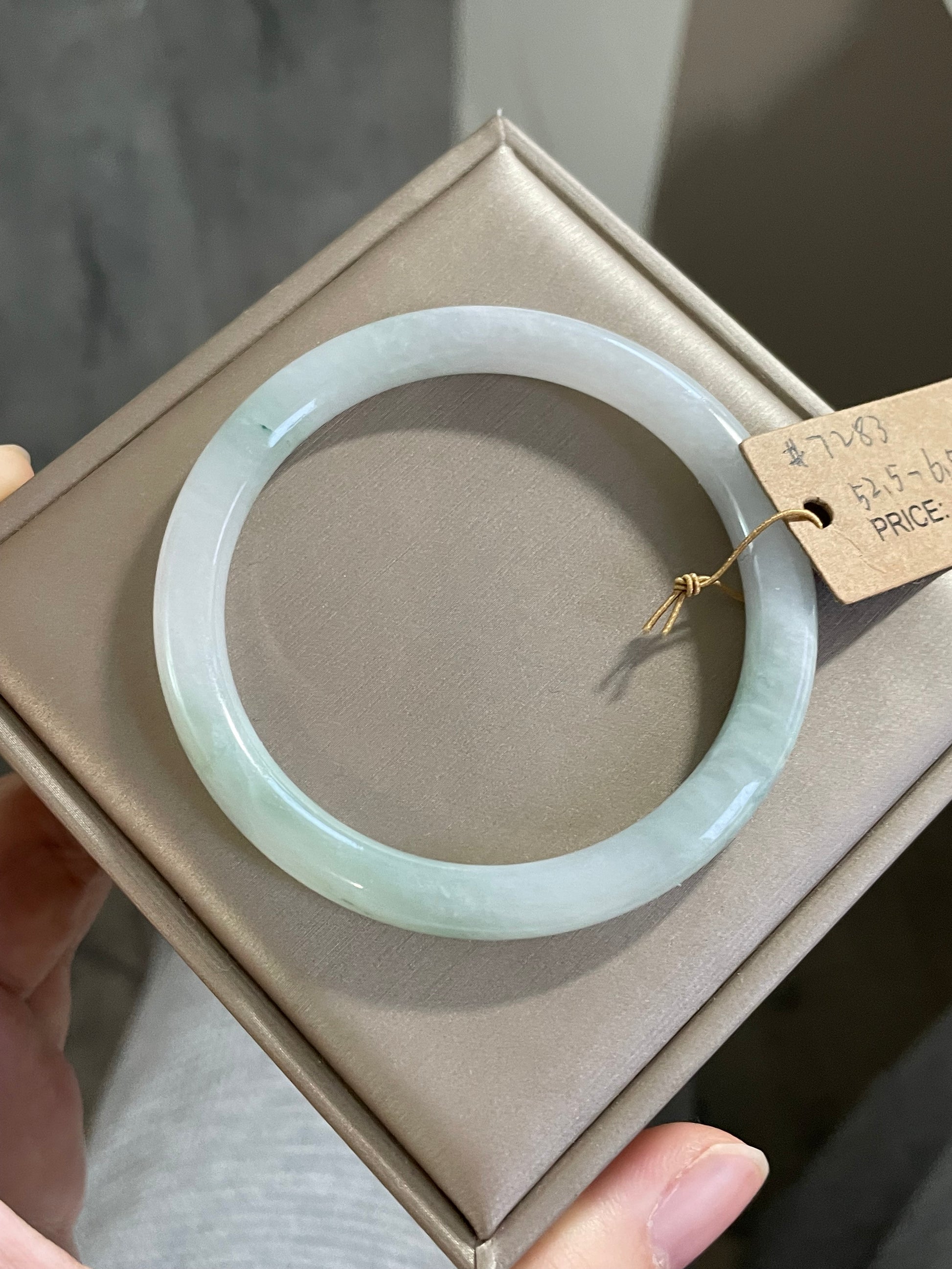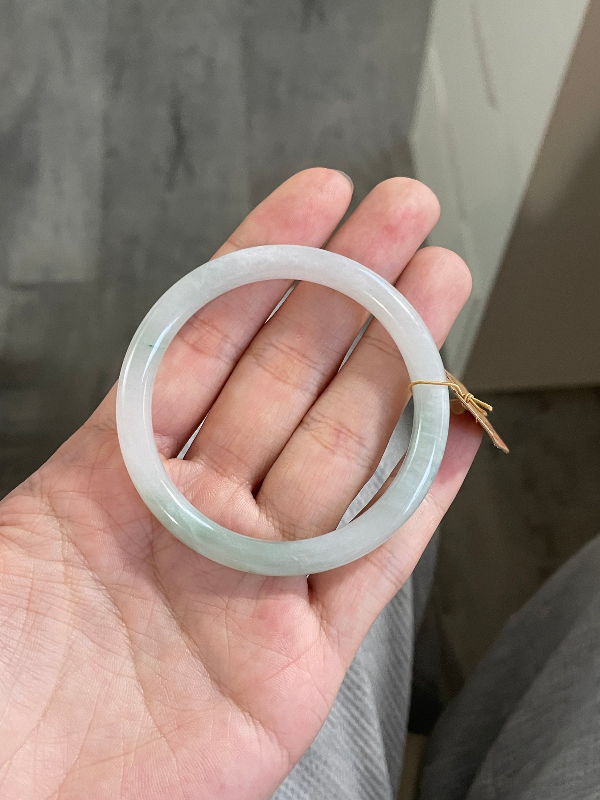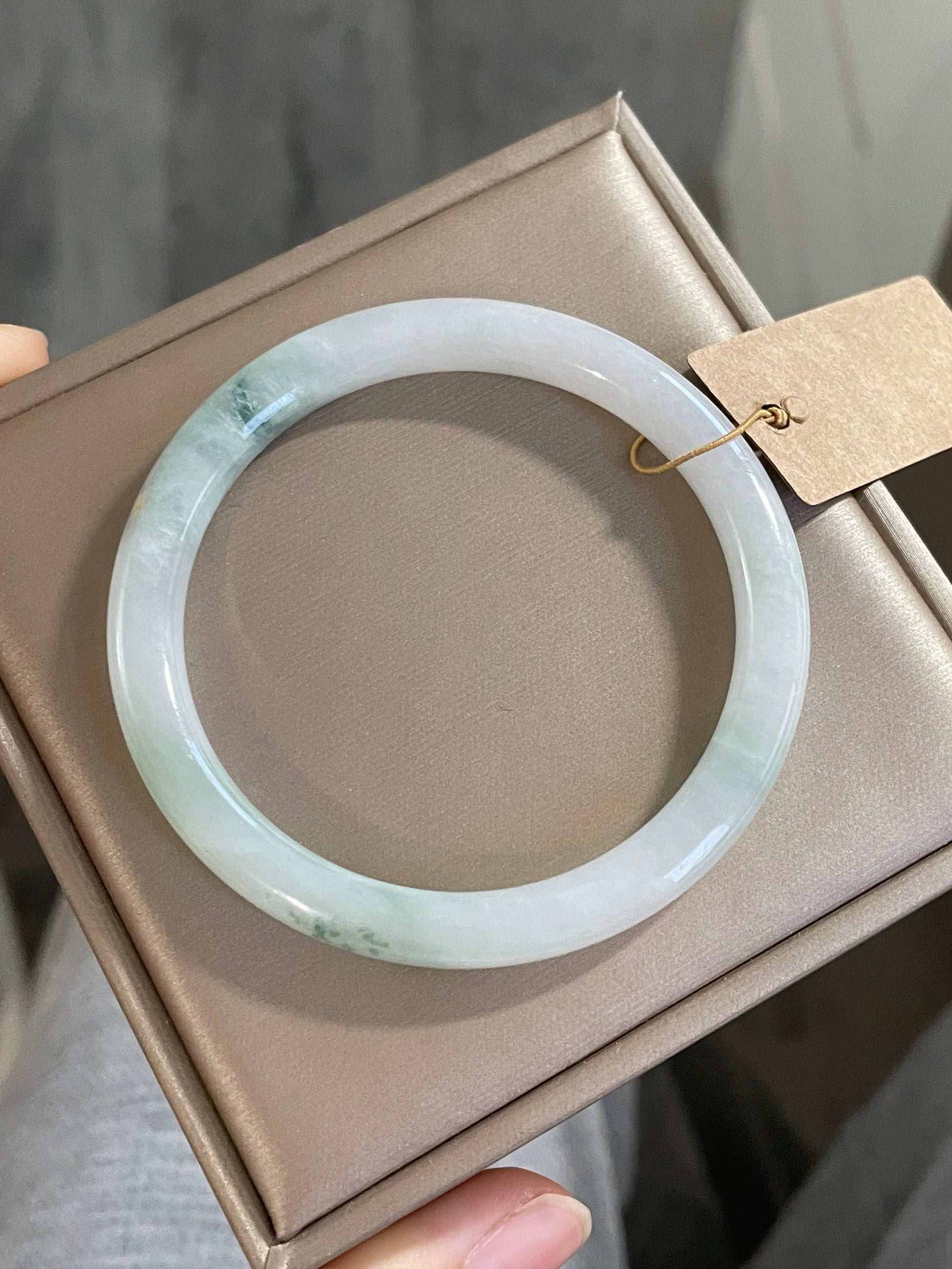 天然缅甸翡翠手镯,冰透水润,淡淡的绿底,清爽柔和。尺寸为 52.5mm,条宽约 6.5mm,厚度约 6.5mm。
