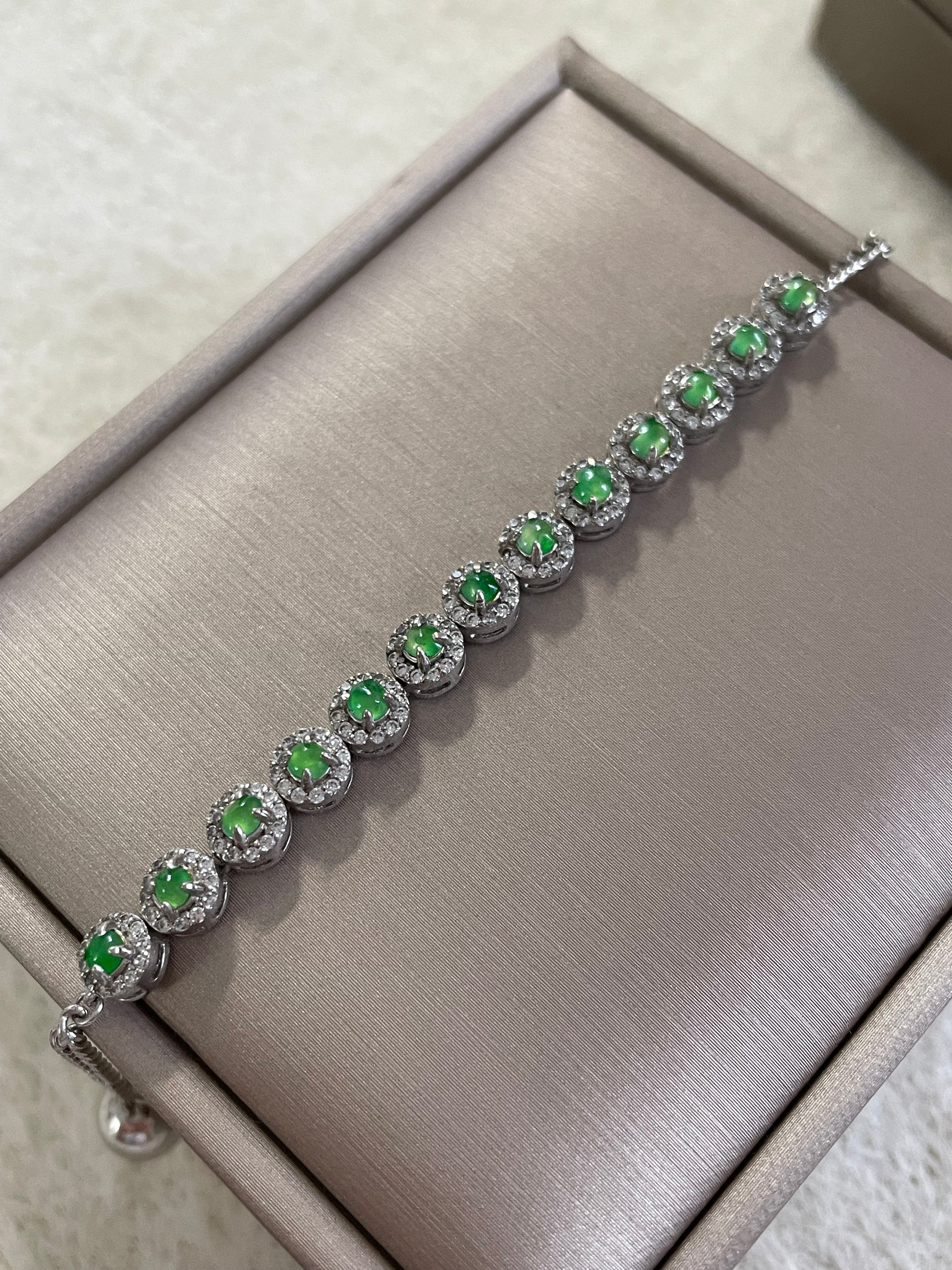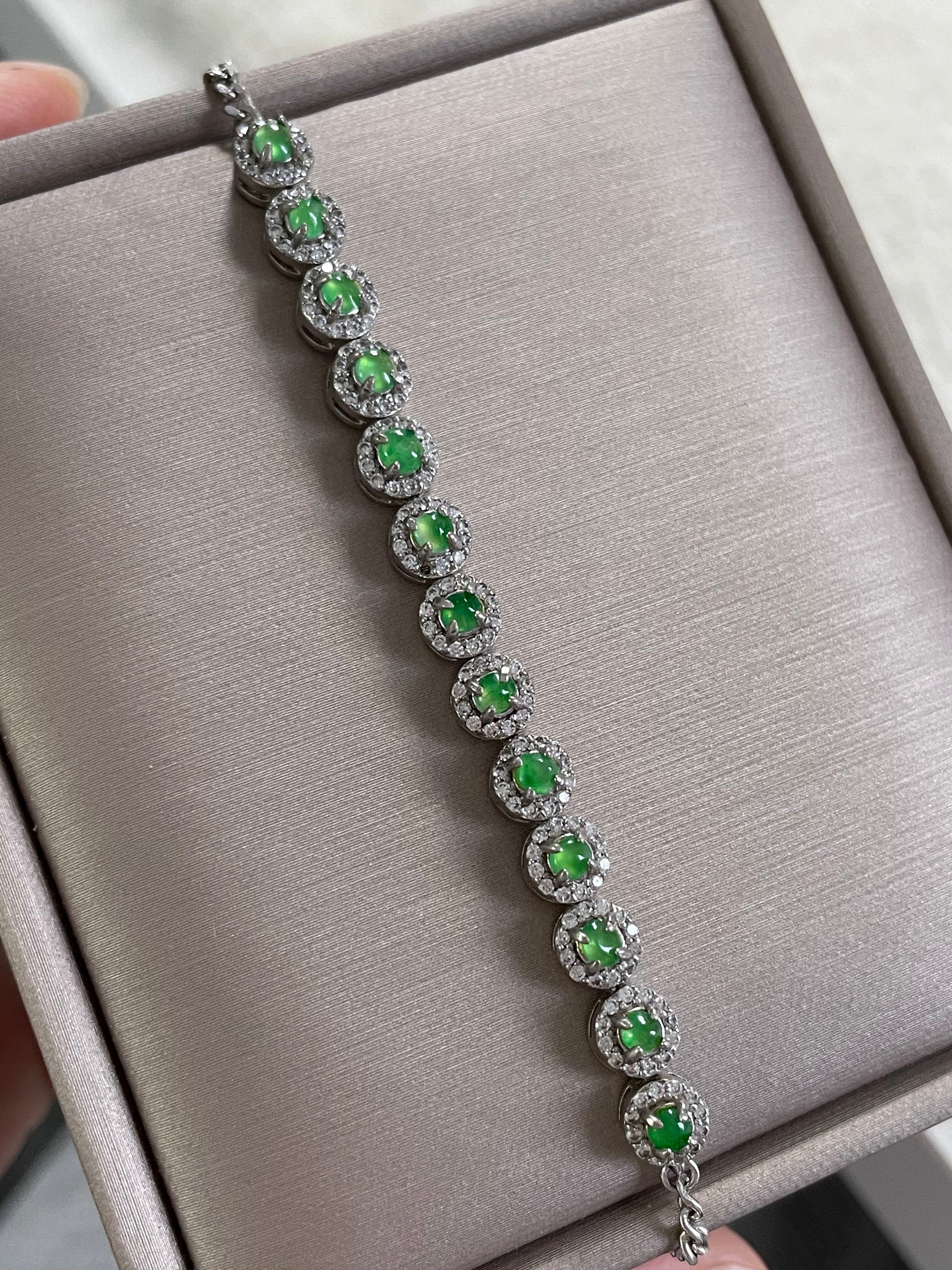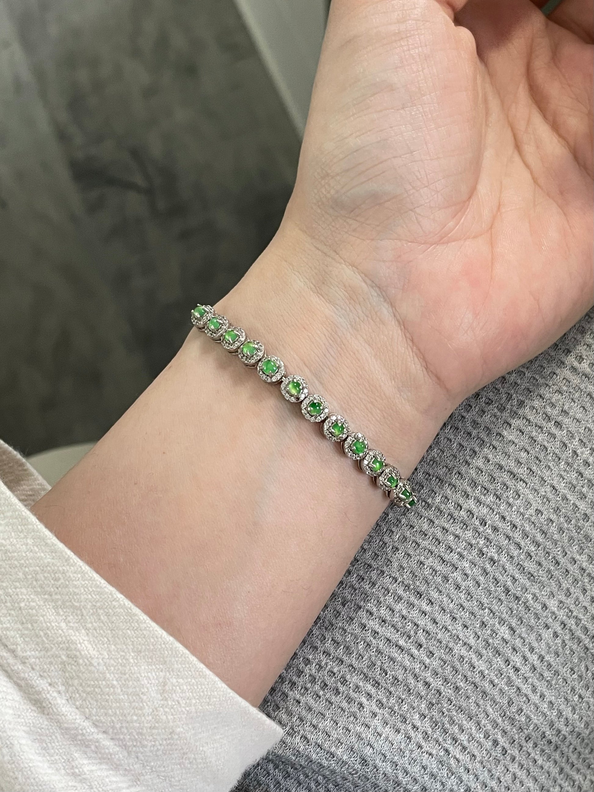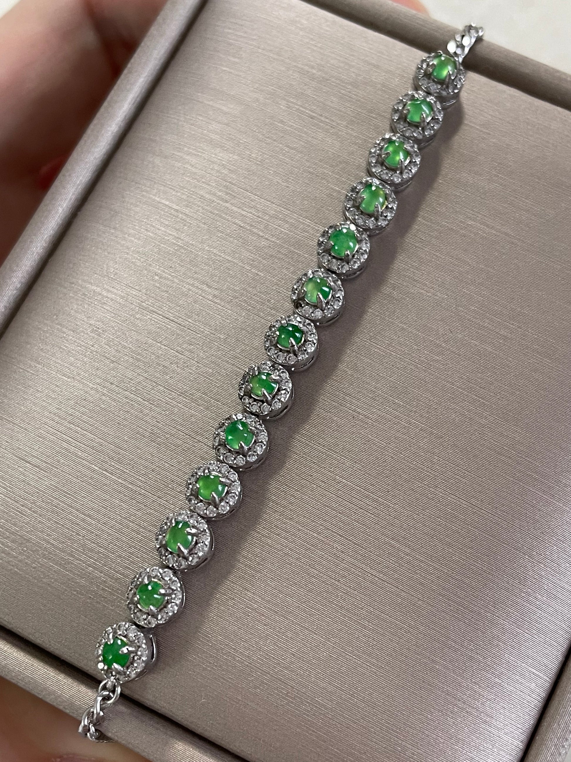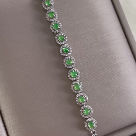 手链由多颗阳绿色翡翠蛋面组成,颗颗底色清爽通透,圆润饱满,色泽明亮。每一颗主石均以925银镶嵌锆石,经典简单款,佩戴后显得手腕干净又显气质。