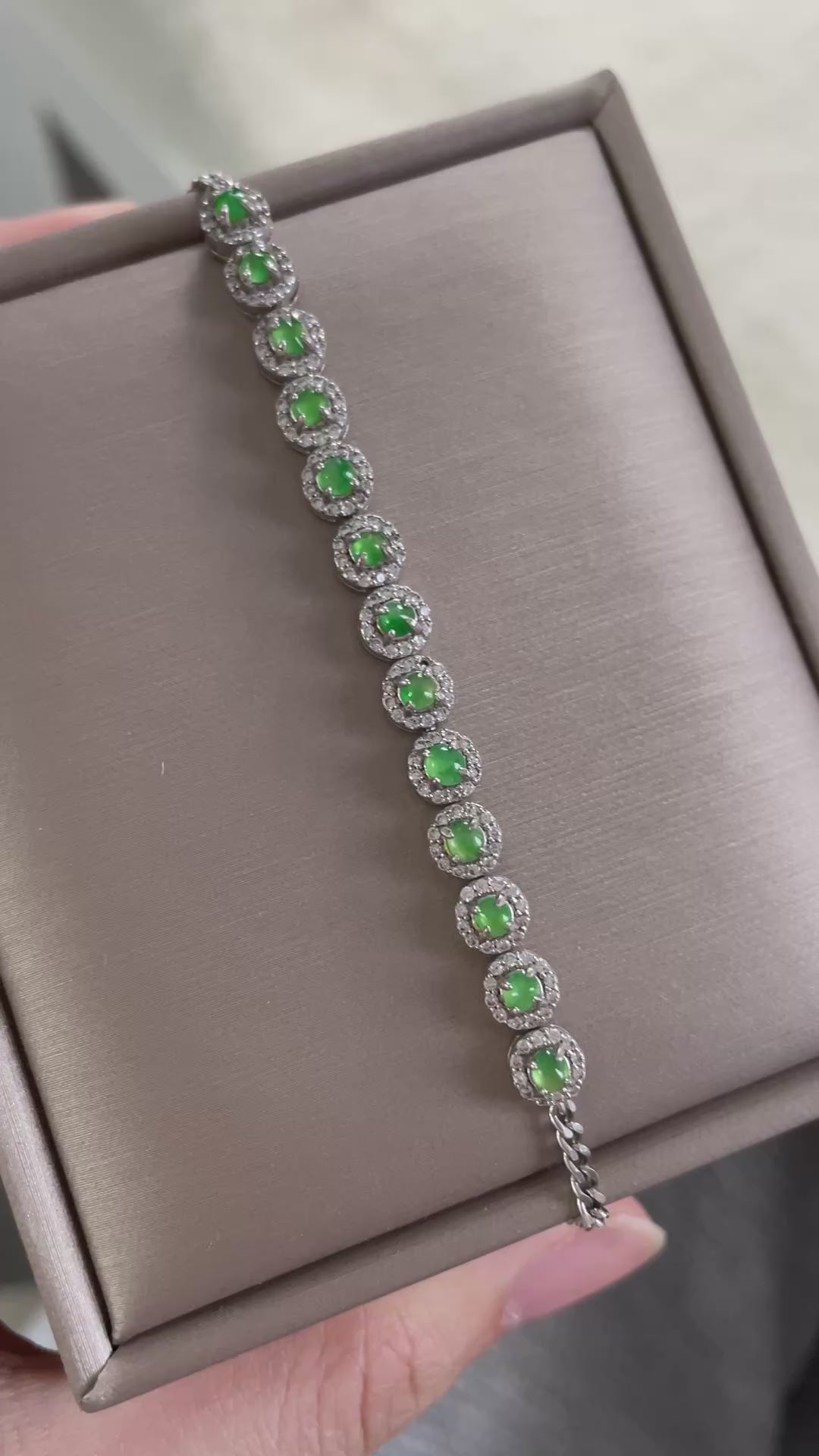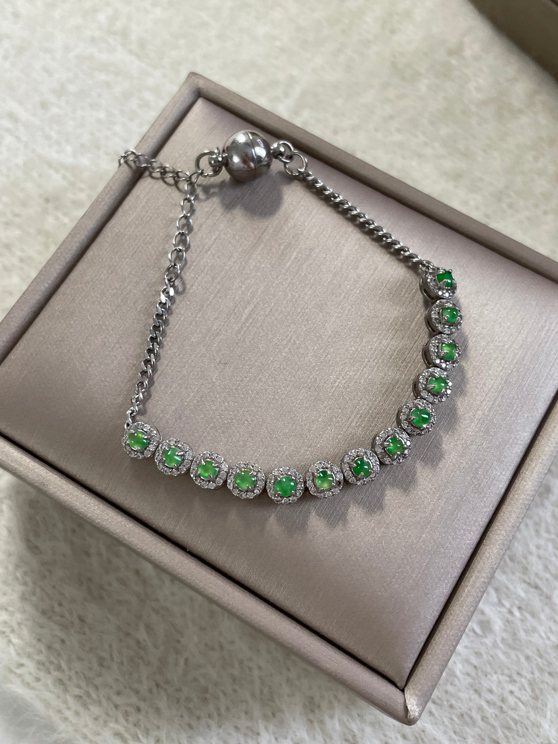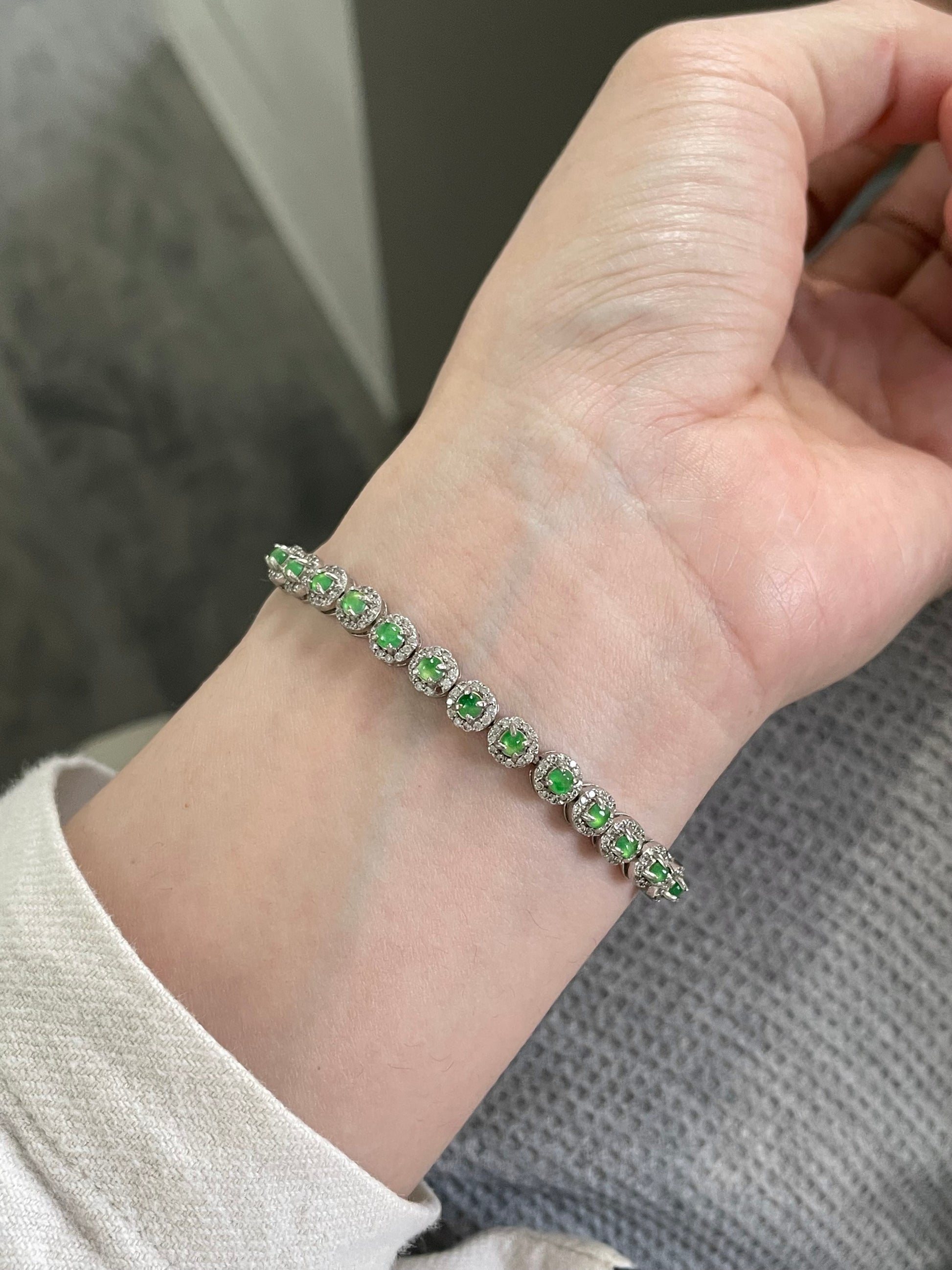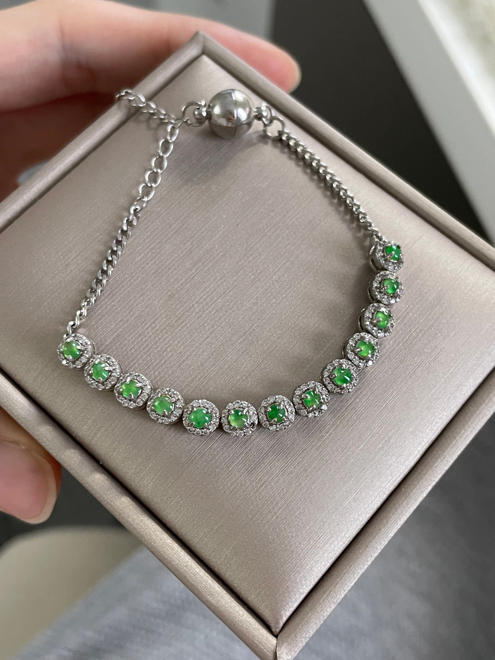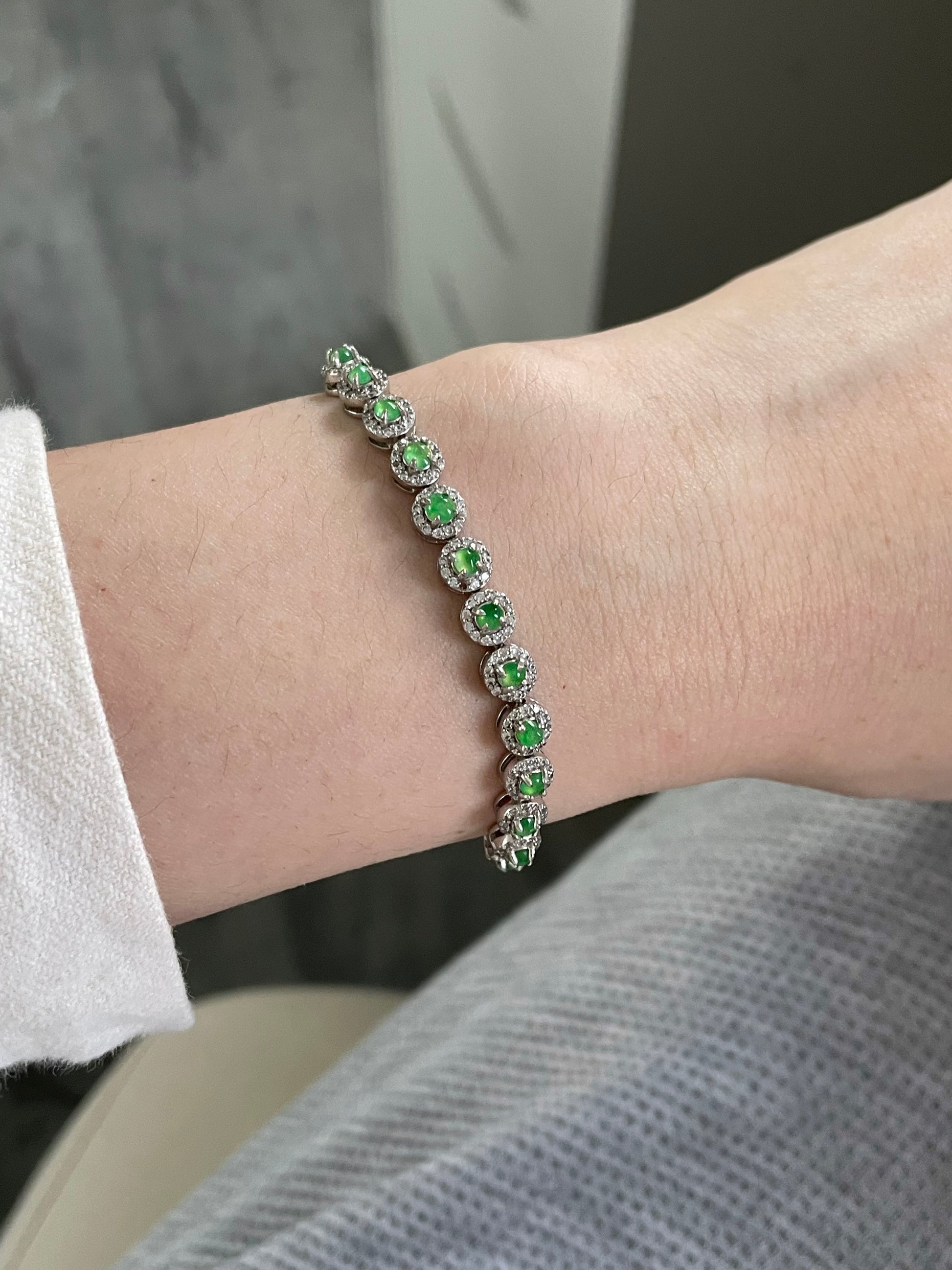 手链由多颗阳绿色翡翠蛋面组成,颗颗底色清爽通透,圆润饱满,色泽明亮。每一颗主石均以925银镶嵌锆石,经典简单款,佩戴后显得手腕干净又显气质。