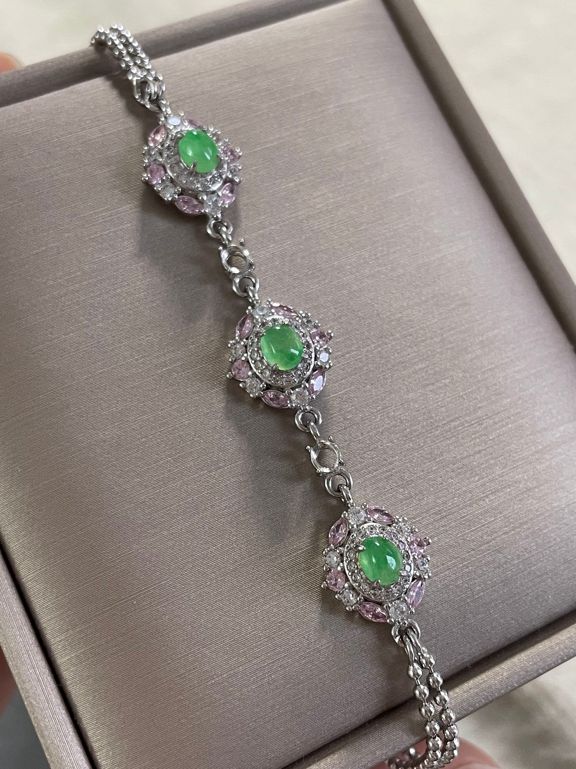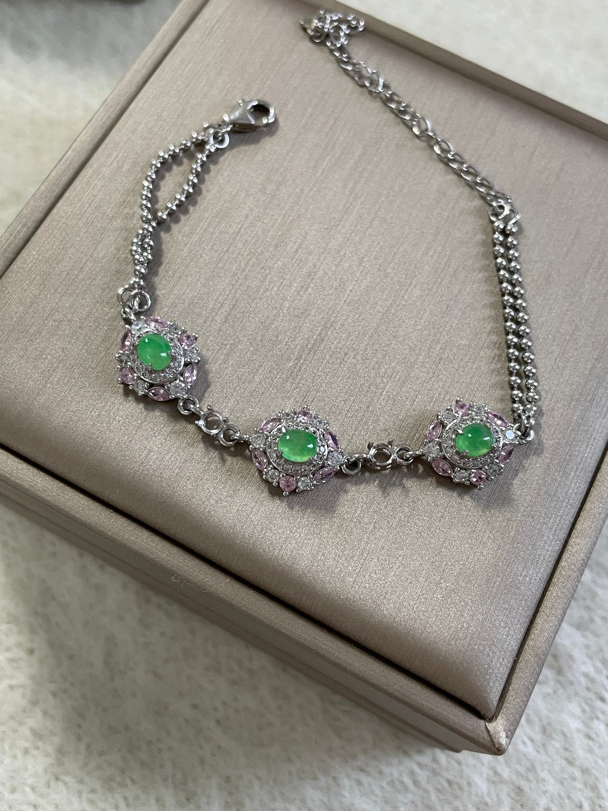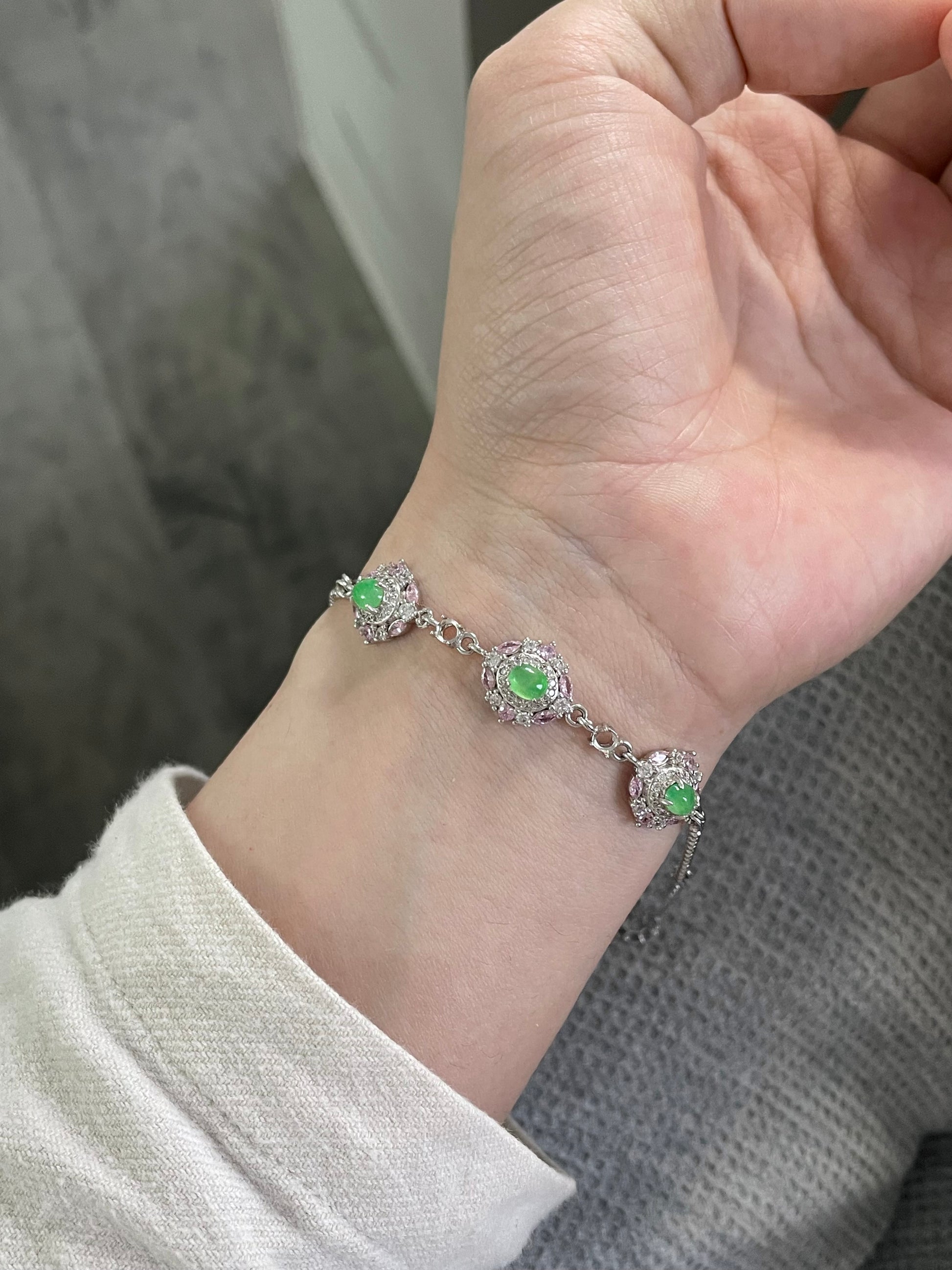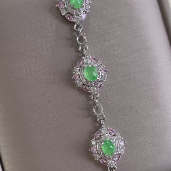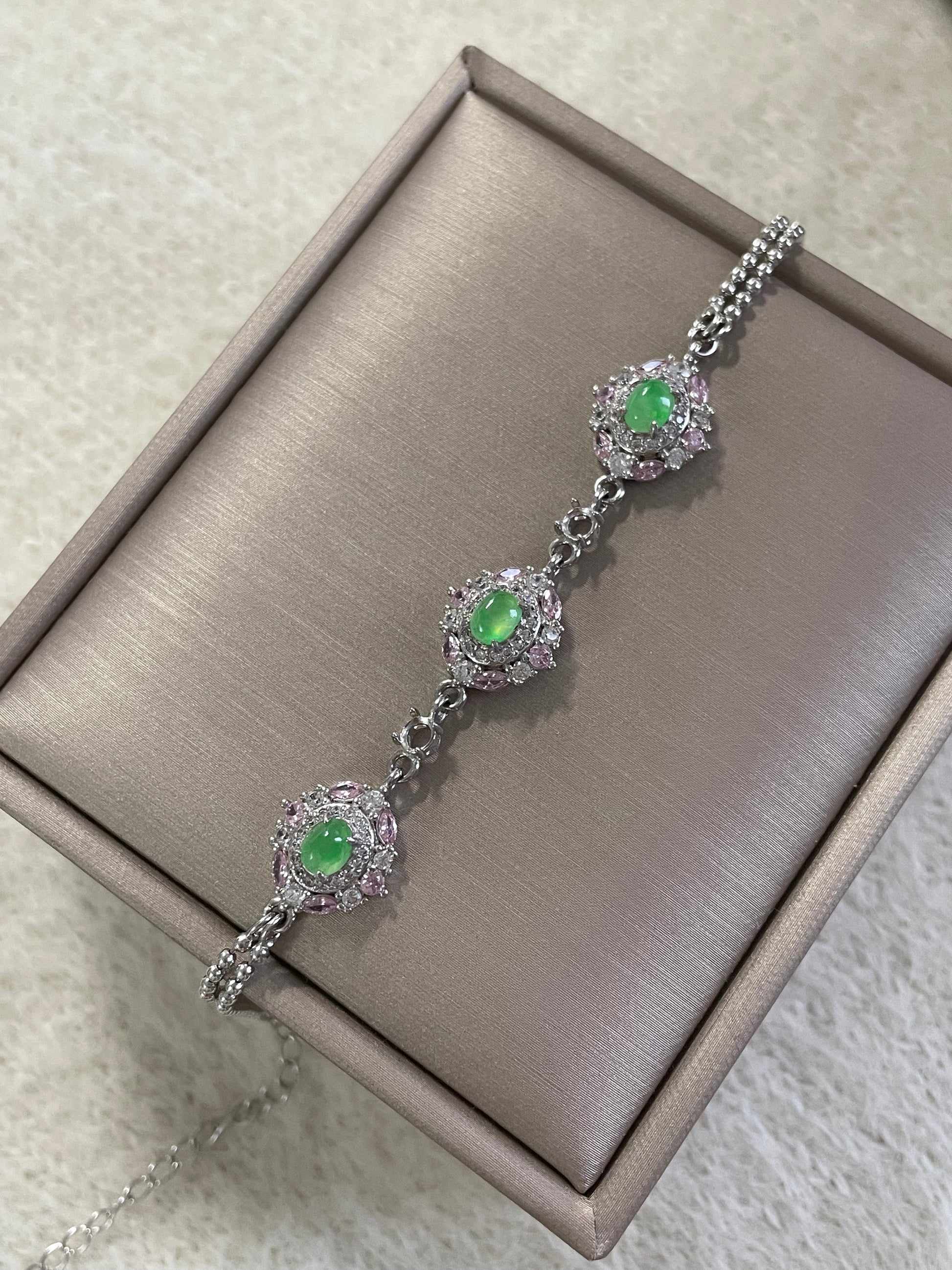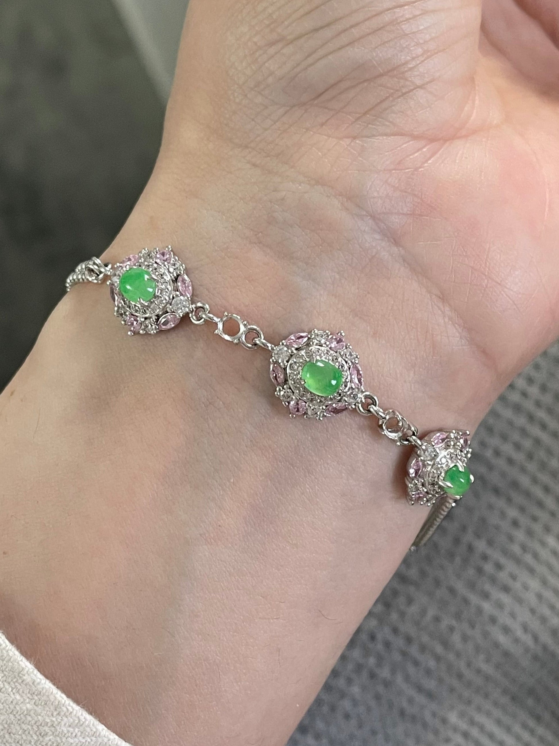 手链以多颗甜阳绿色翡翠为主石,色泽明亮清爽,光感十足。每一颗主石周围镶有粉色与白色小颗粒宝石,花簇般的组合让整体呈现亮眼的层次感,上手显得精致亮眼,日常或小正式场合都很好搭配。