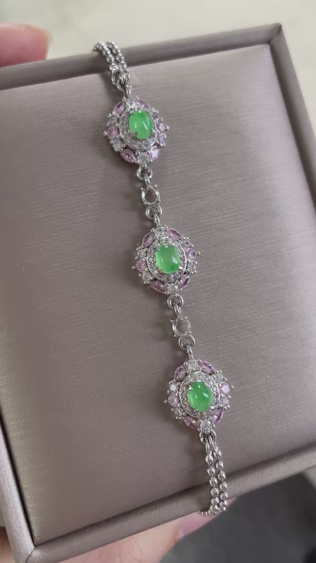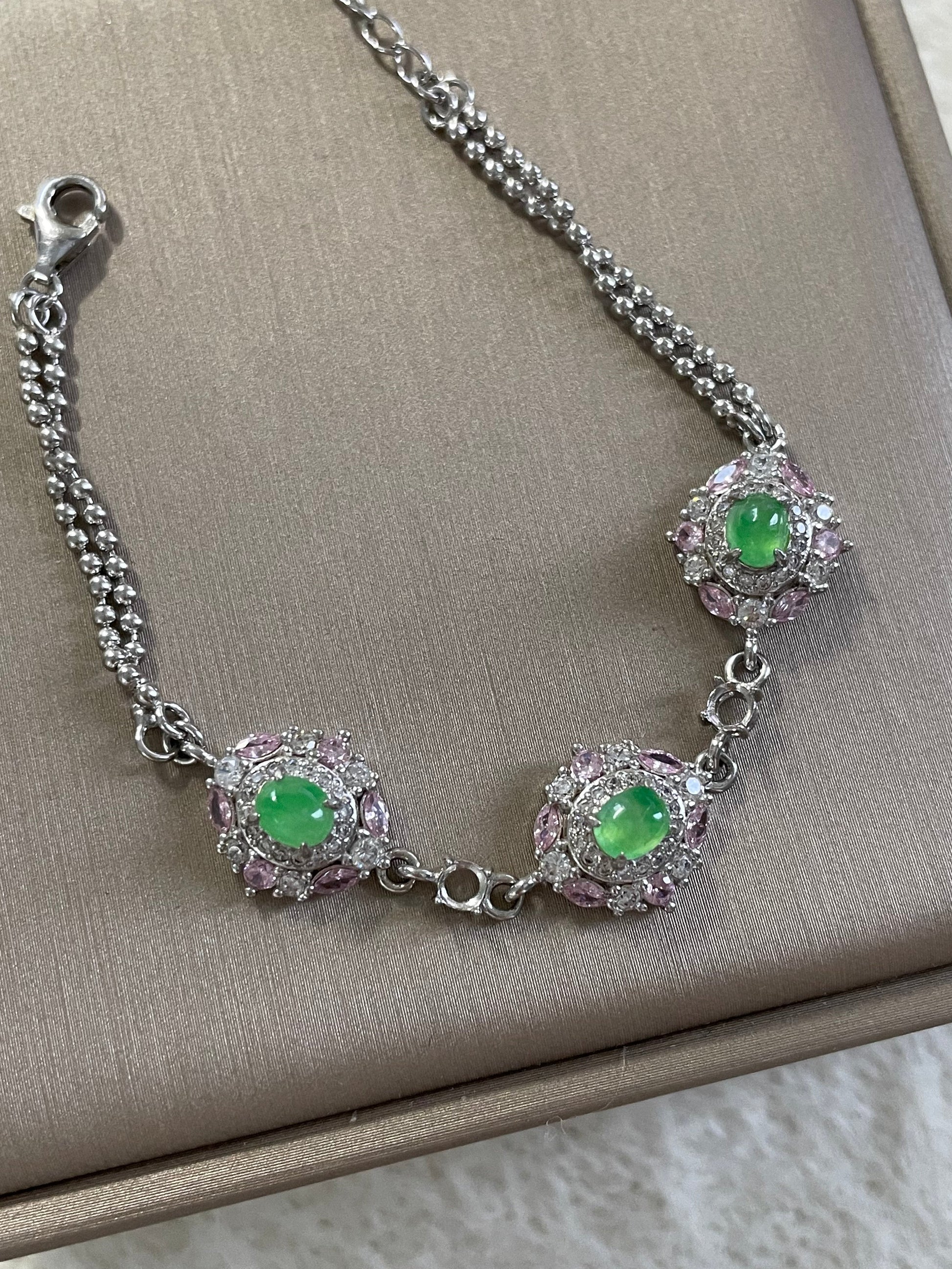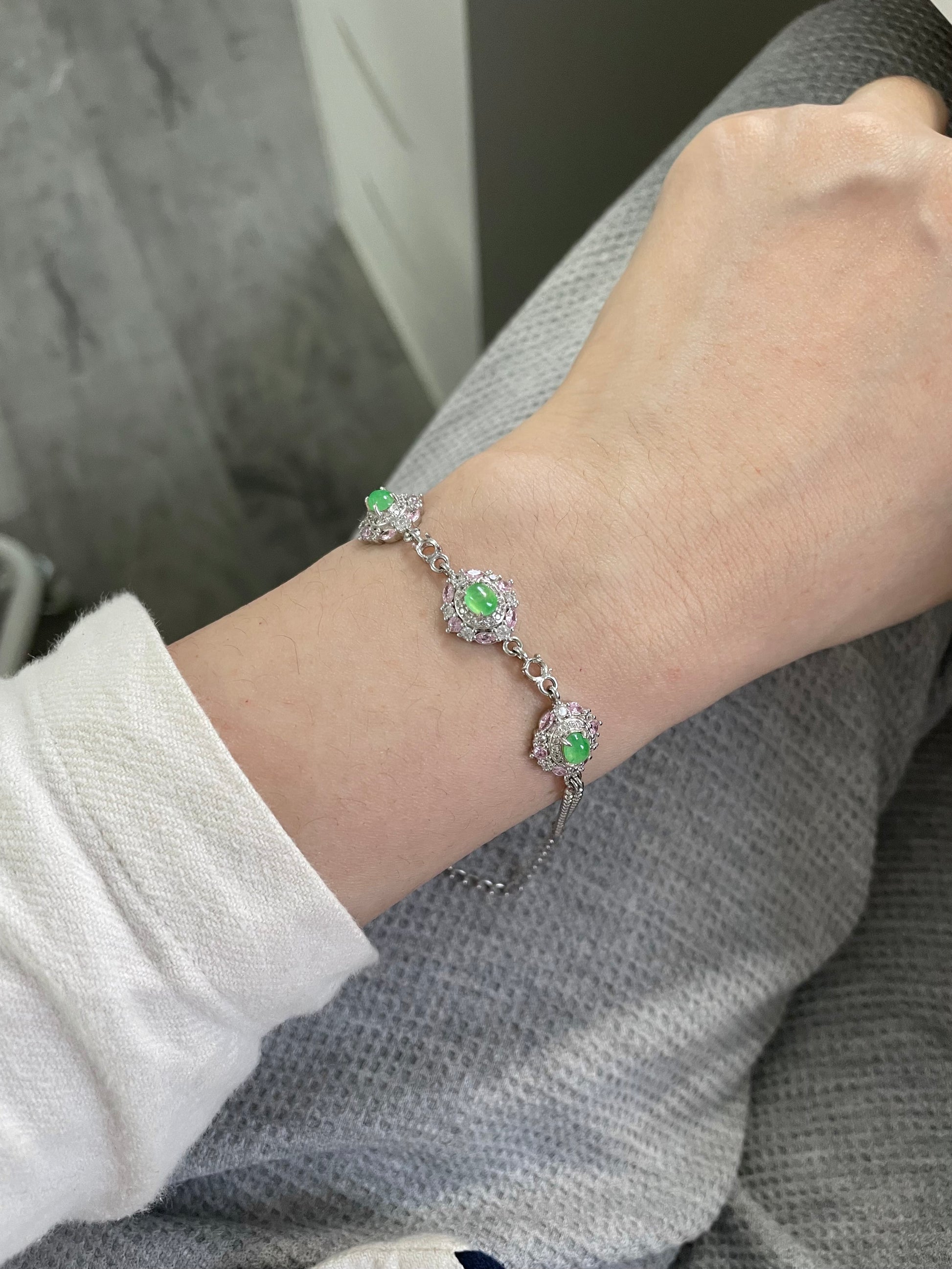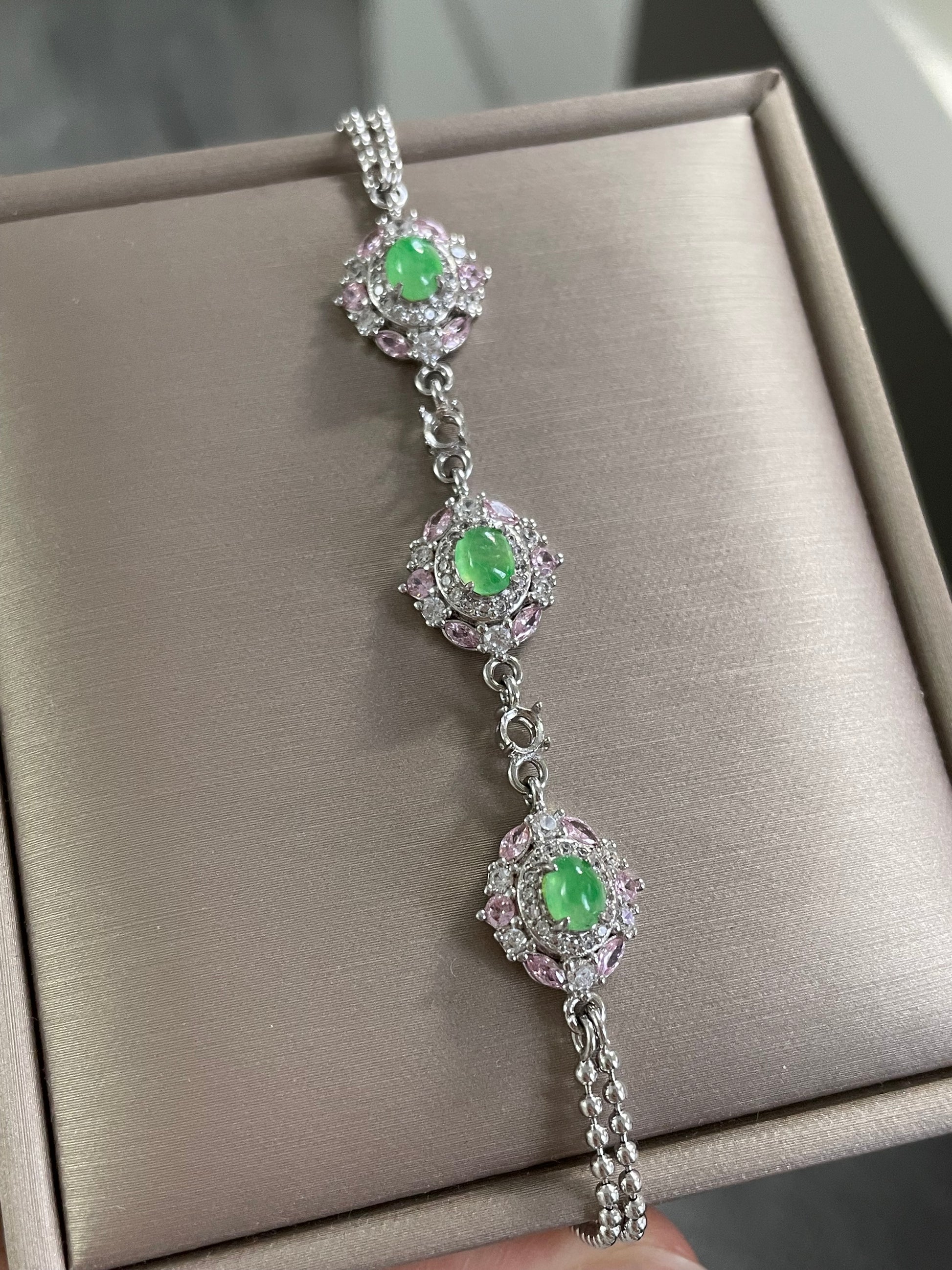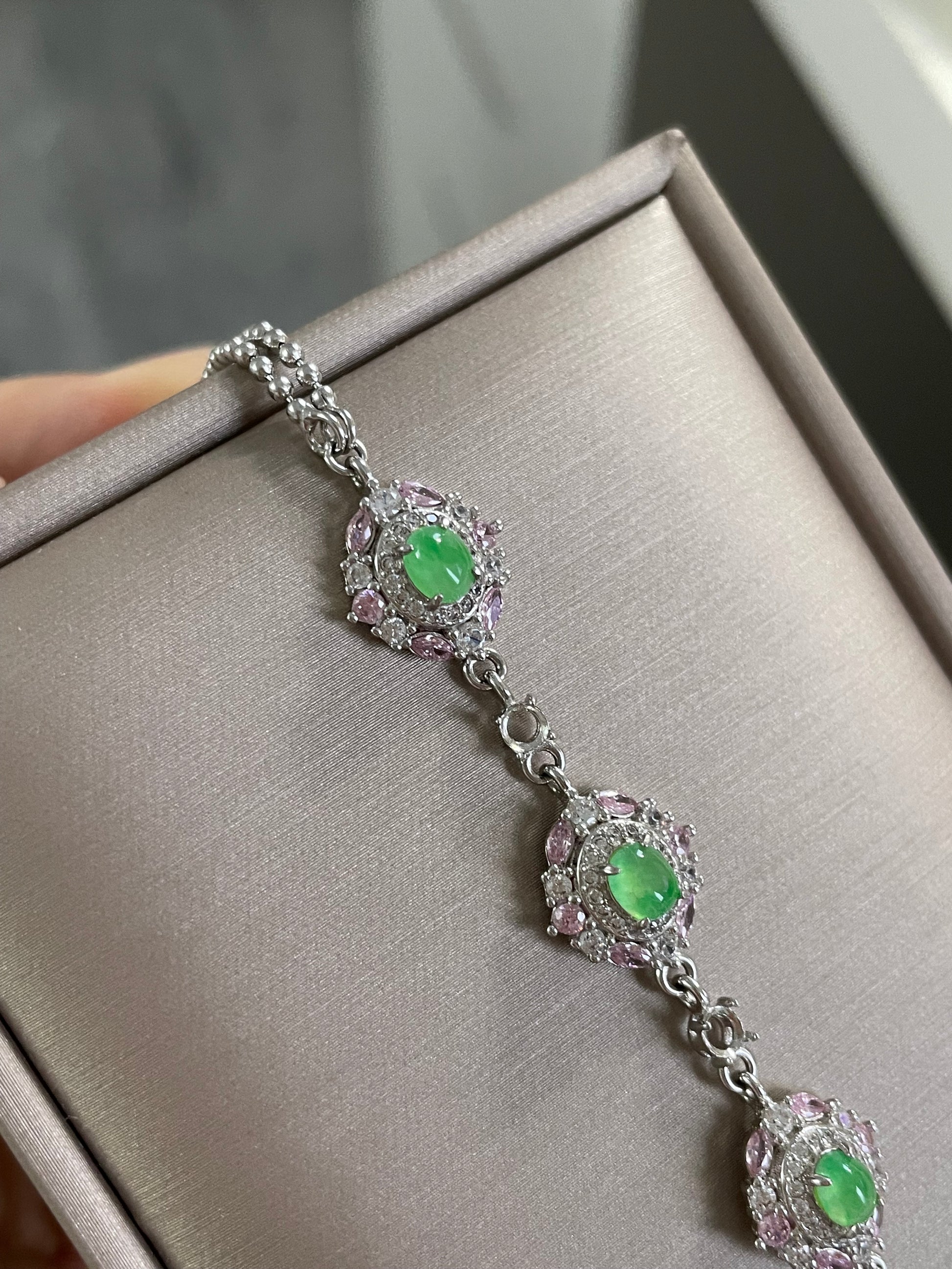 手链以多颗甜阳绿色翡翠为主石,色泽明亮清爽,光感十足。每一颗主石周围镶有粉色与白色小颗粒宝石,花簇般的组合让整体呈现亮眼的层次感,上手显得精致亮眼,日常或小正式场合都很好搭配。