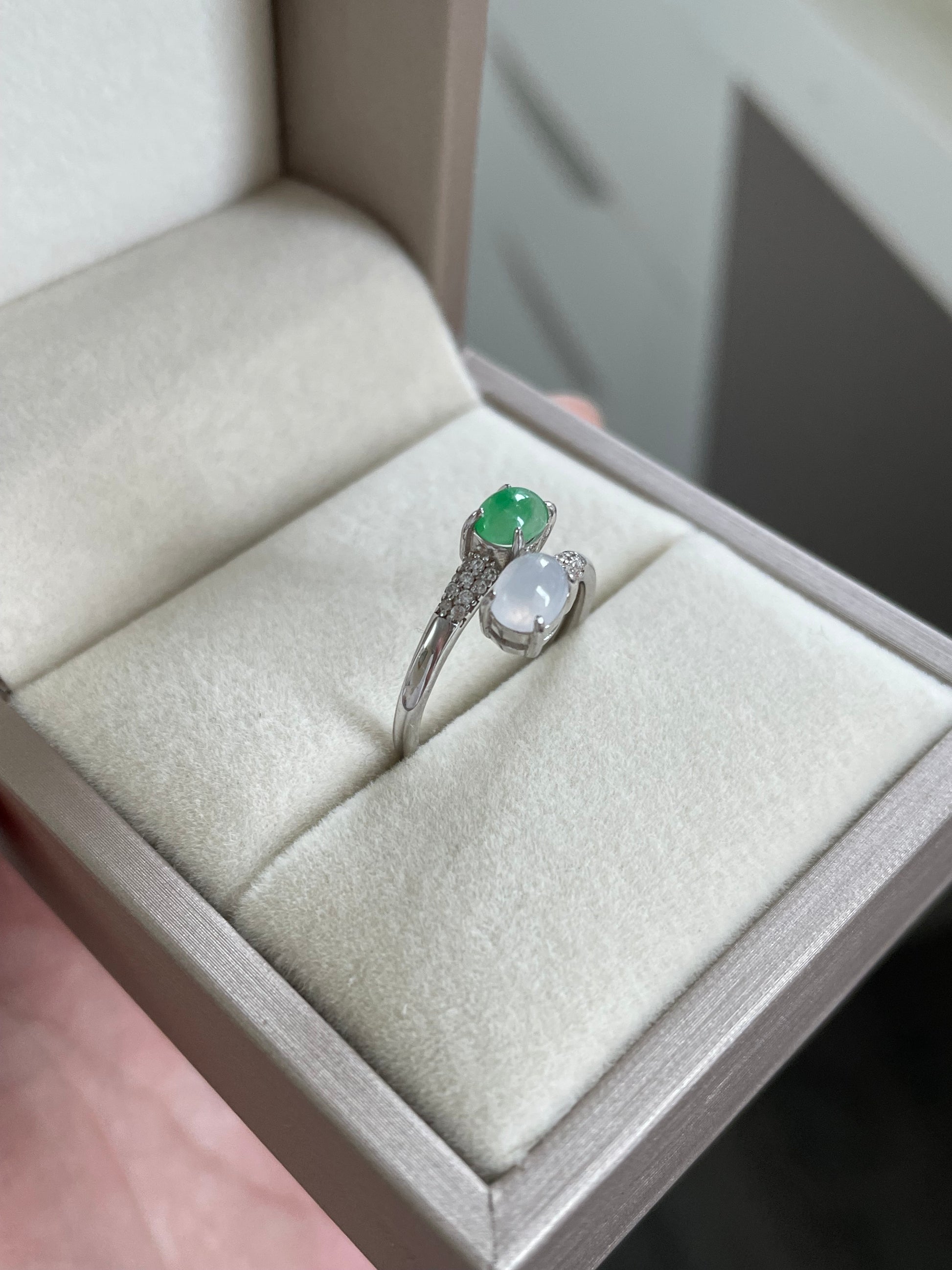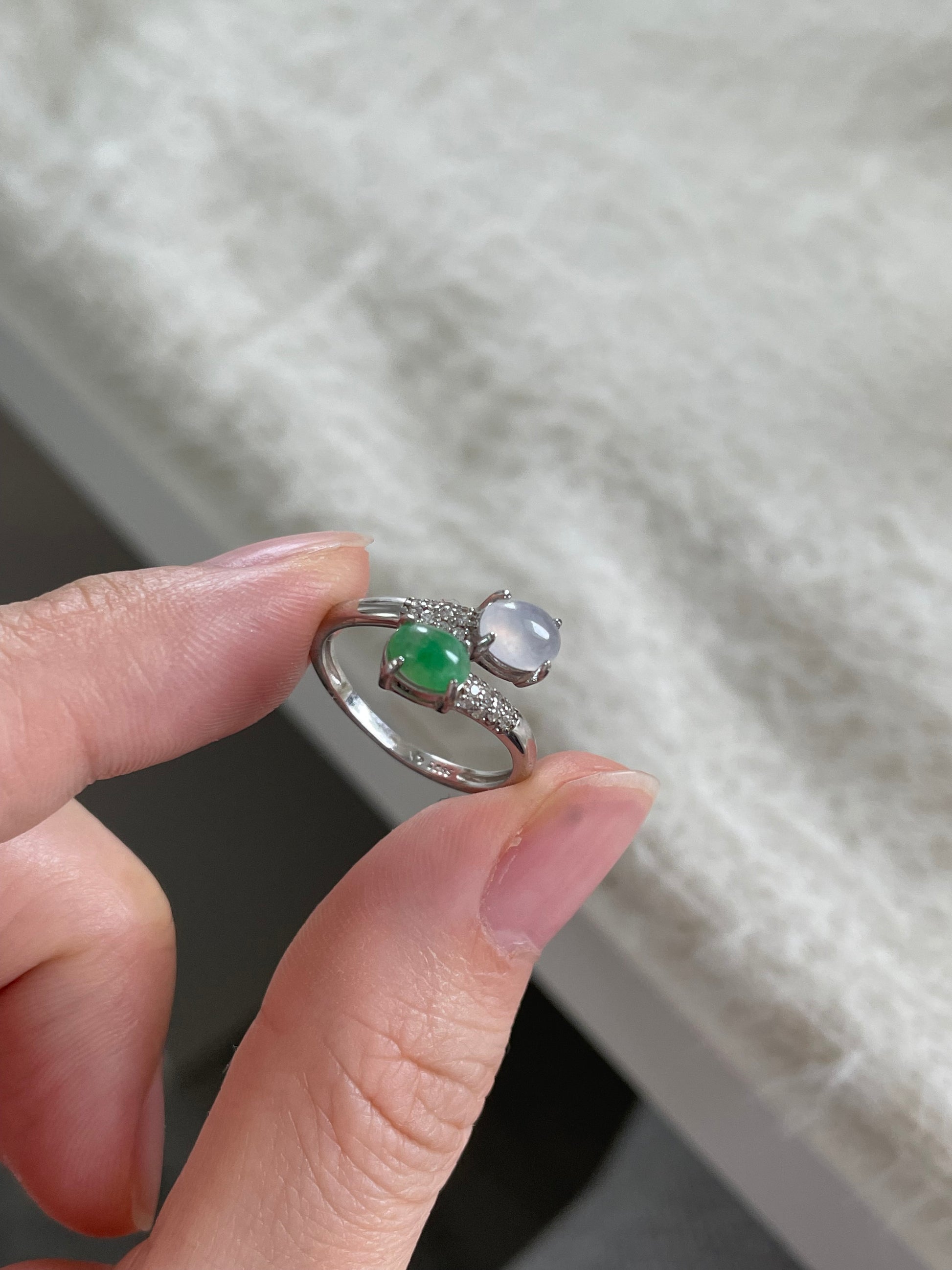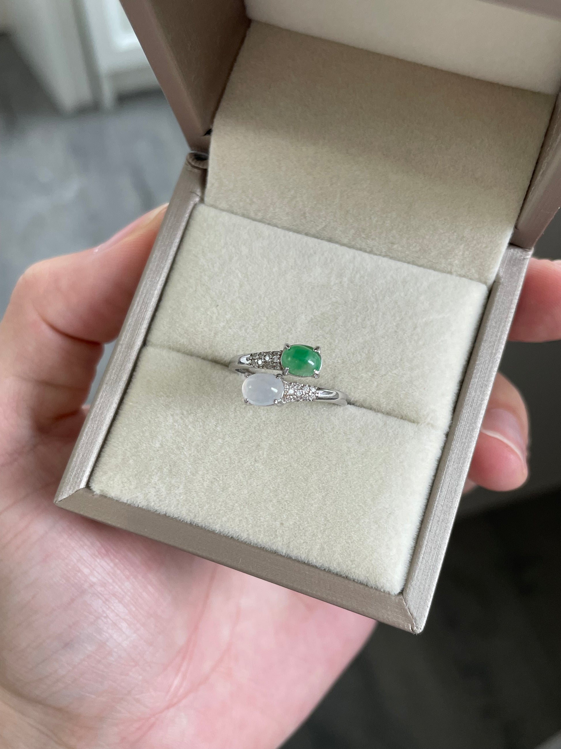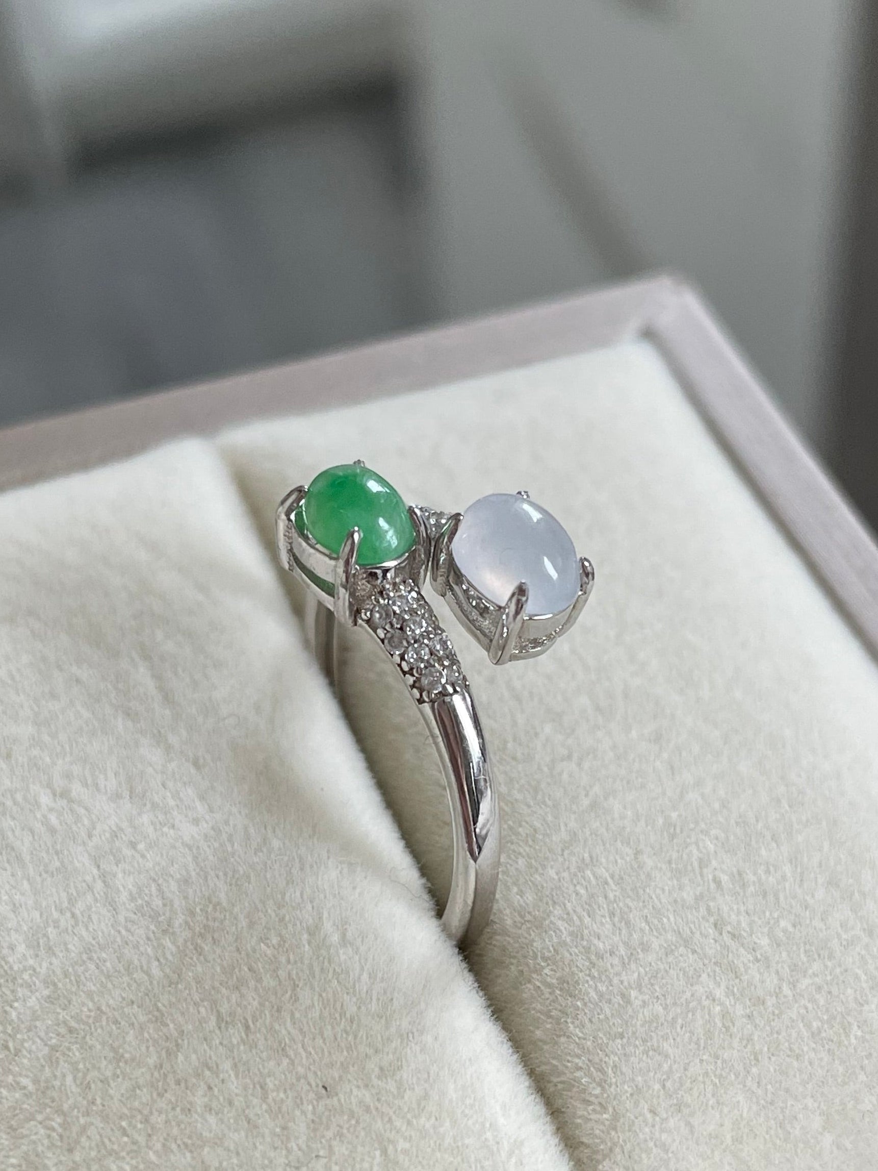 主石为淡阳绿色翡翠,颜色清爽饱满。另一颗为翡翠白冰,水润有光感;戒托为925银材质,戒臂镶嵌小锆石作点缀,整体设计柔和又有层次感,日常百搭的点睛款,款式还是杨幂的同款噢。翡翠裸石约5.9mm-4.6mm,厚度约4mm。