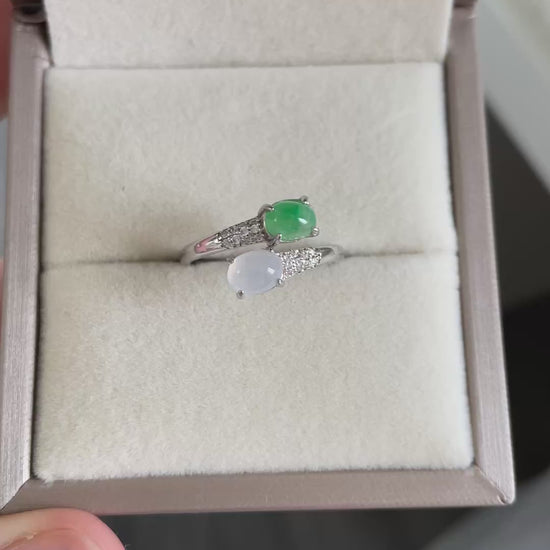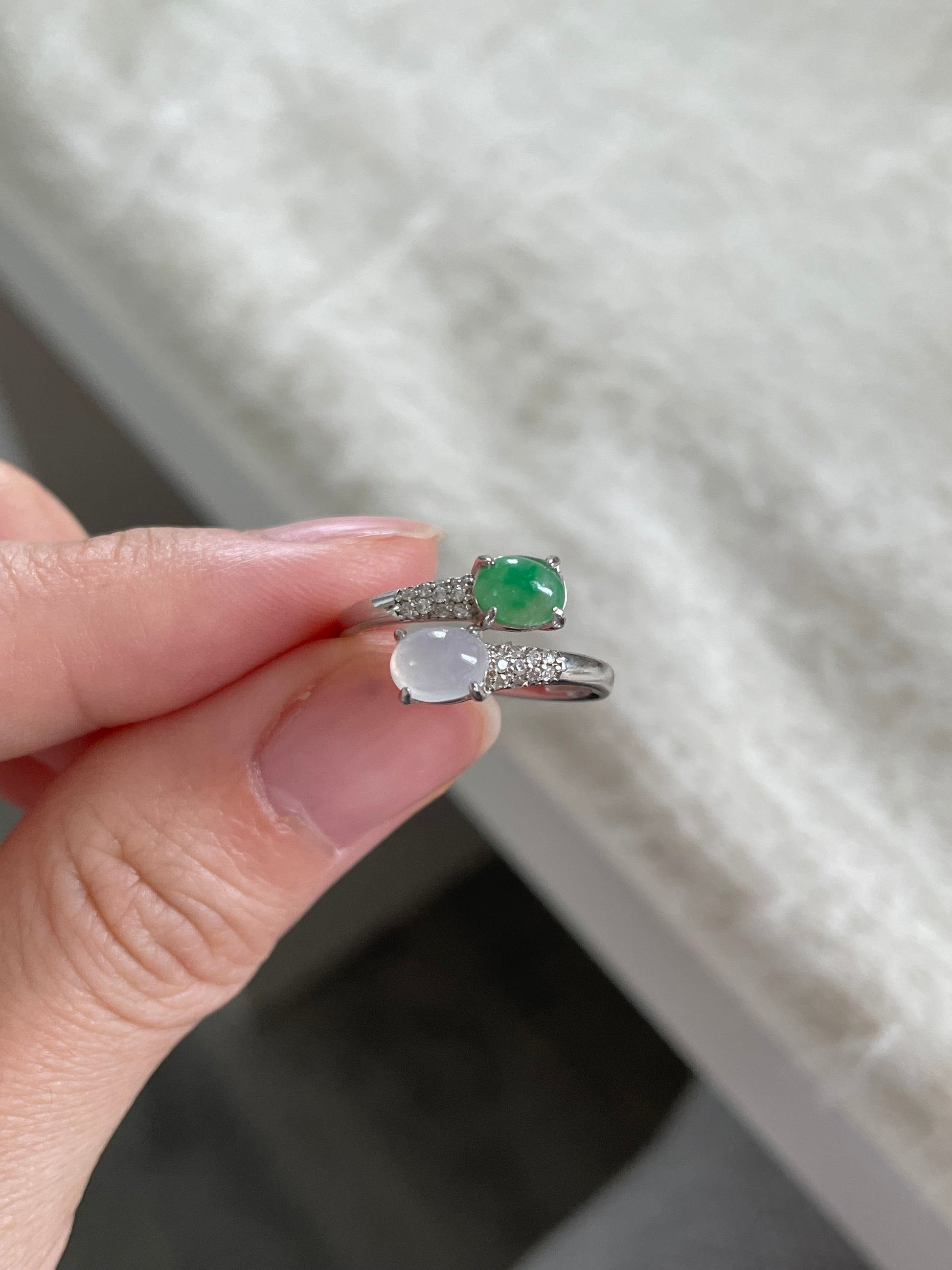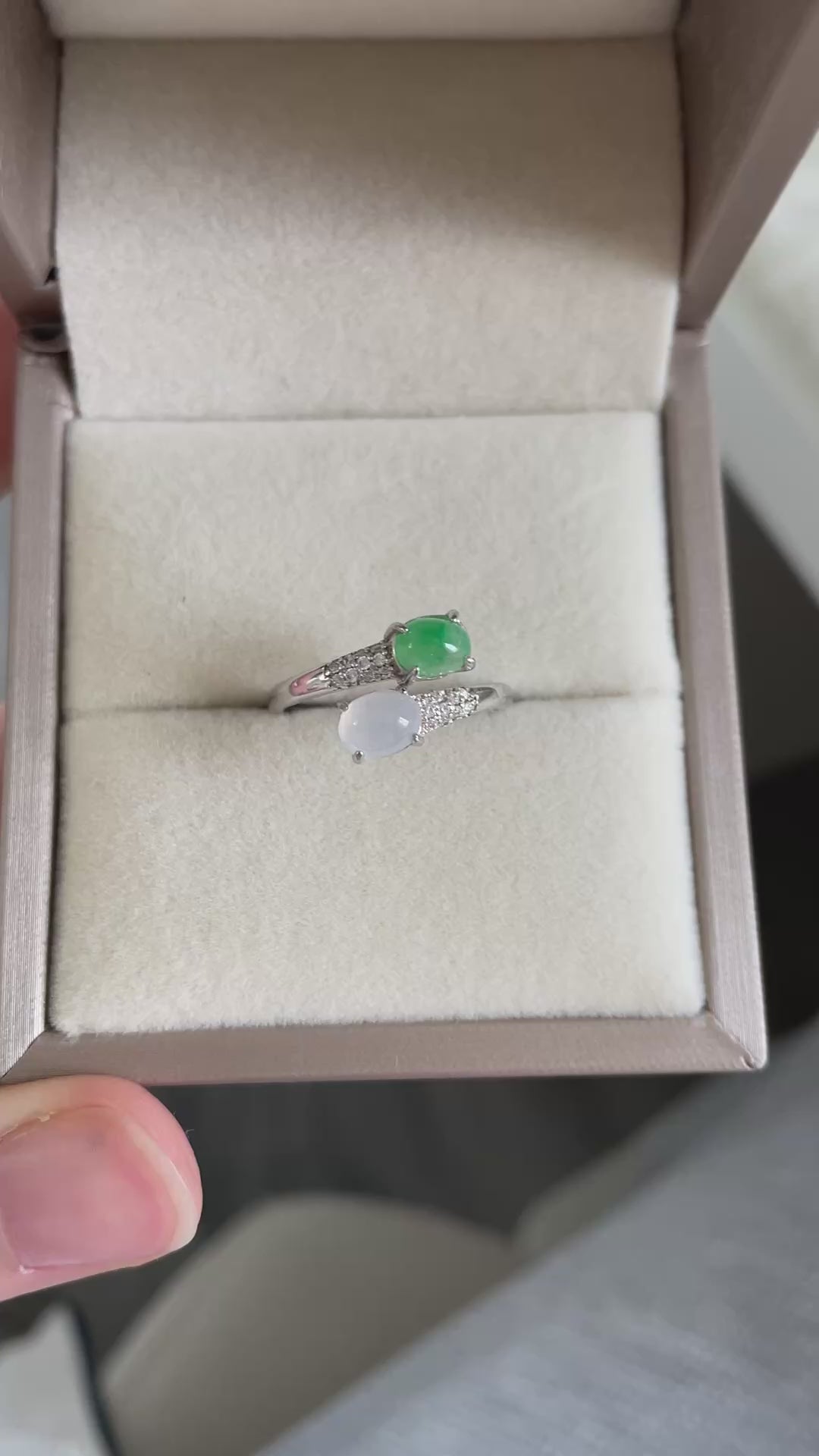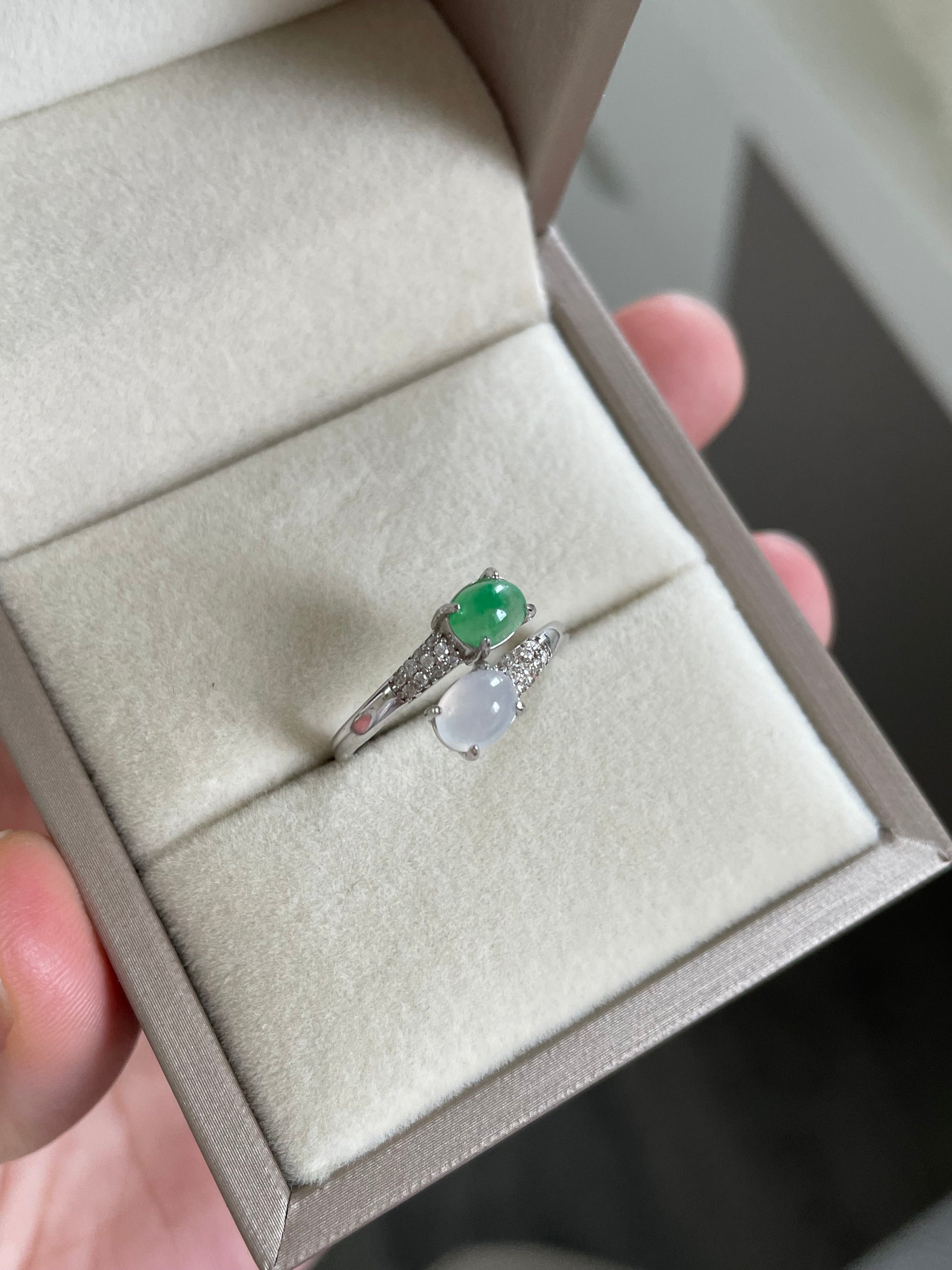 主石为淡阳绿色翡翠,颜色清爽饱满。另一颗为翡翠白冰,水润有光感;戒托为925银材质,戒臂镶嵌小锆石作点缀,整体设计柔和又有层次感,日常百搭的点睛款,款式还是杨幂的同款噢。翡翠裸石约5.9mm-4.6mm,厚度约4mm。