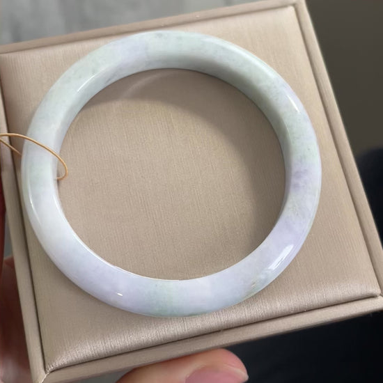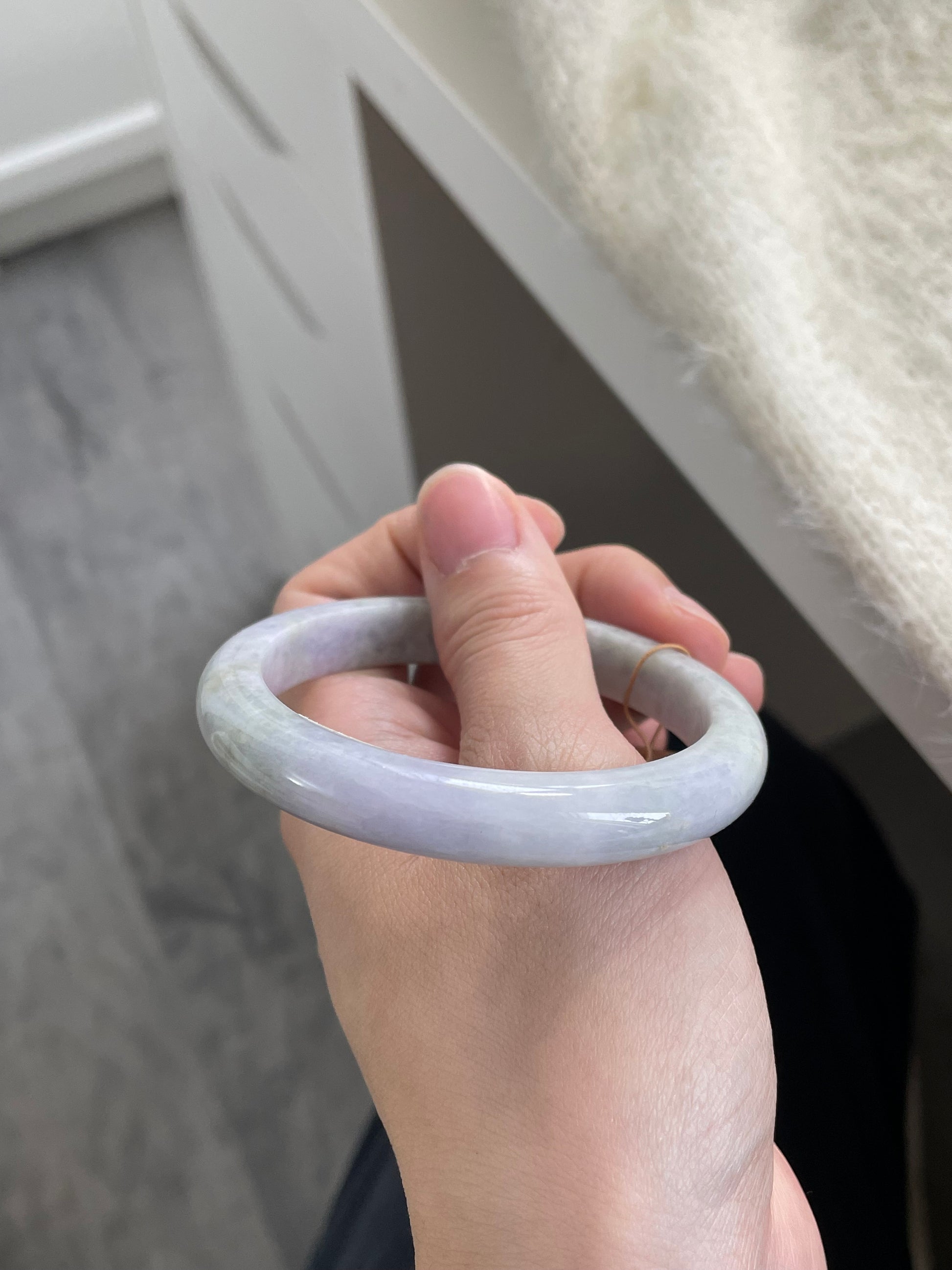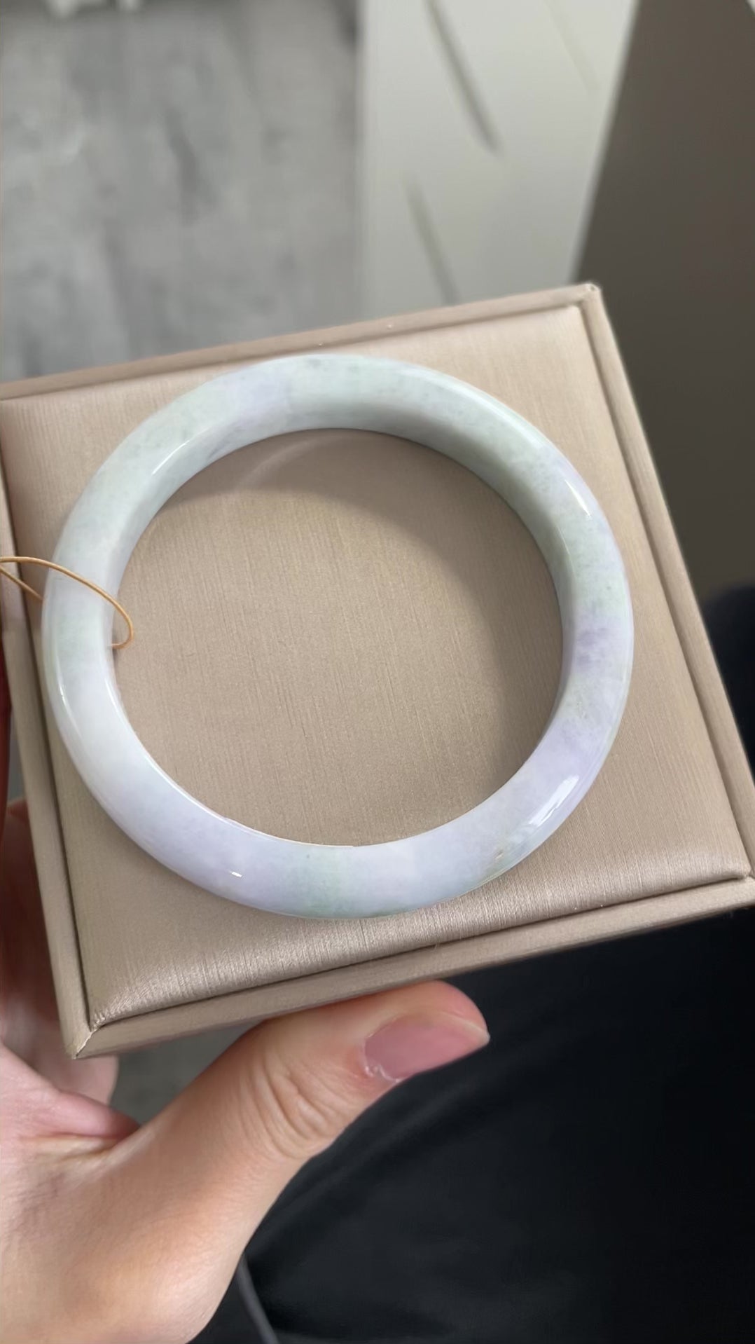 天然缅甸翡翠手镯,底色以淡淡的紫底为主,带少量浅绿,整体有薰衣草花花园的感觉,柔和耐看。尺寸为57.3mm,条宽约 10.9mm,厚度约 7.8mm。