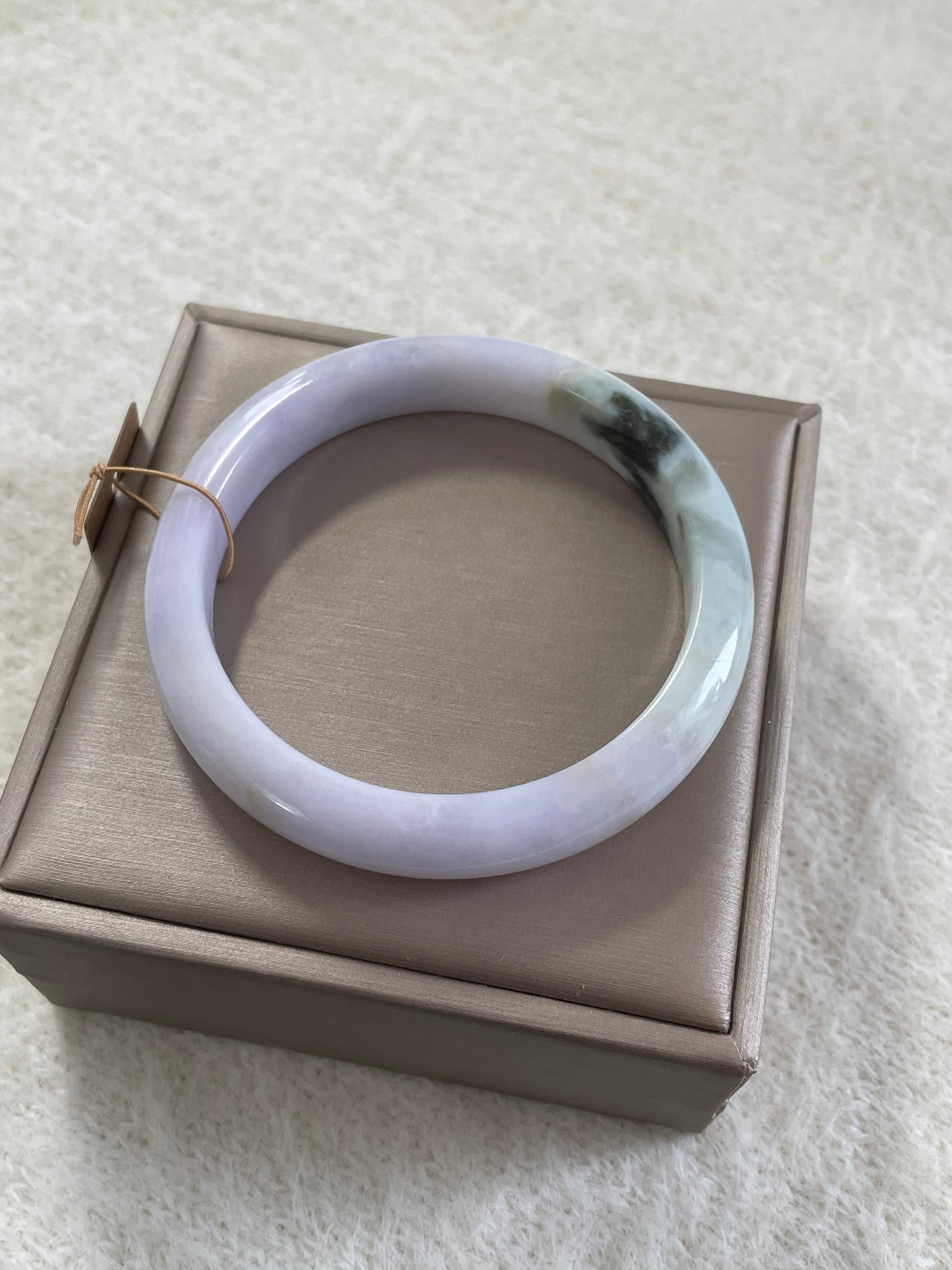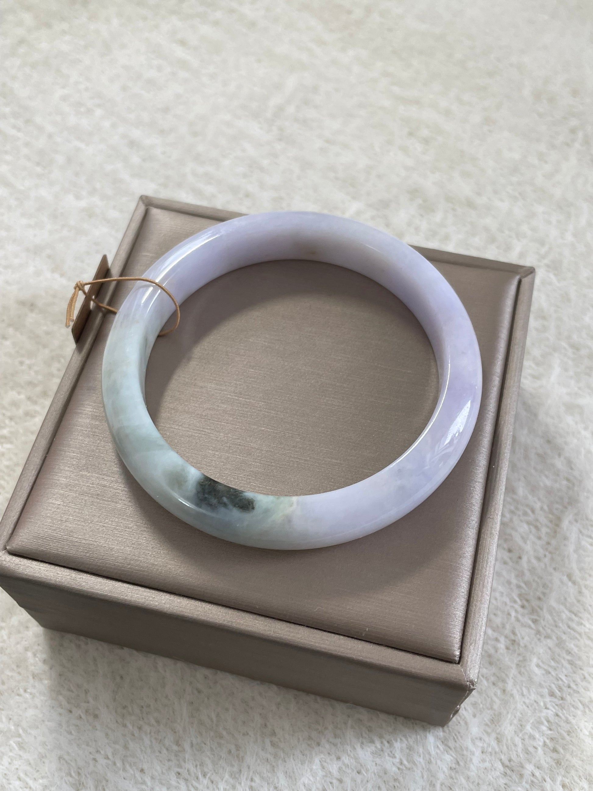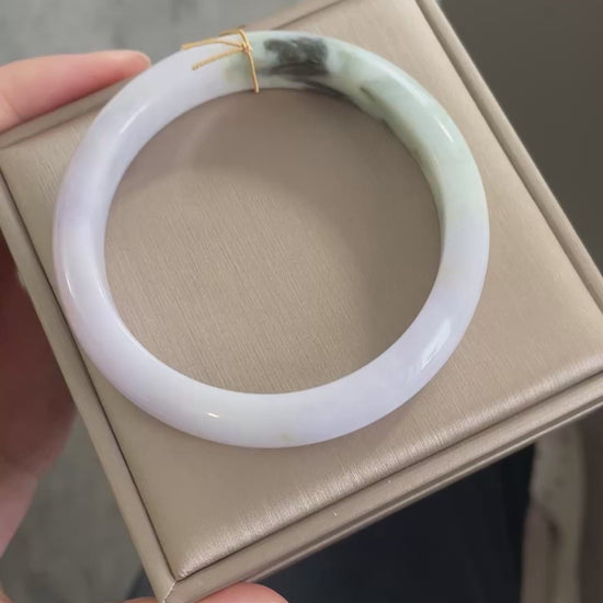 天然缅甸翡翠手镯,以淡紫为主色调,底子很细,日常百搭。尺寸为57.5mm,条宽约 11mm,厚度约 7.8mm。
