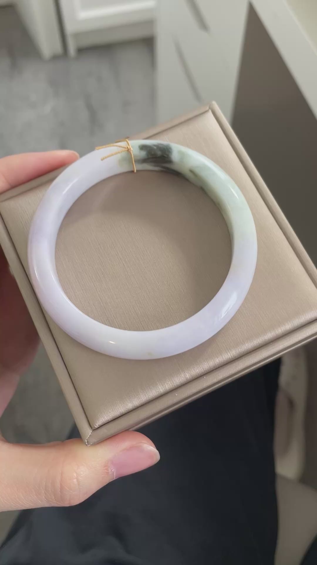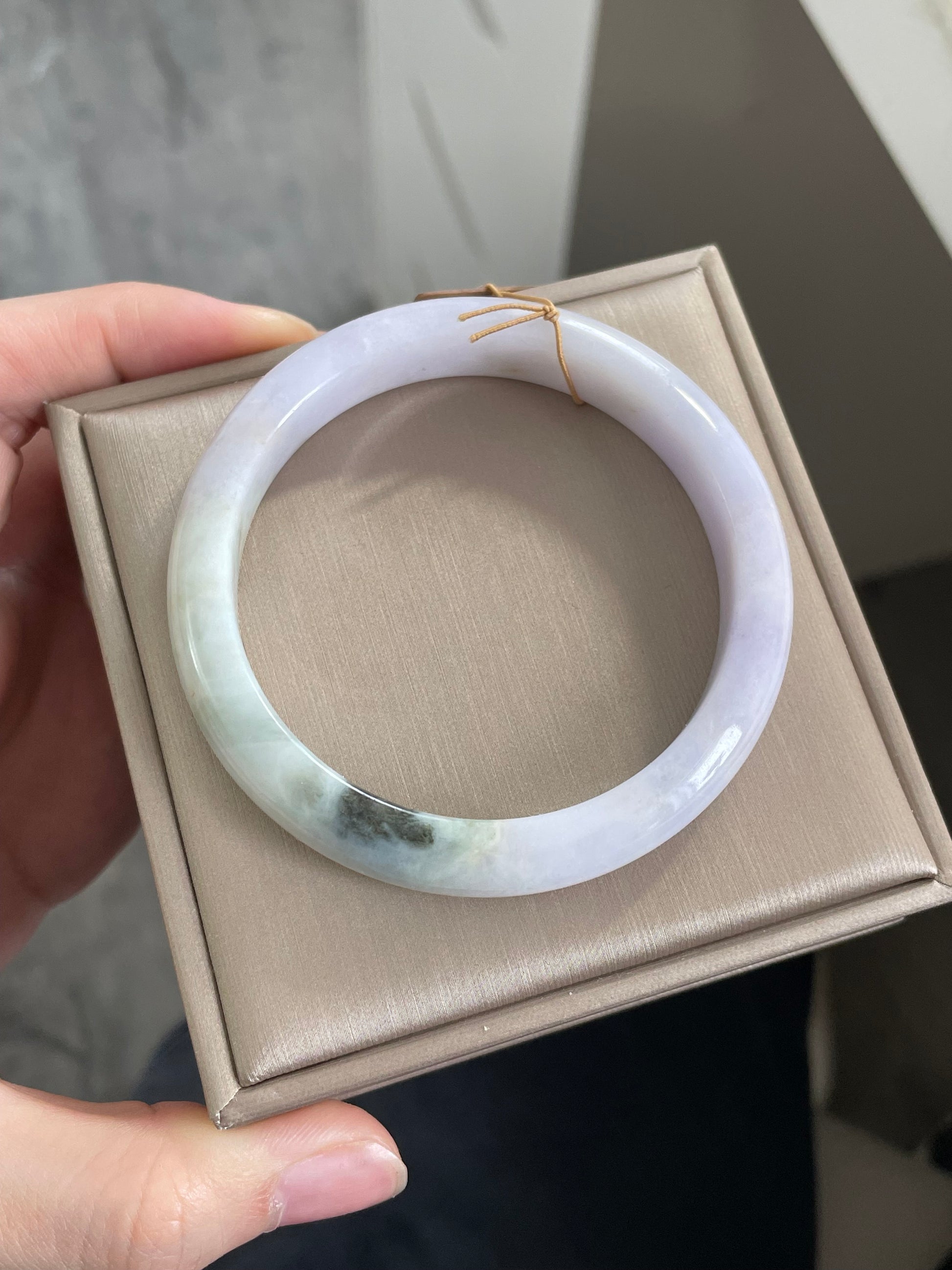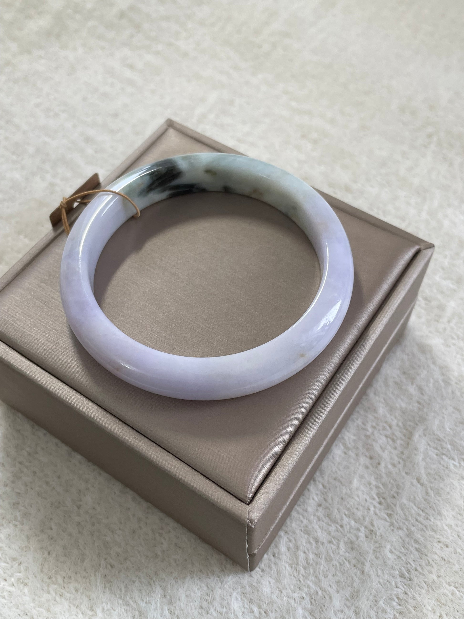 天然缅甸翡翠手镯,以淡紫为主色调,底子很细,日常百搭。尺寸为57.5mm,条宽约 11mm,厚度约 7.8mm。