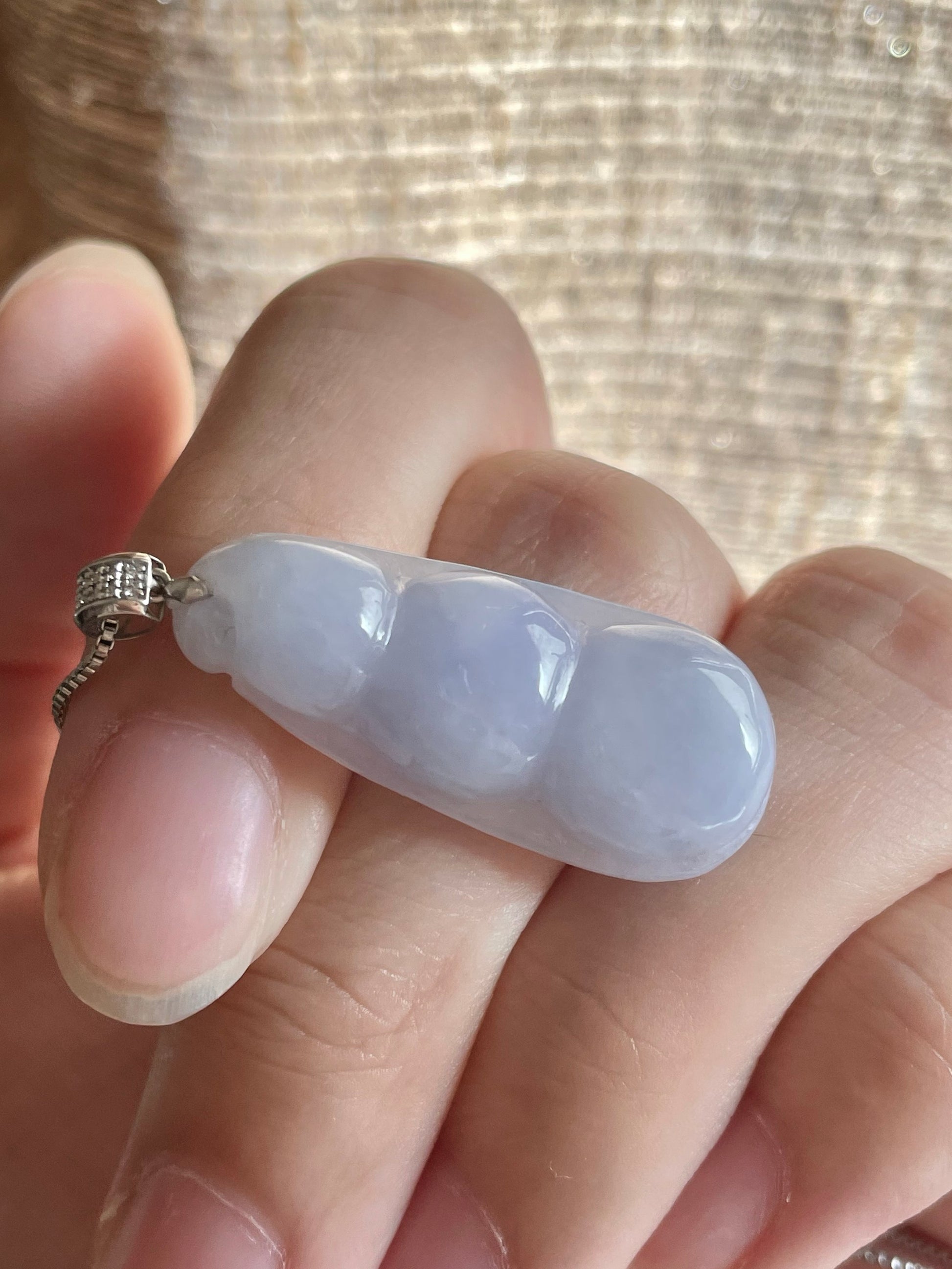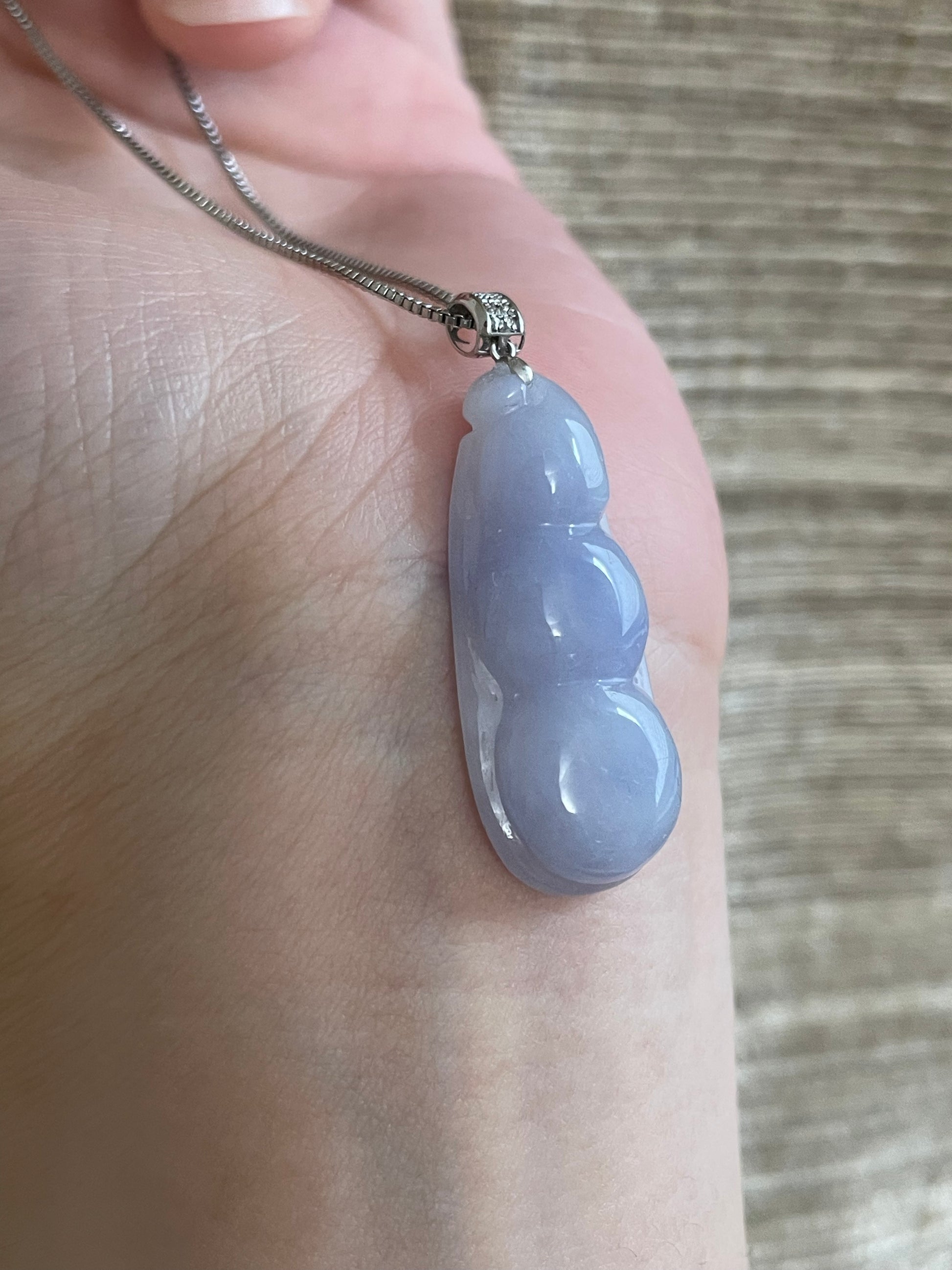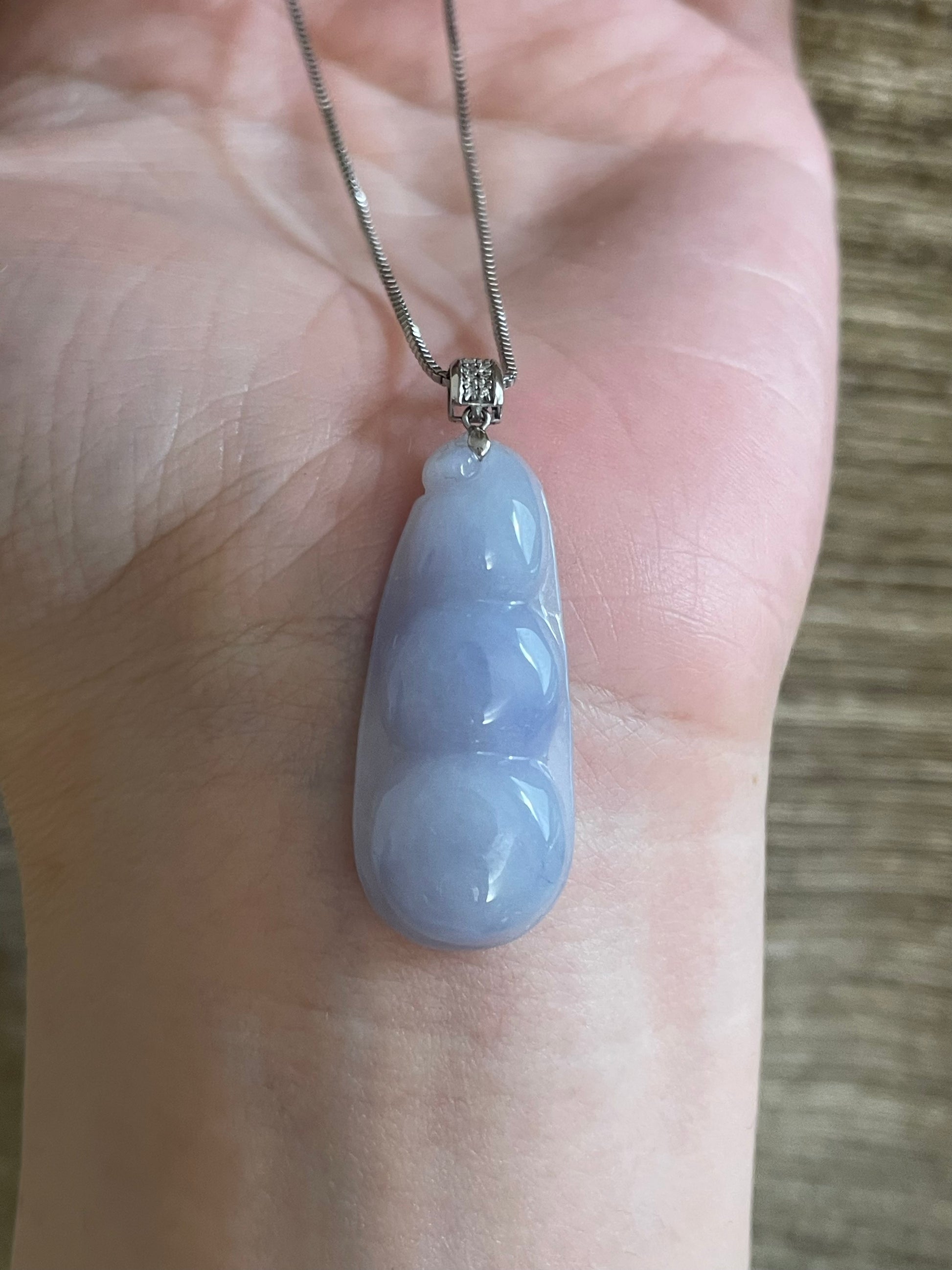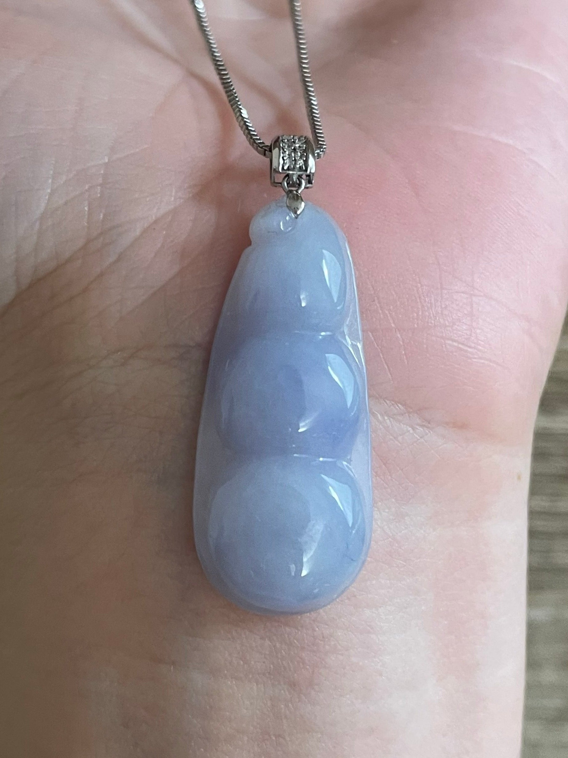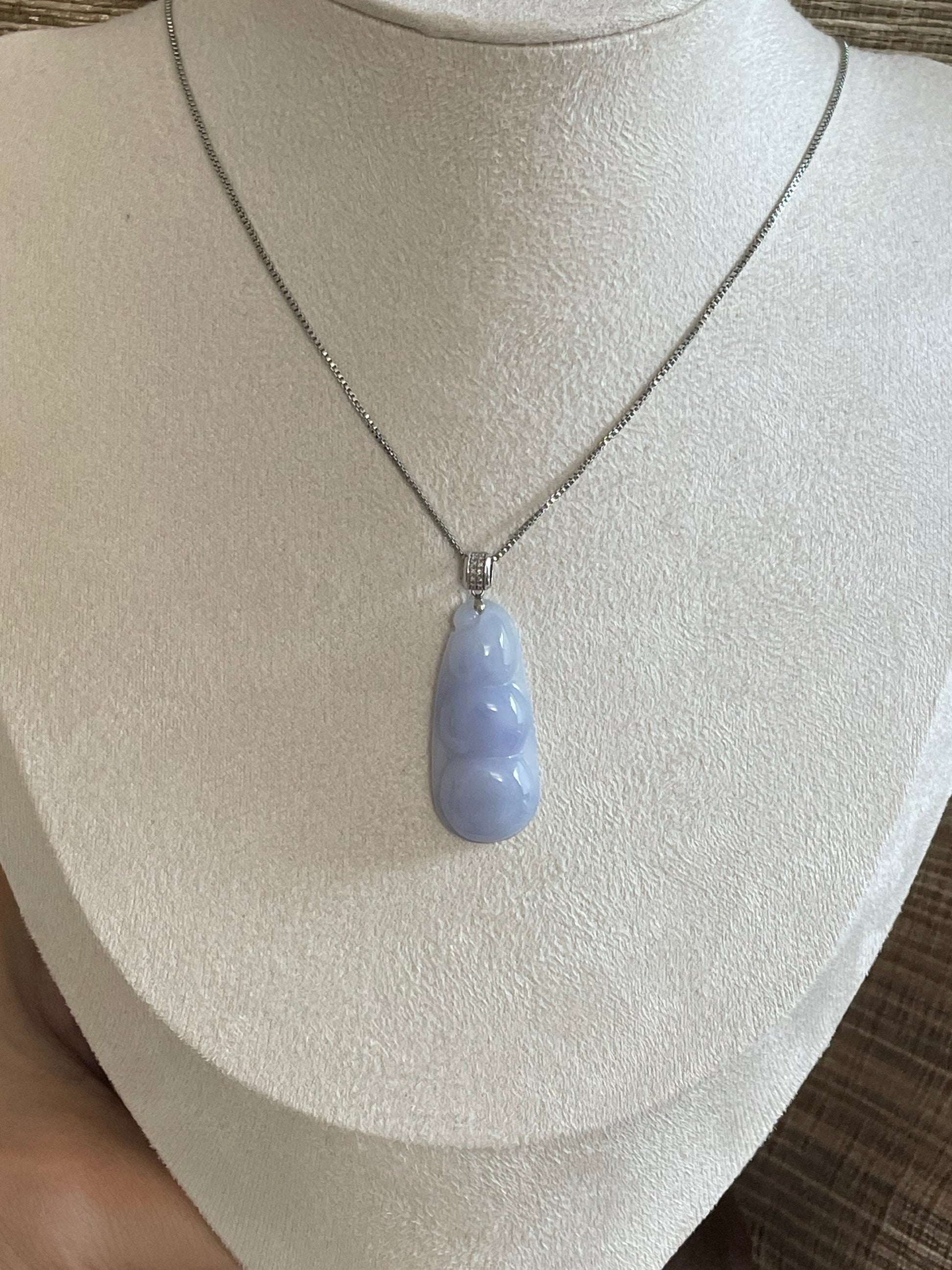 颜色满紫,底子比较胶润,形体饱满厚实,很有福气,18k金镶嵌扣头,上身温柔优雅,紫色看淡