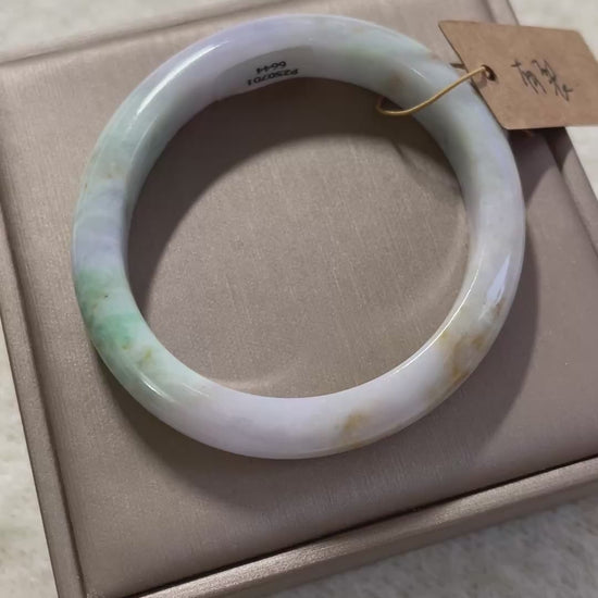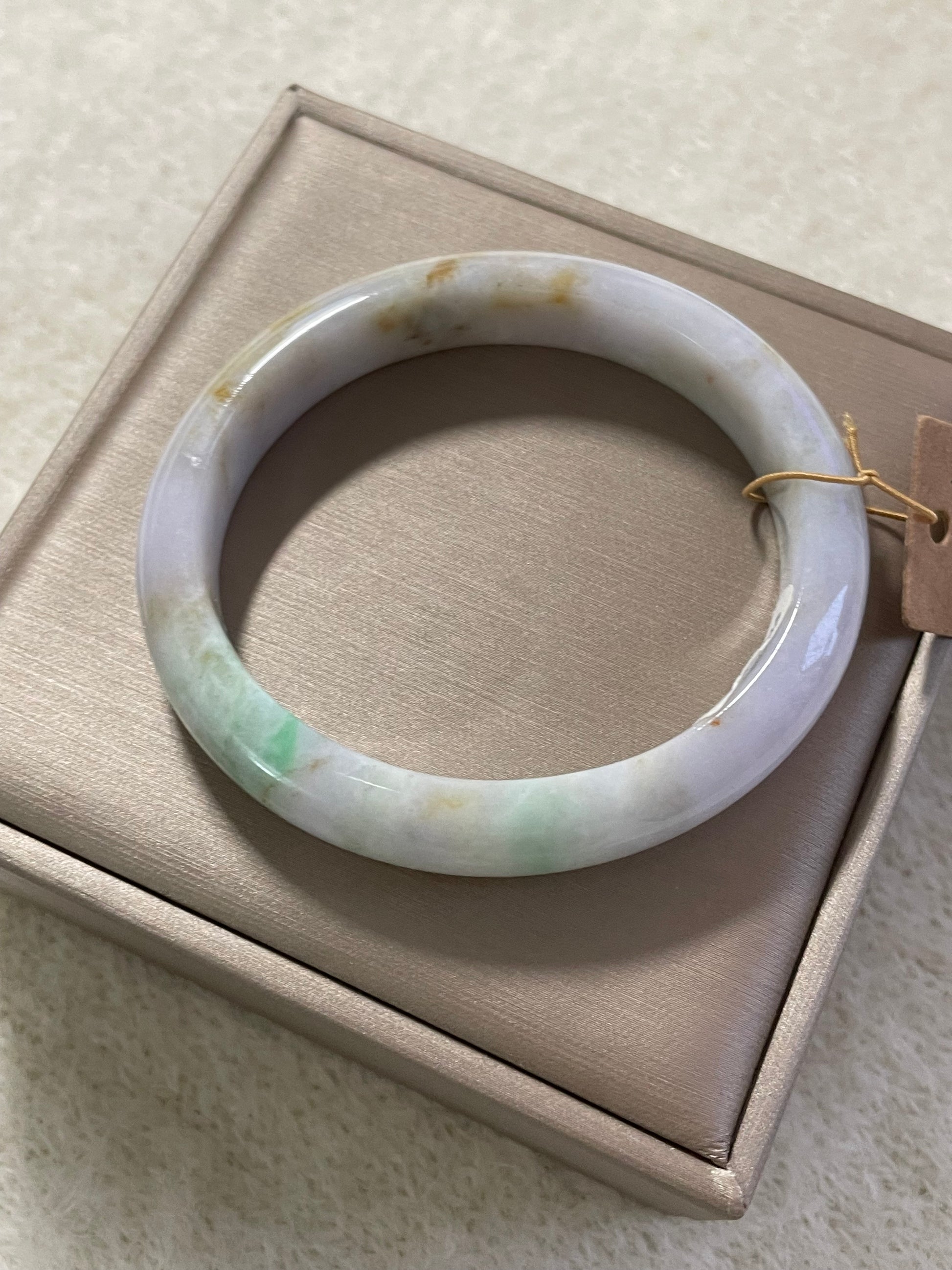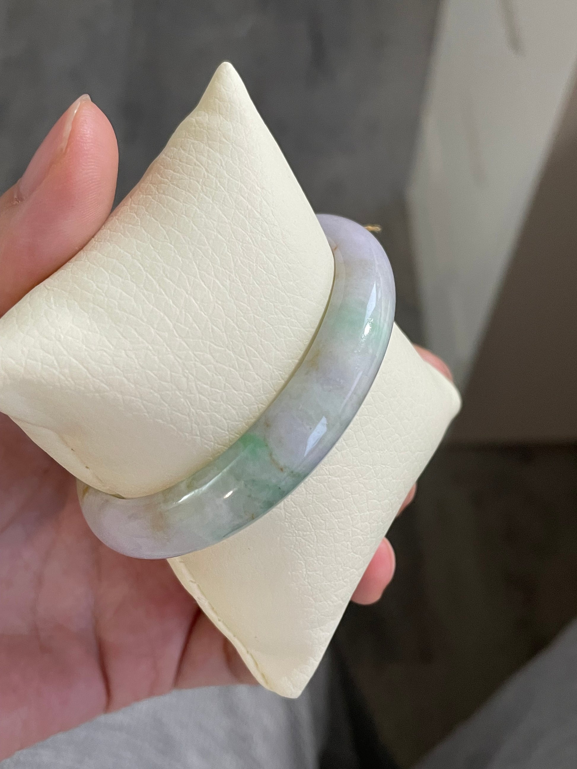 天然缅甸翡翠贵妃条形手镯,底色以紫色为主,带绿意与黄翡点缀,整体清爽柔和。上手显得气质温柔,是一条非常耐看的日常款。尺寸为 53.4–48mm,圈口50/51可戴,条宽约 10.6mm,厚度约 7.4mm。