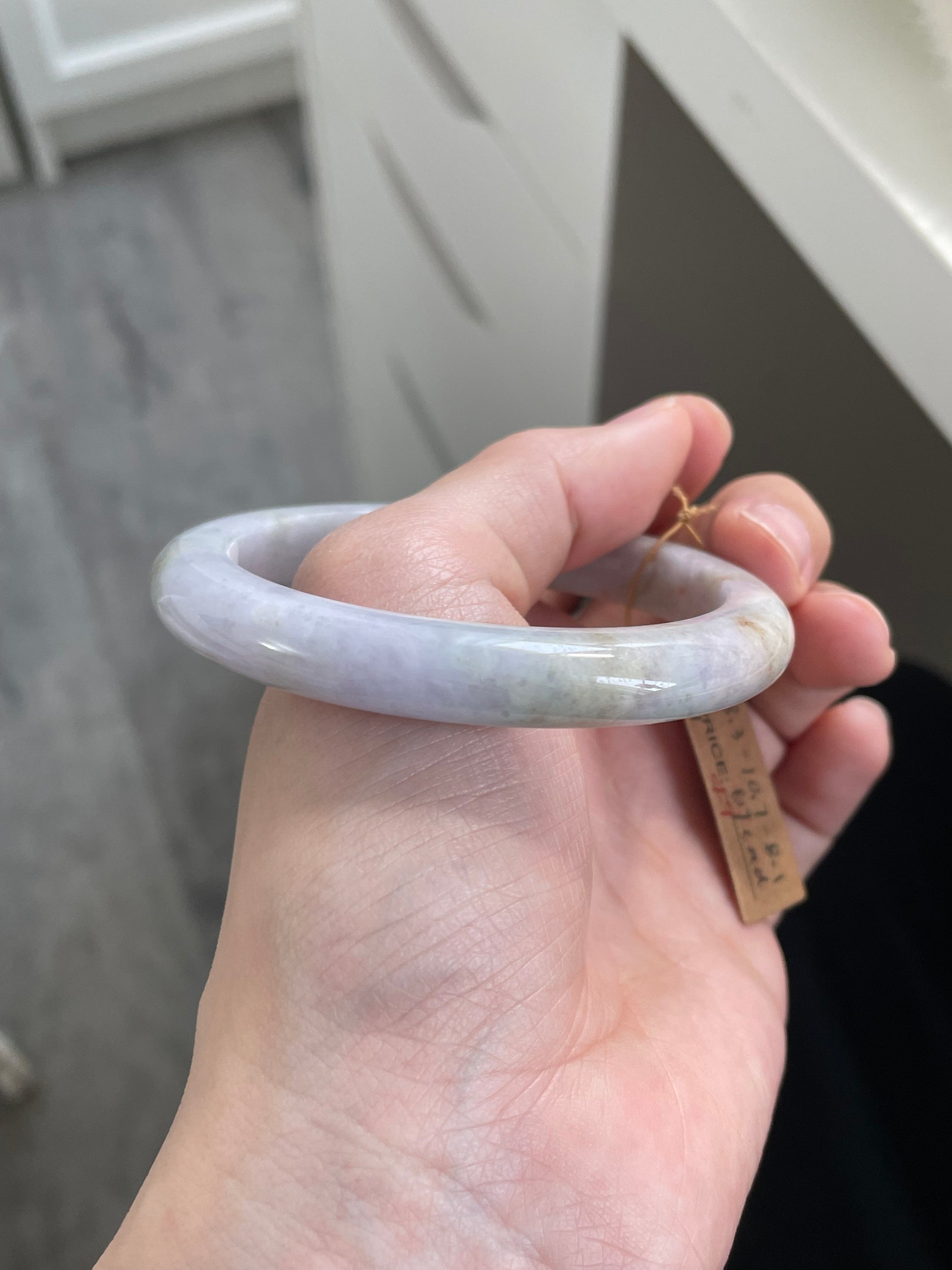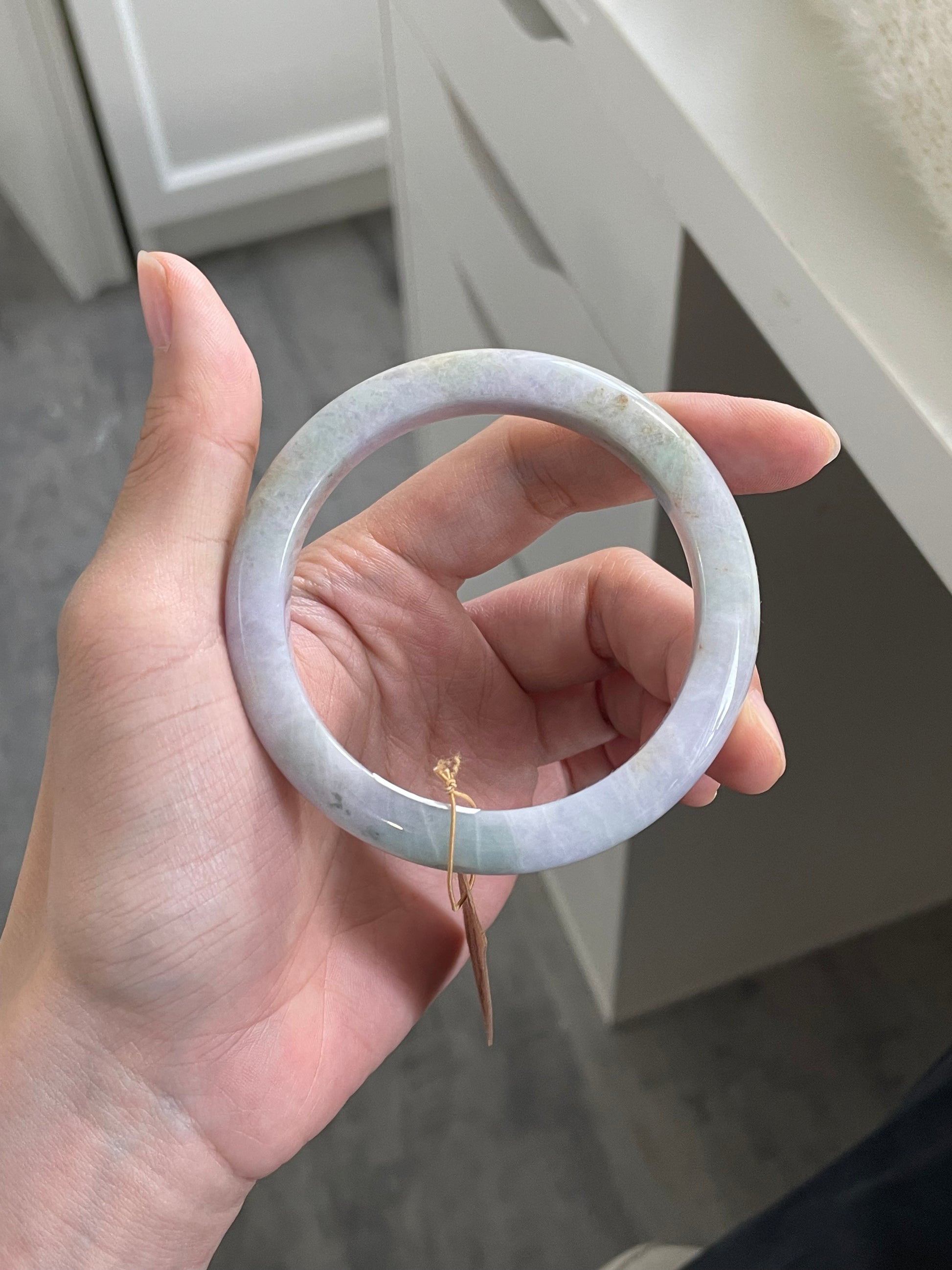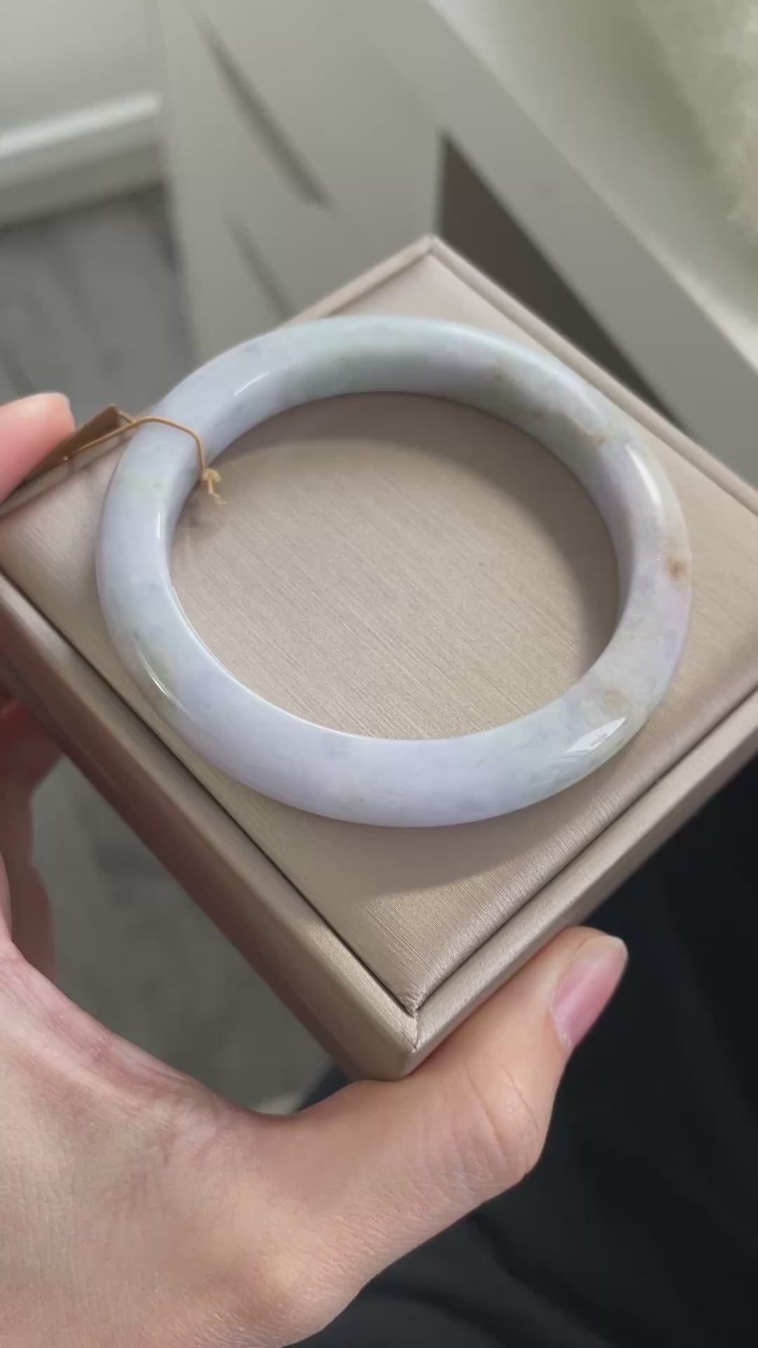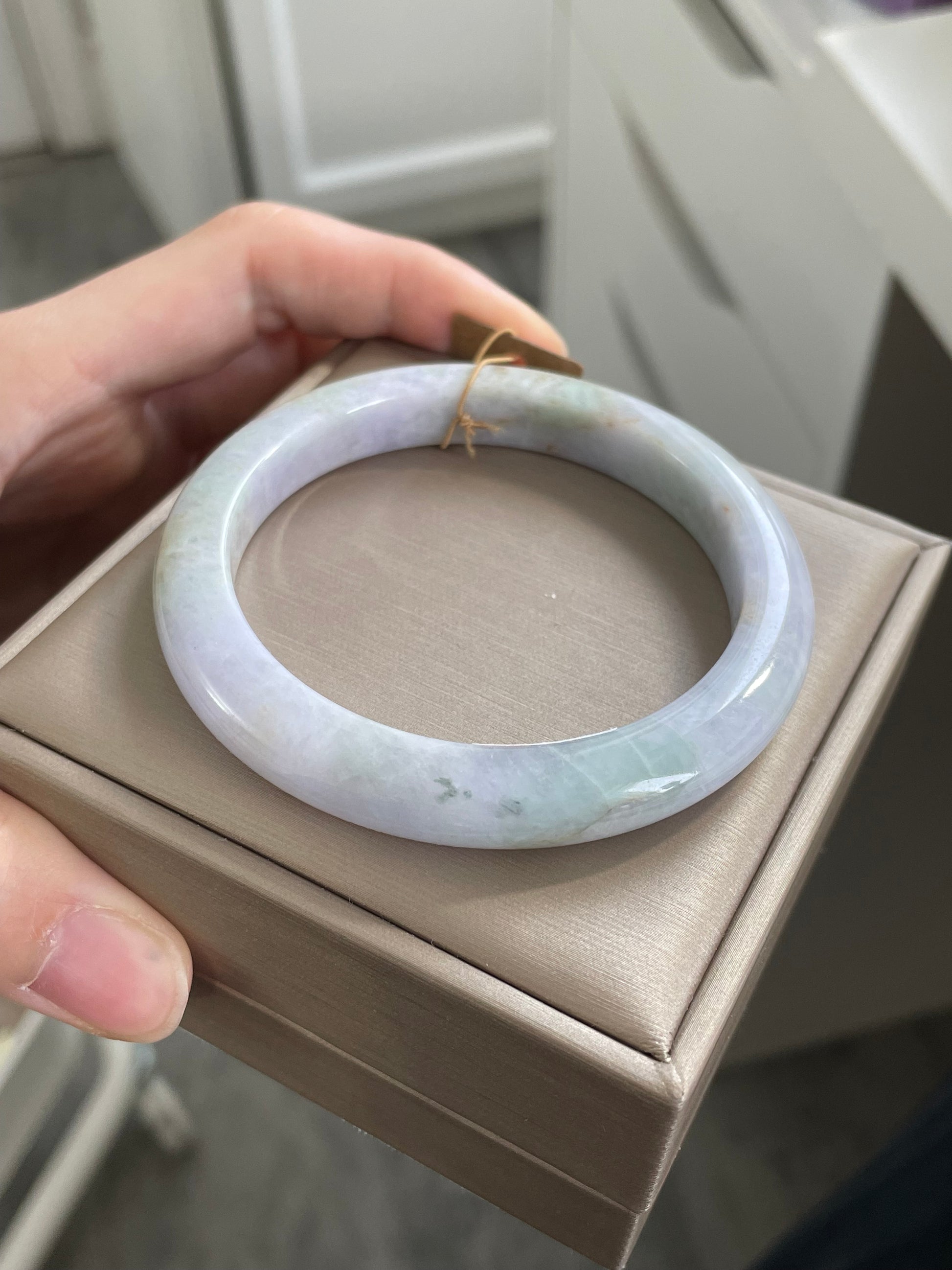 底色以淡紫色为主,少许绿色和黄翡点缀,颜色柔和梦幻,日常舒适百搭。尺寸约58.3mm,条宽约 10.7mm,厚度约 8.1mm。