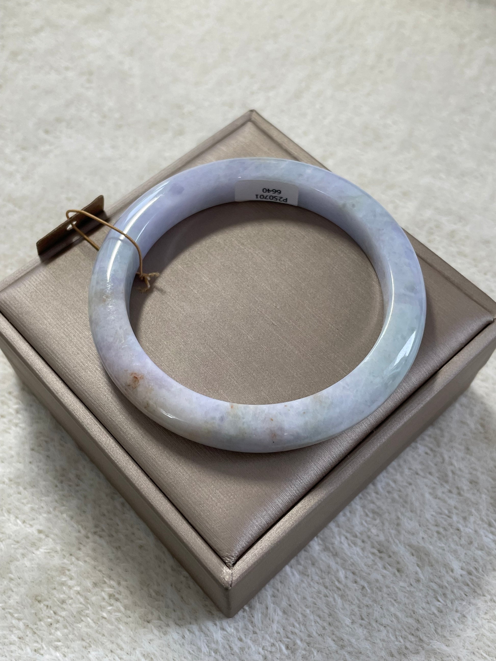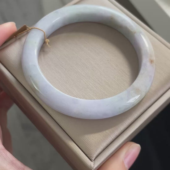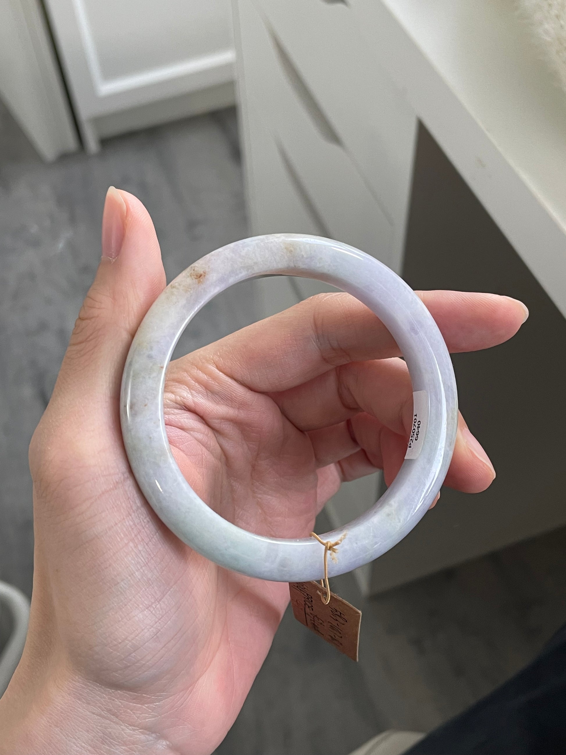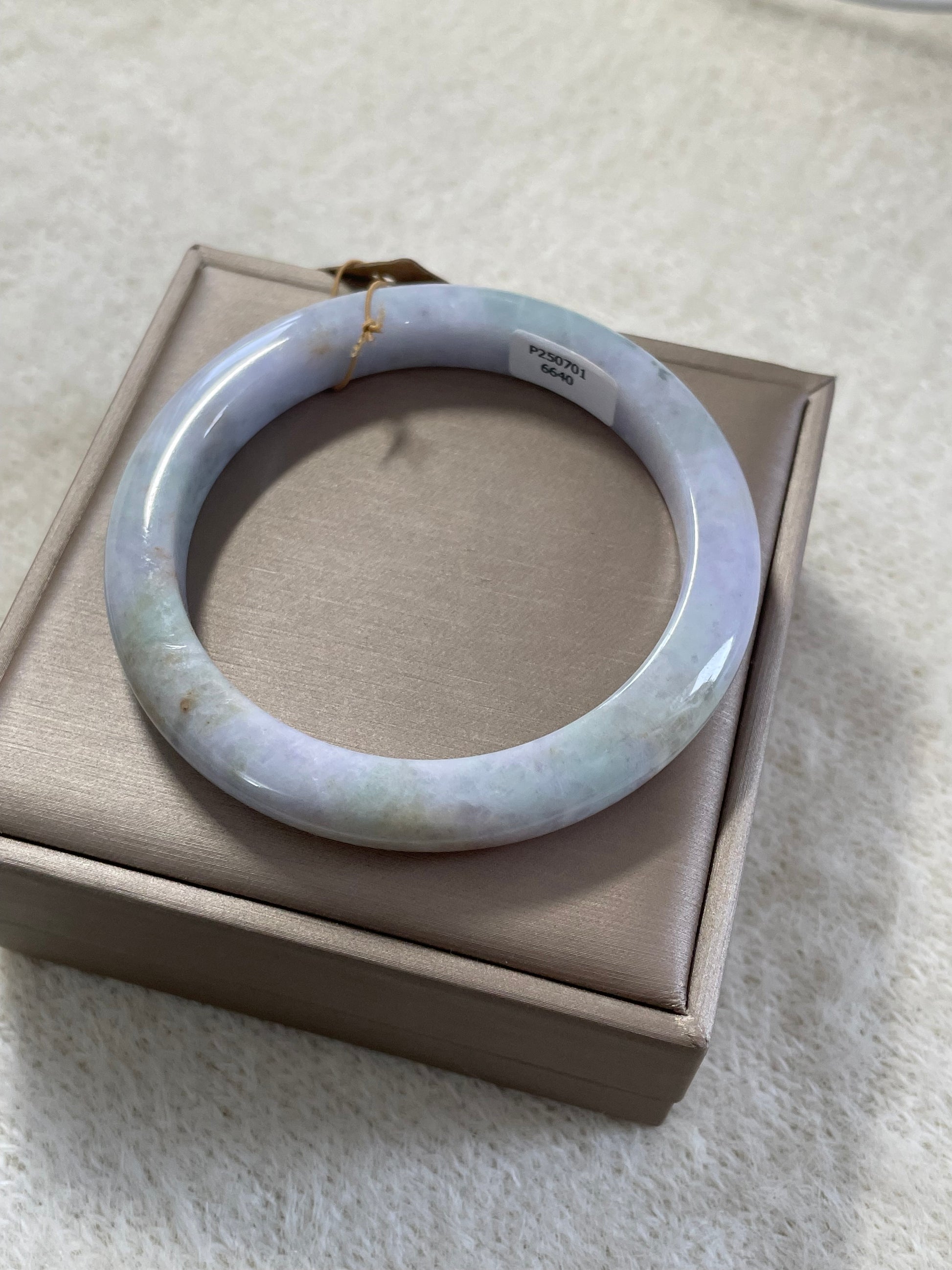 底色以淡紫色为主,少许绿色和黄翡点缀,颜色柔和梦幻,日常舒适百搭。尺寸约58.3mm,条宽约 10.7mm,厚度约 8.1mm。