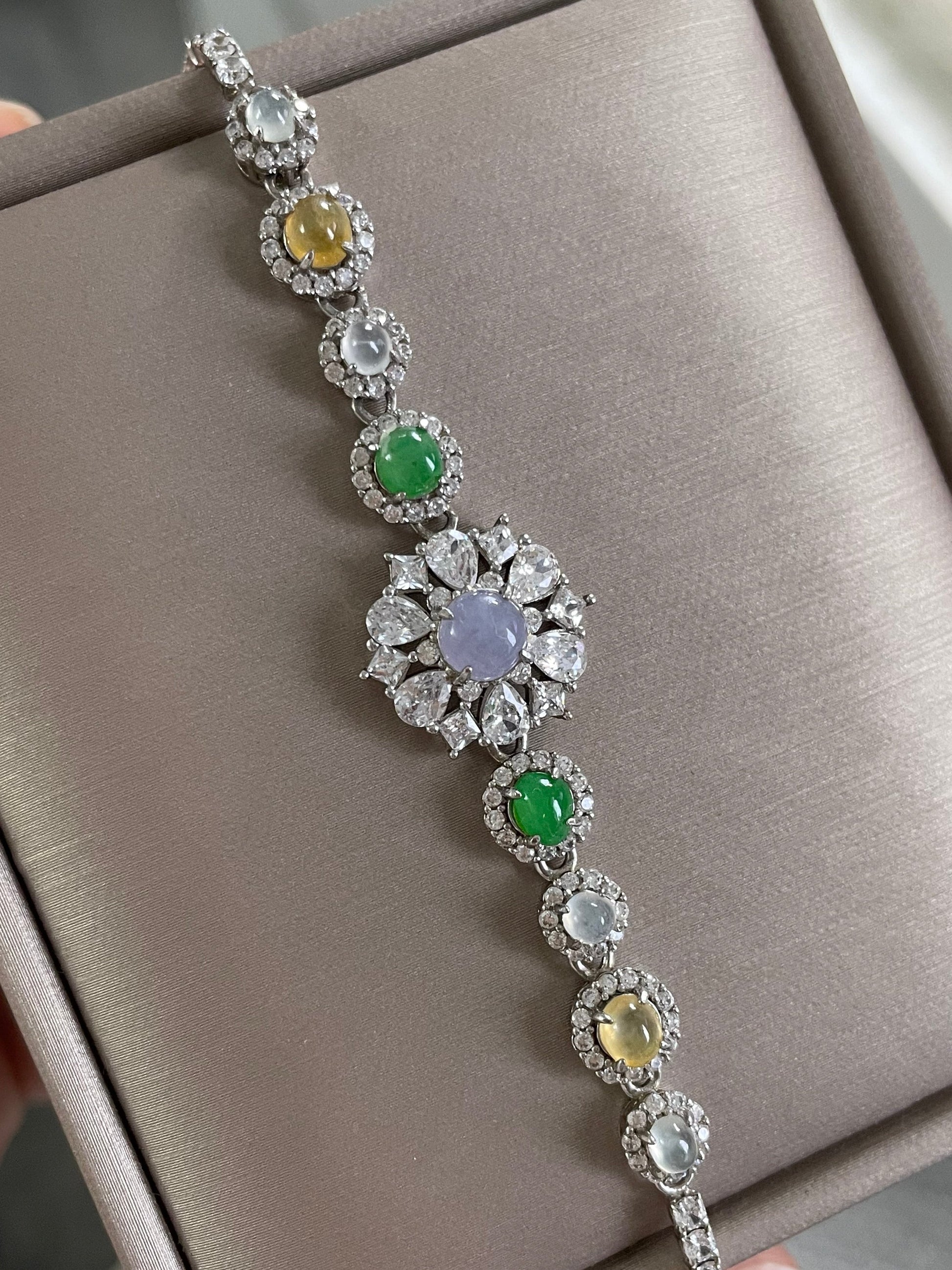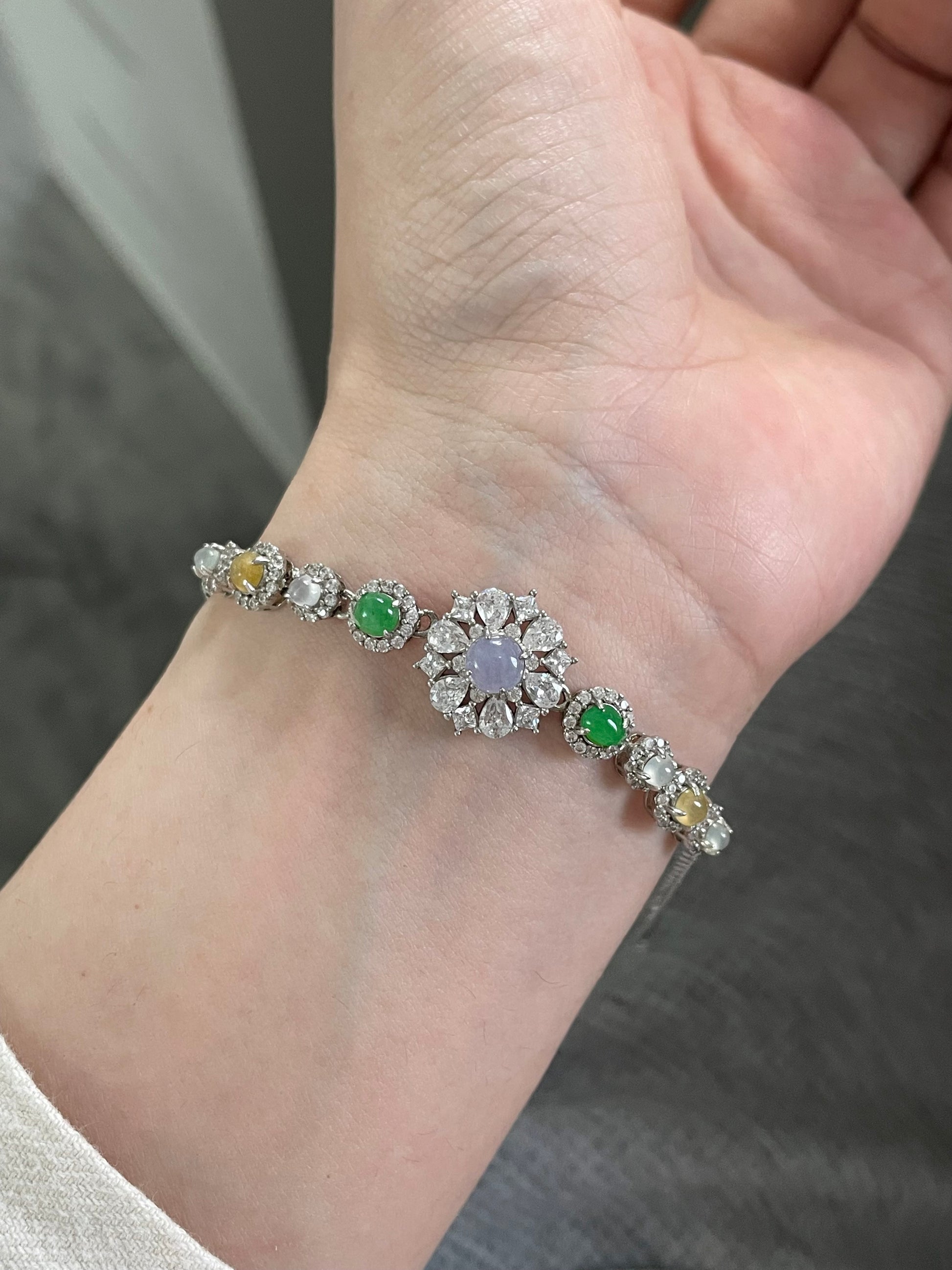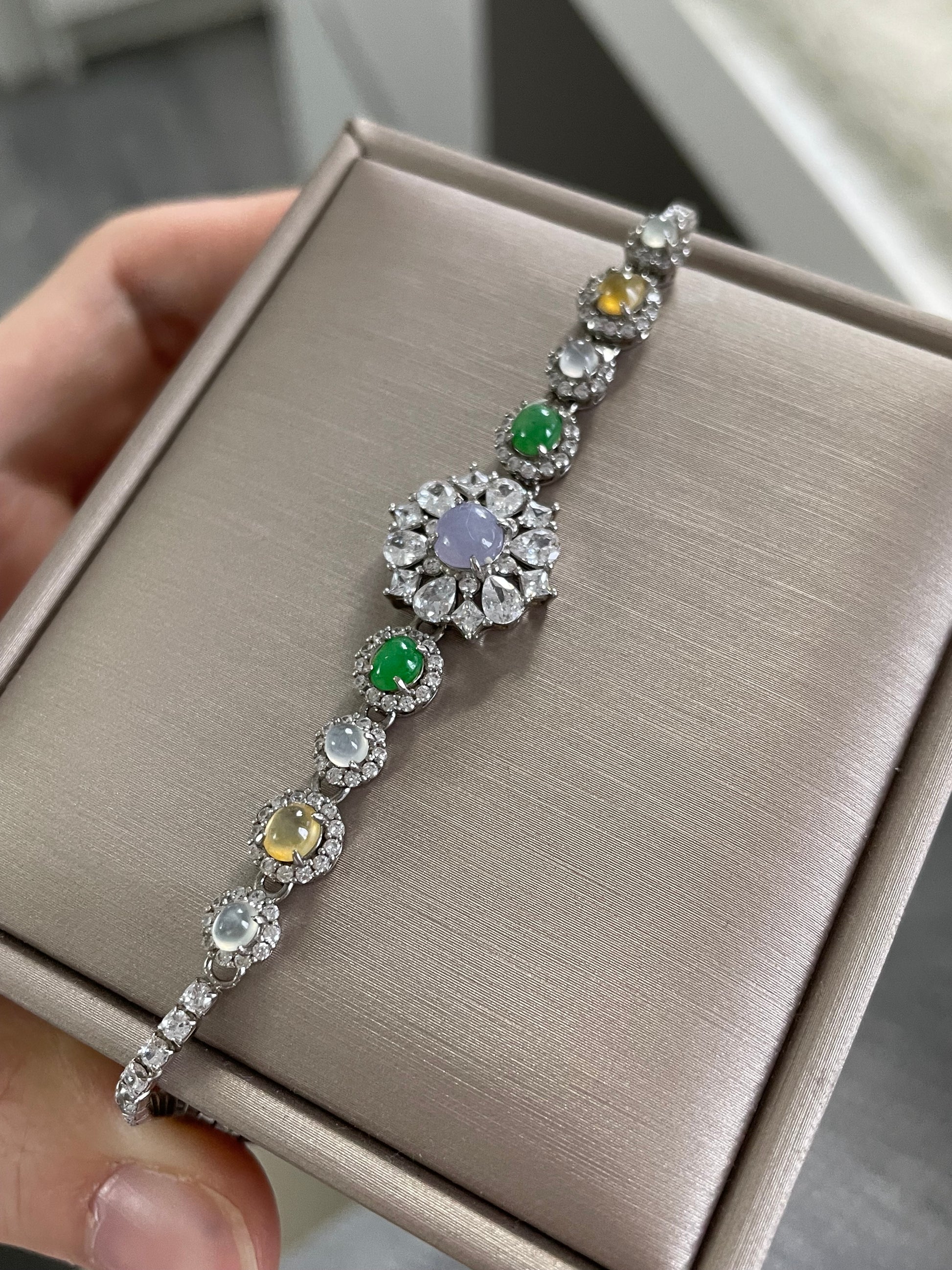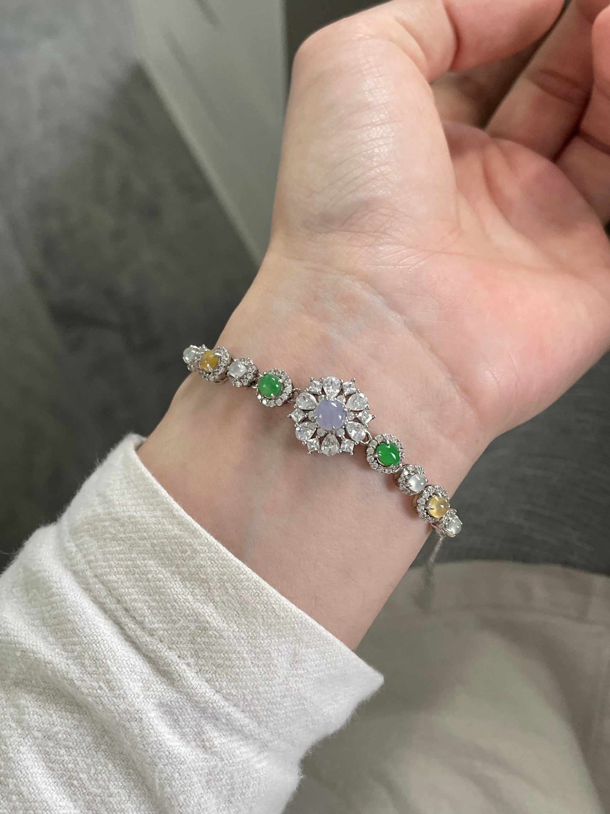 手链以紫罗兰翡翠为中心位,搭配阳绿翡翠、白冰翡翠、黄翡等多彩蛋面组合。主位紫罗兰蛋面满紫有种水,周围镶嵌锆石整体造型如盛放花朵。两侧多颗不同色系翡翠蛋面延展排列,色系丰富又和谐,阳绿明亮抢眼、白冰清透干净、黄翡温柔甜美,整条手链呈现高级珠宝的精致感。