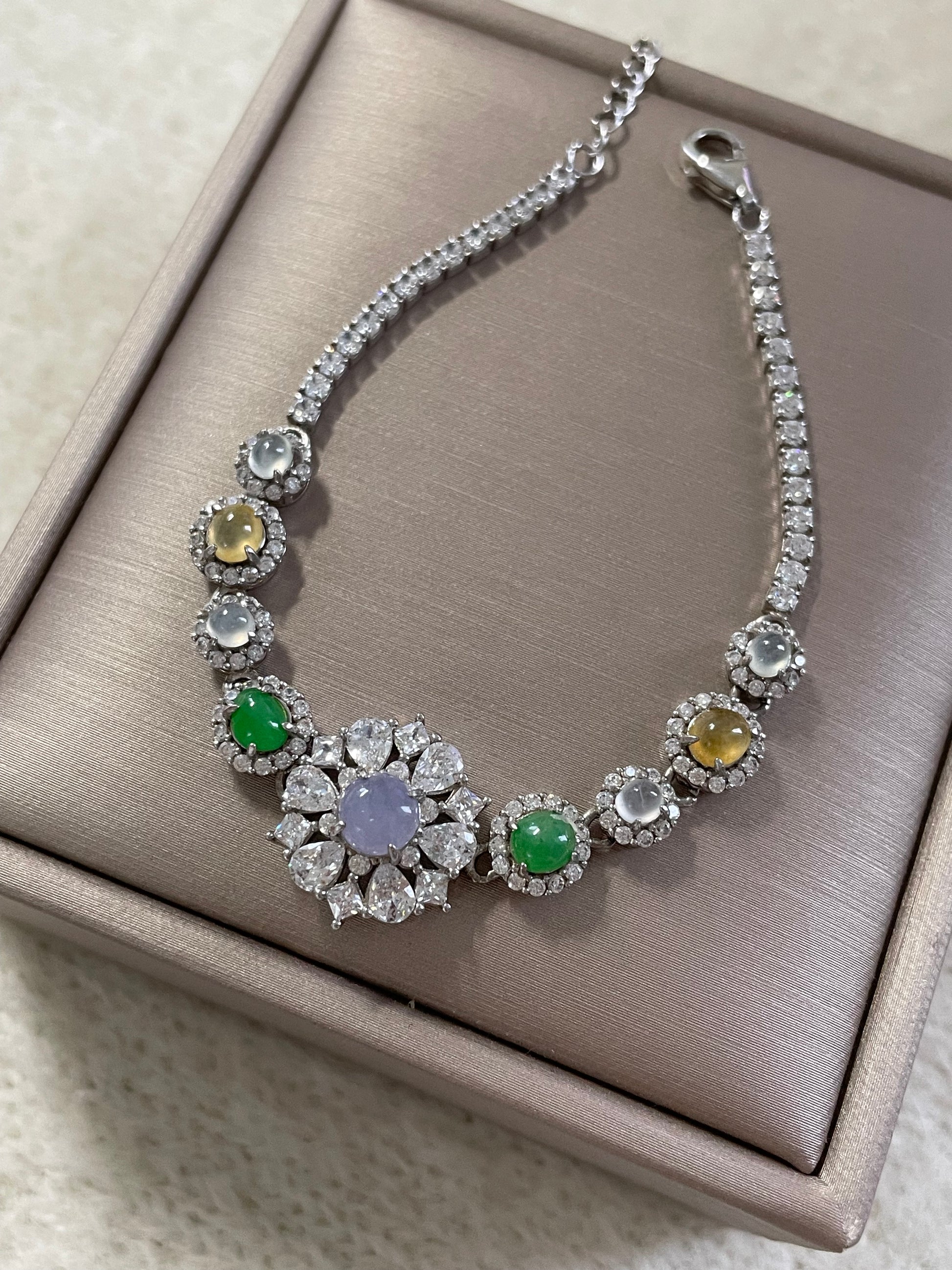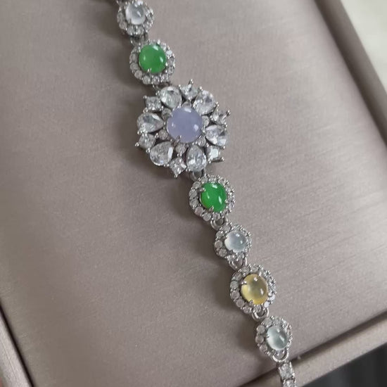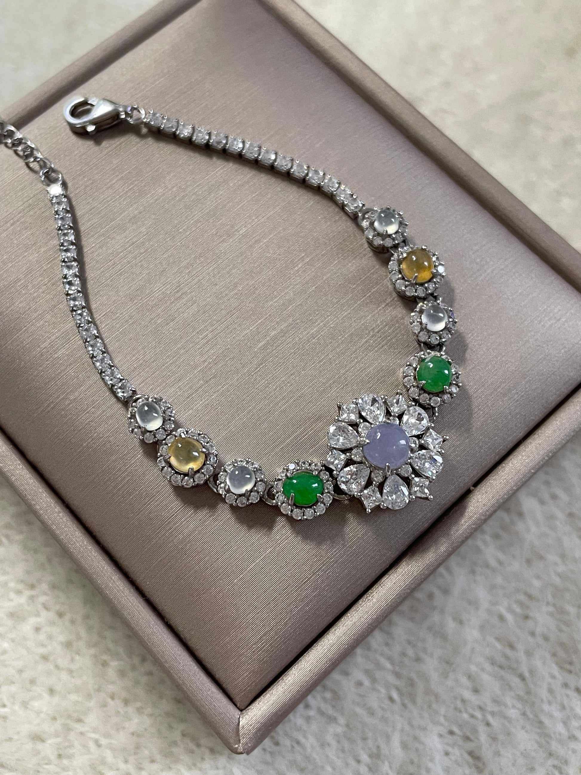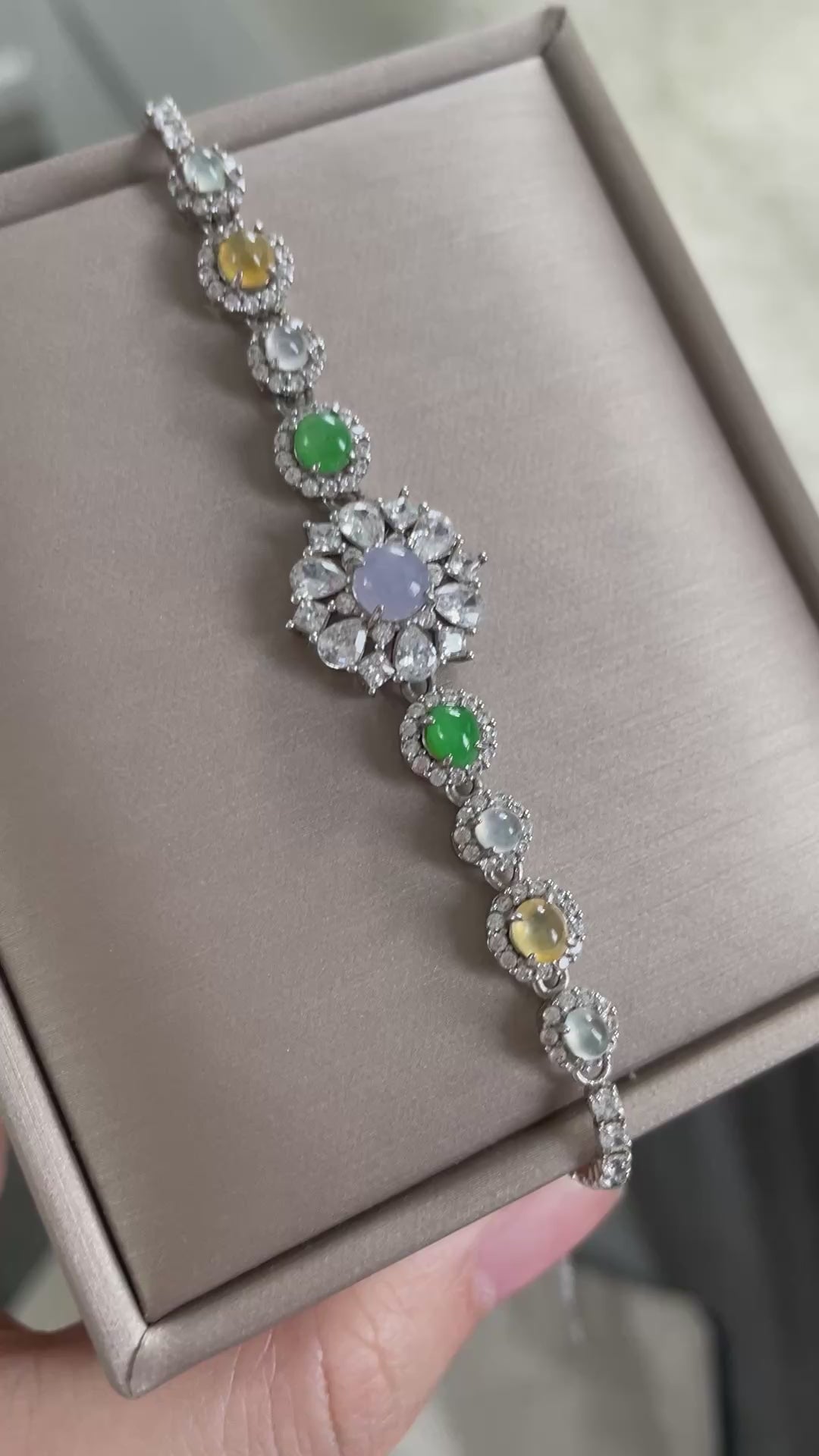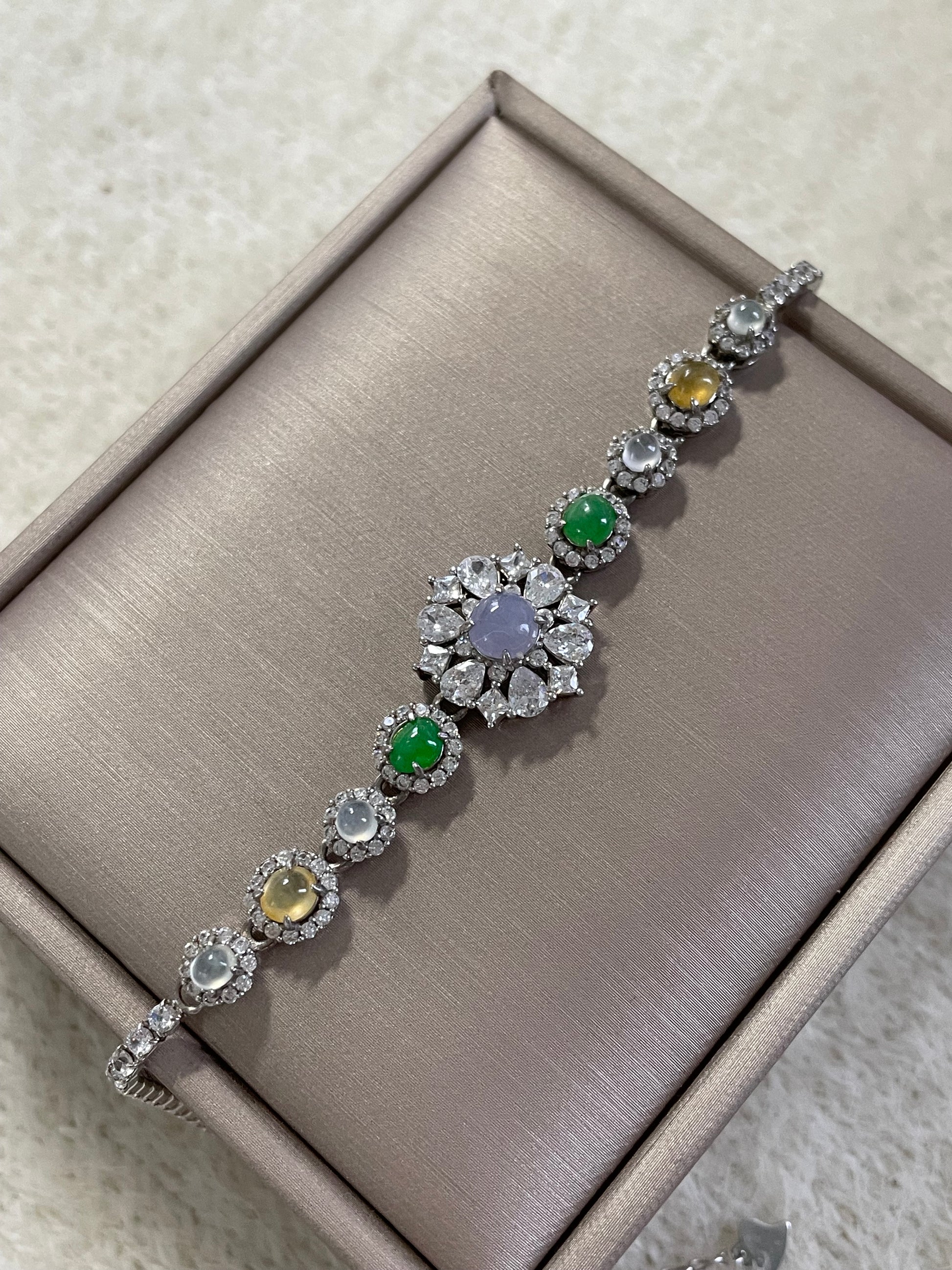 手链以紫罗兰翡翠为中心位,搭配阳绿翡翠、白冰翡翠、黄翡等多彩蛋面组合。主位紫罗兰蛋面满紫有种水,周围镶嵌锆石整体造型如盛放花朵。两侧多颗不同色系翡翠蛋面延展排列,色系丰富又和谐,阳绿明亮抢眼、白冰清透干净、黄翡温柔甜美,整条手链呈现高级珠宝的精致感。