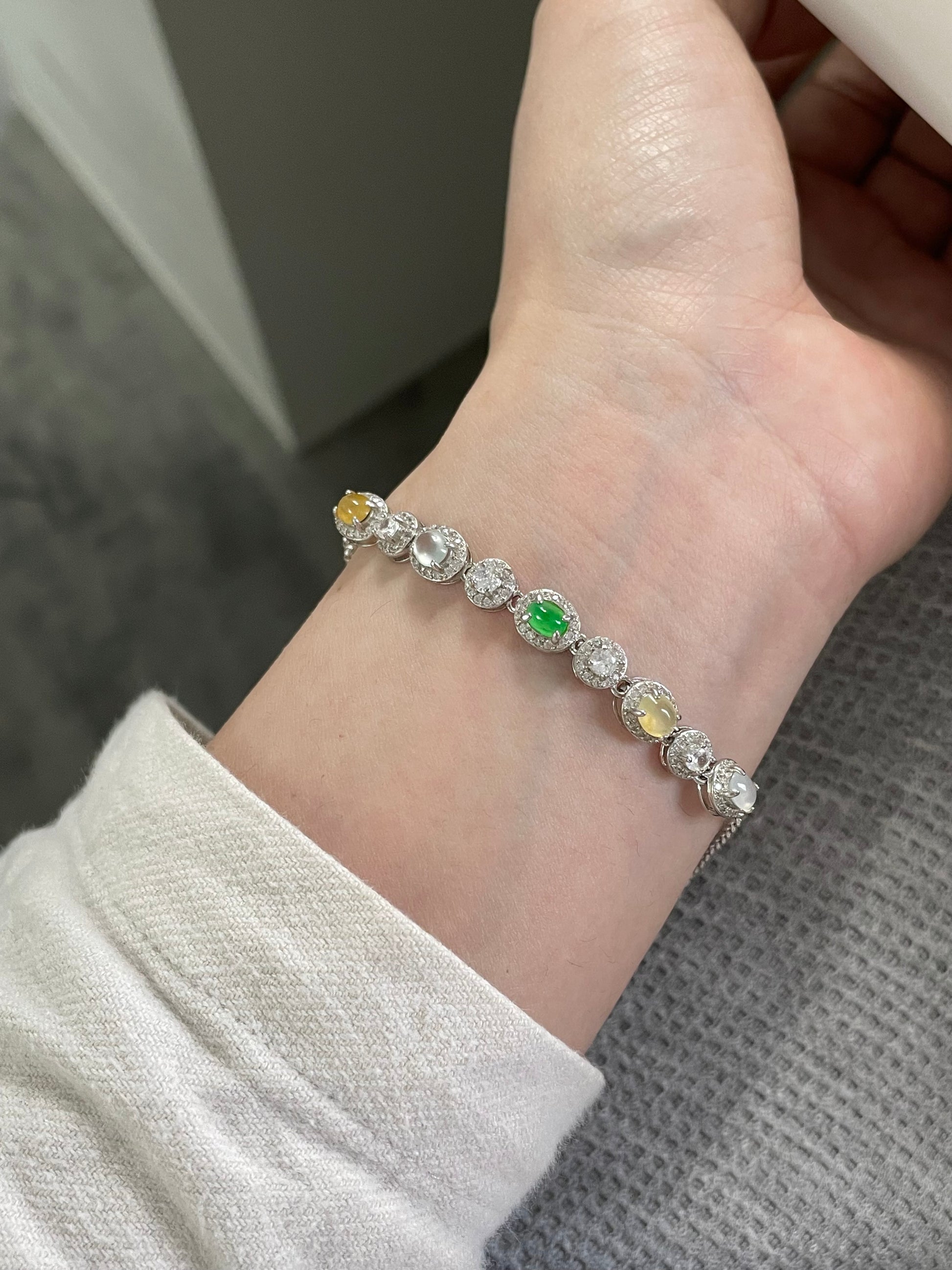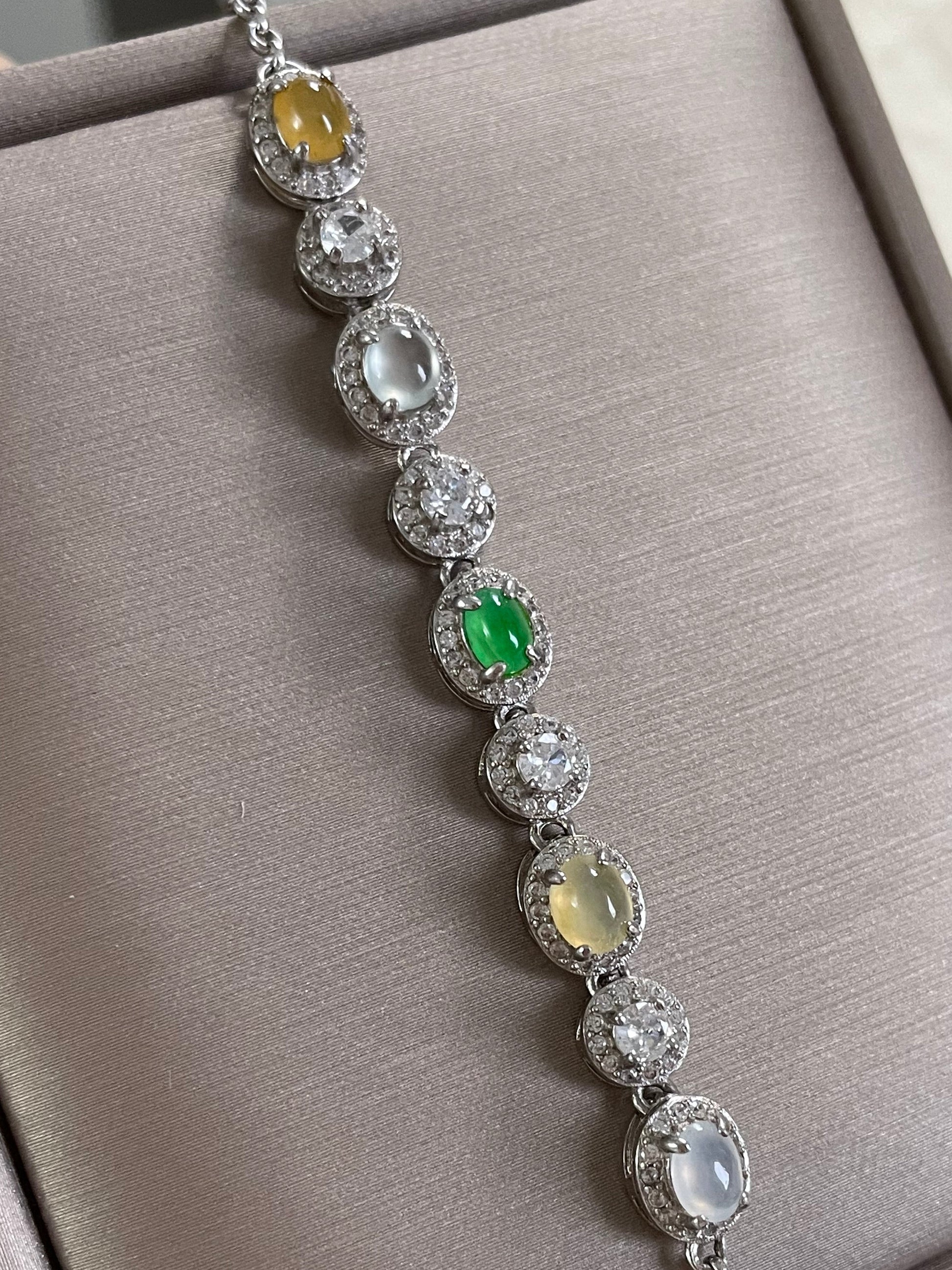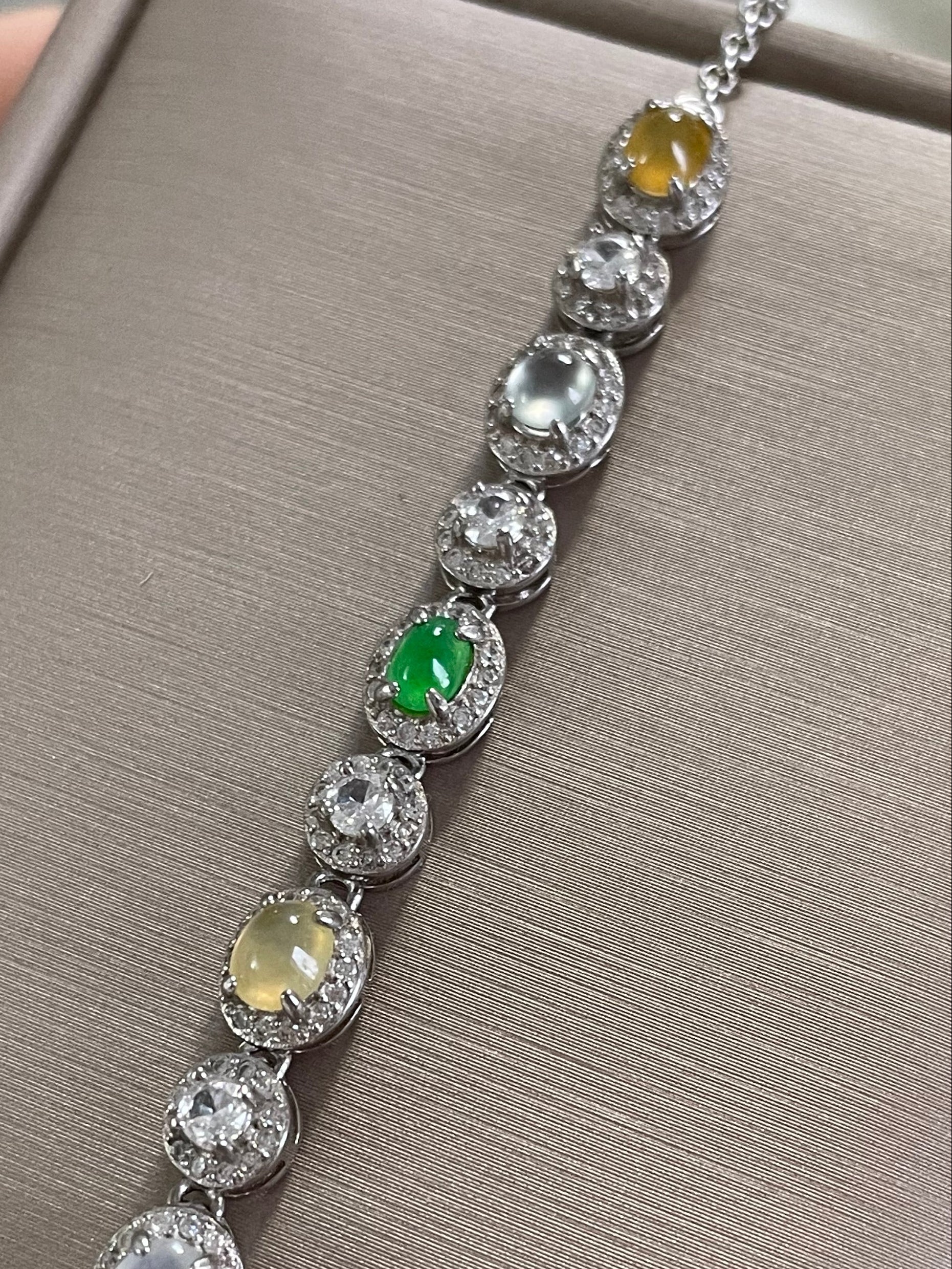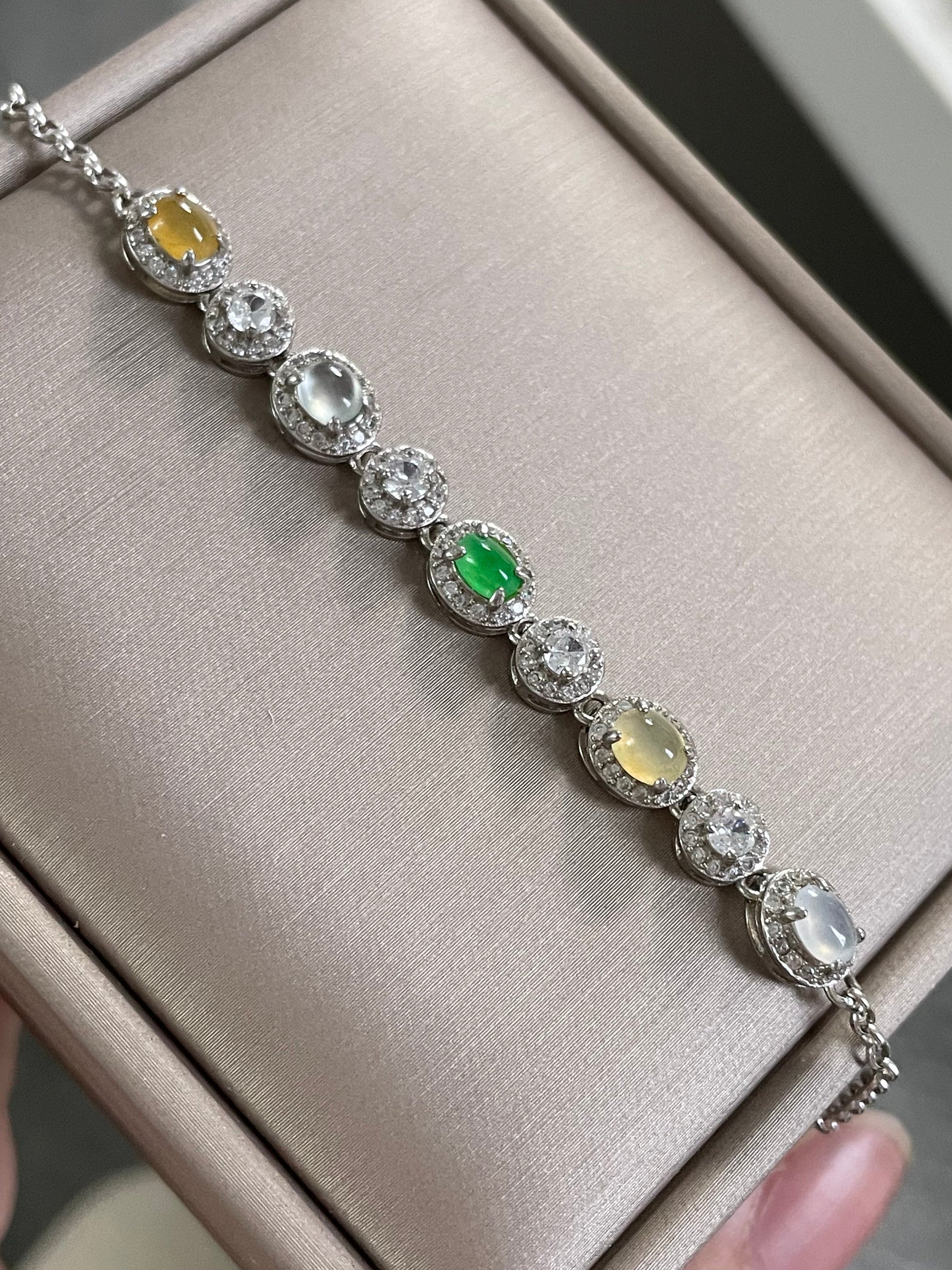 手链由多颗不同色系的翡翠蛋面组成,包含阳绿翡翠、黄翡、白冰底翡翠等多彩组合,有种有色的一条,特别是绿蛋面,远看都是很亮眼的存在,白冰蛋面也是高冰到玻璃种的品质,起莹起光,很抢眼的存在;整体蛋面圆润饱满,每颗主石均以925银镶嵌满钻锆石包边,整体很有珠宝感,上手手腕精致又高级。