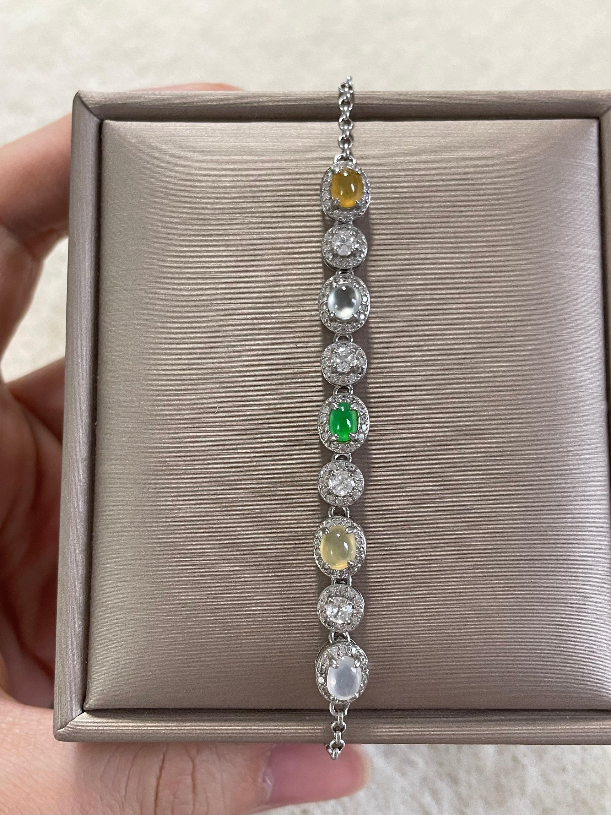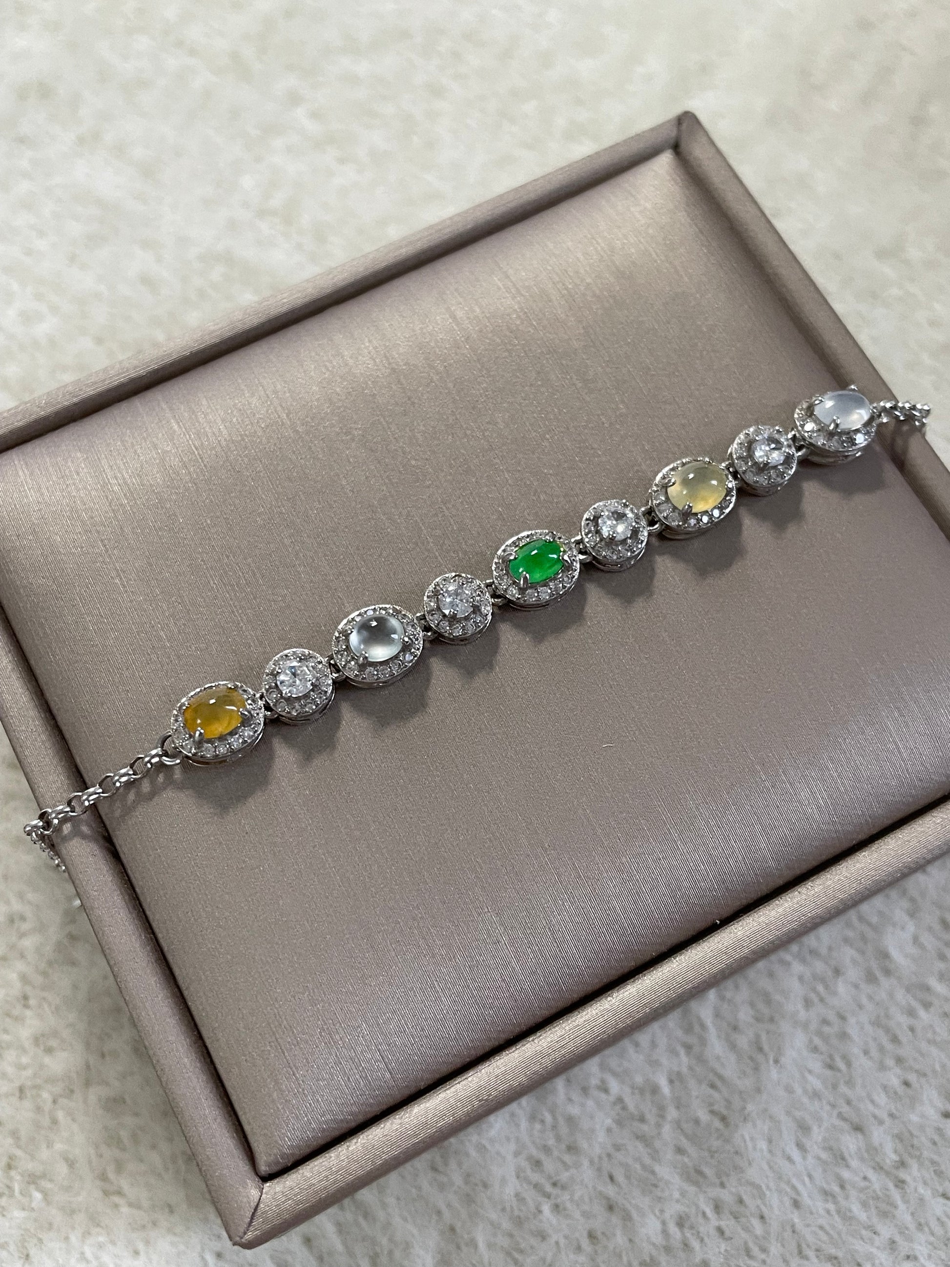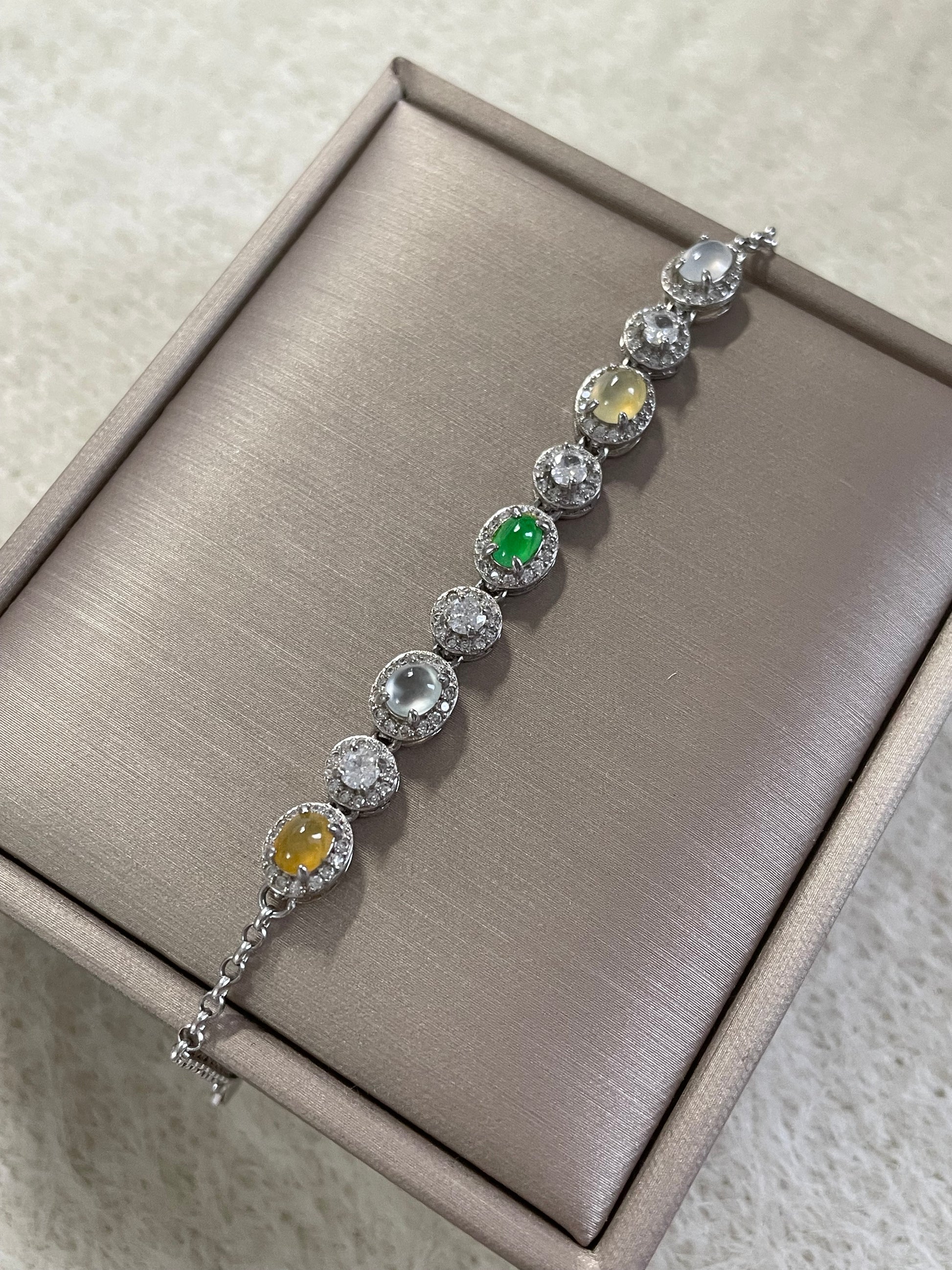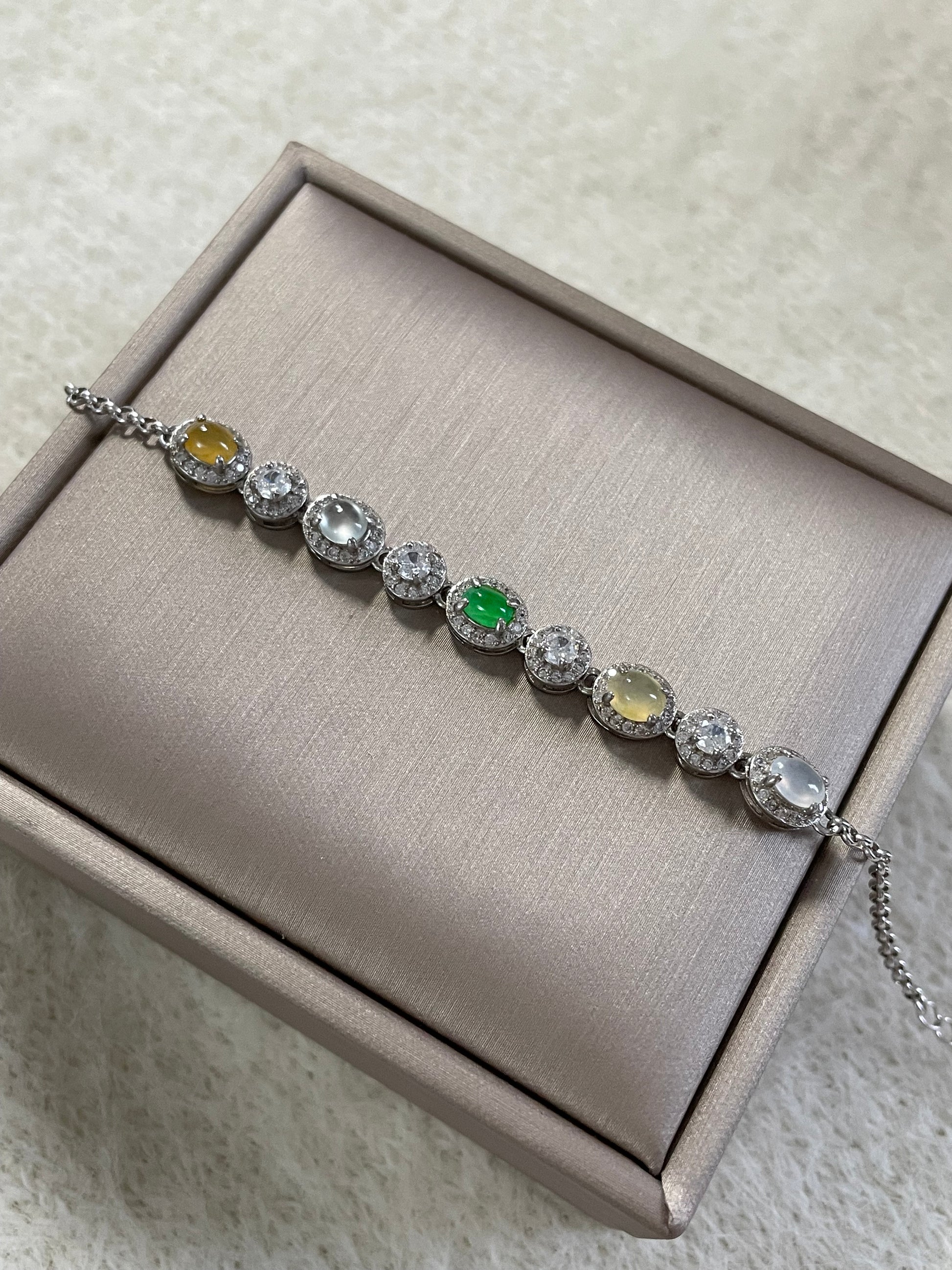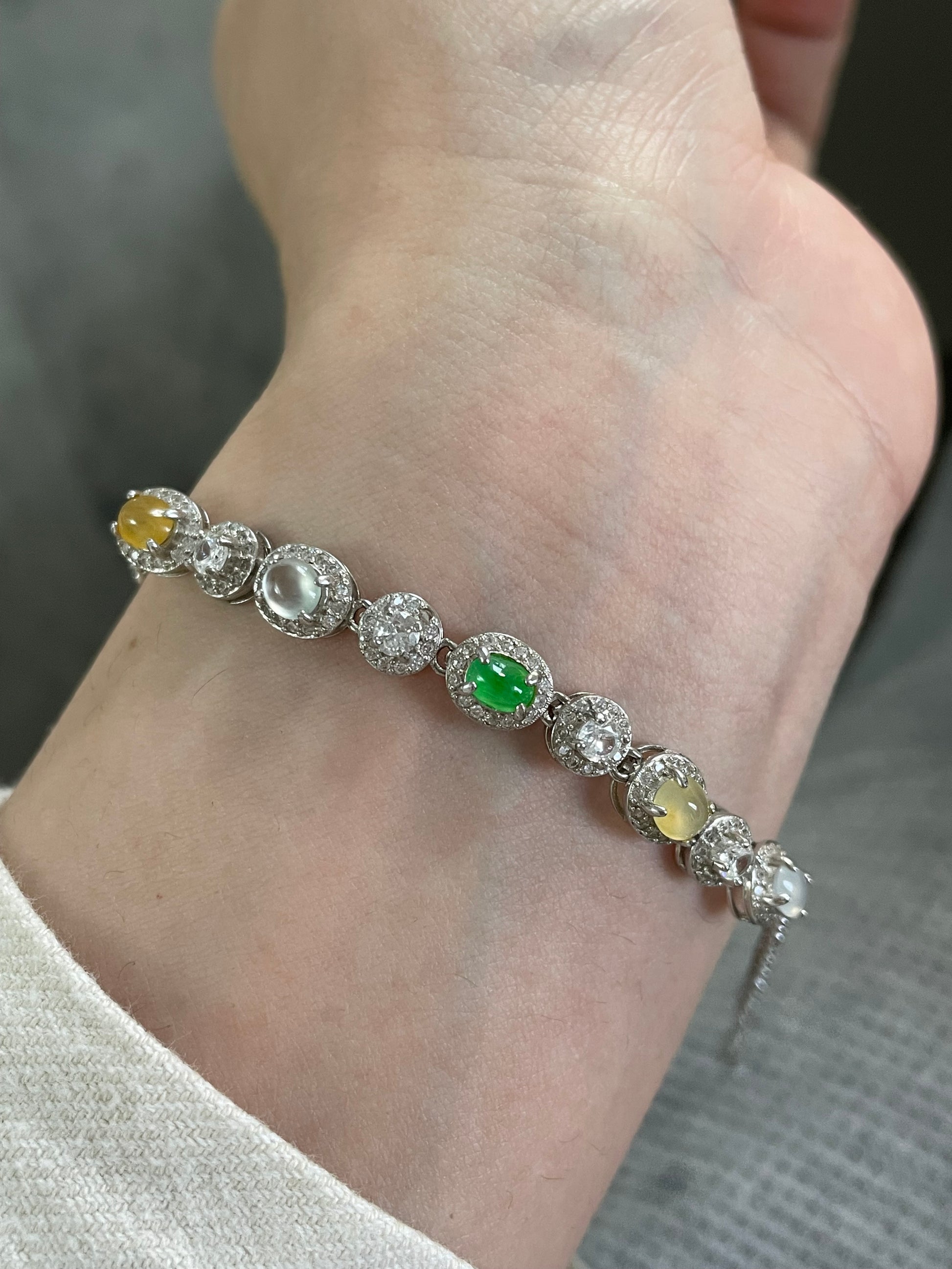 手链由多颗不同色系的翡翠蛋面组成,包含阳绿翡翠、黄翡、白冰底翡翠等多彩组合,有种有色的一条,特别是绿蛋面,远看都是很亮眼的存在,白冰蛋面也是高冰到玻璃种的品质,起莹起光,很抢眼的存在;整体蛋面圆润饱满,每颗主石均以925银镶嵌满钻锆石包边,整体很有珠宝感,上手手腕精致又高级。