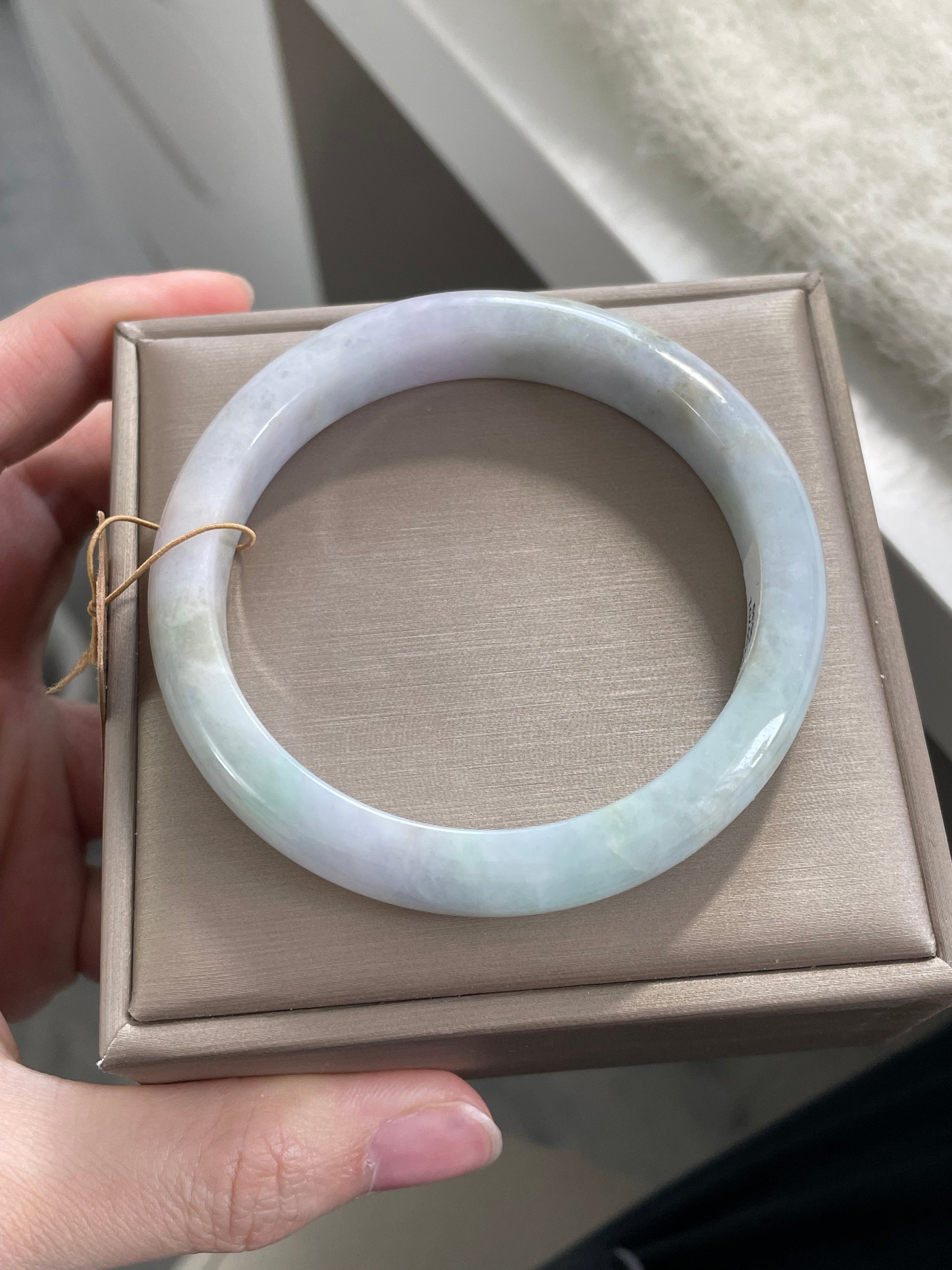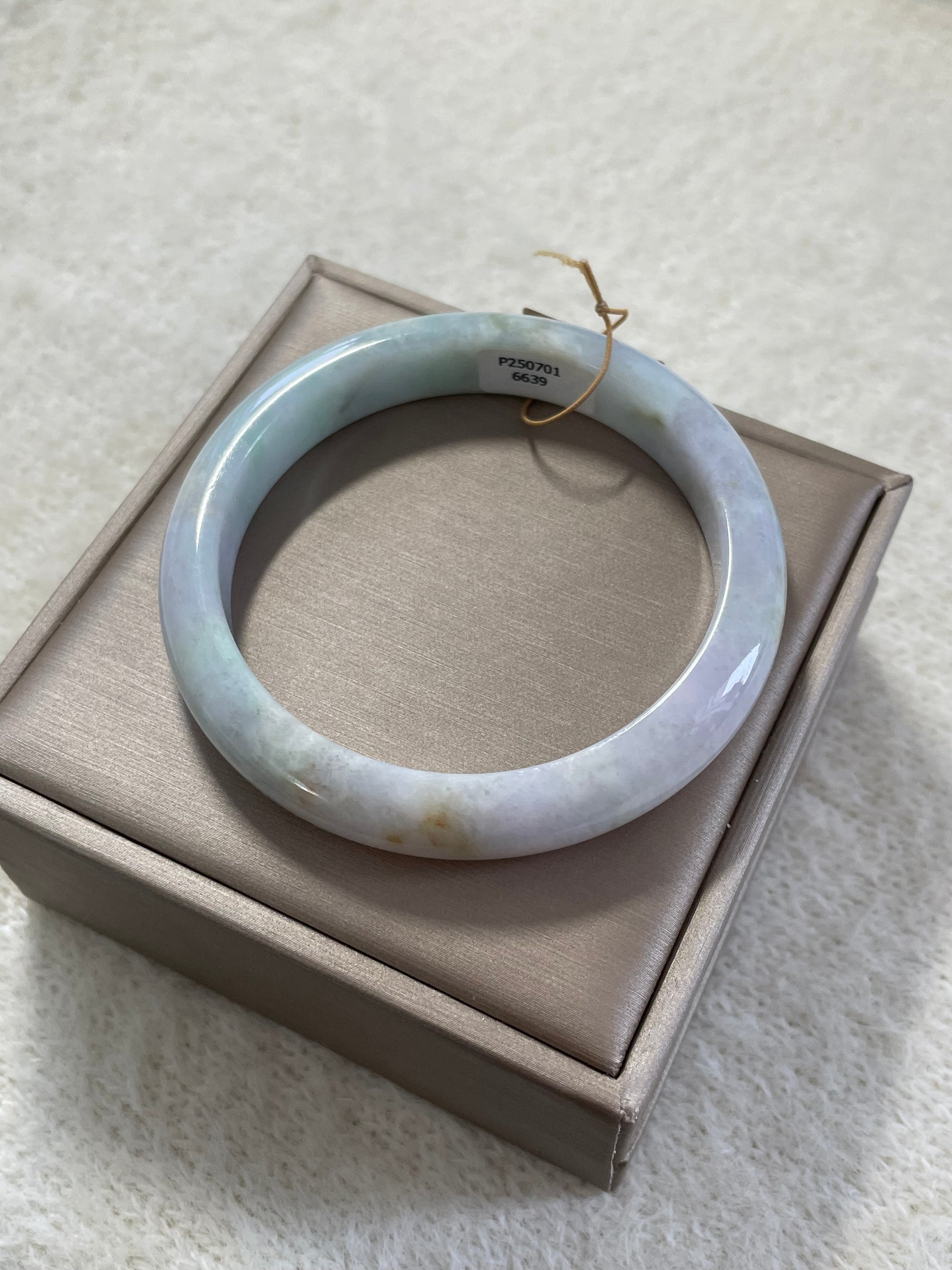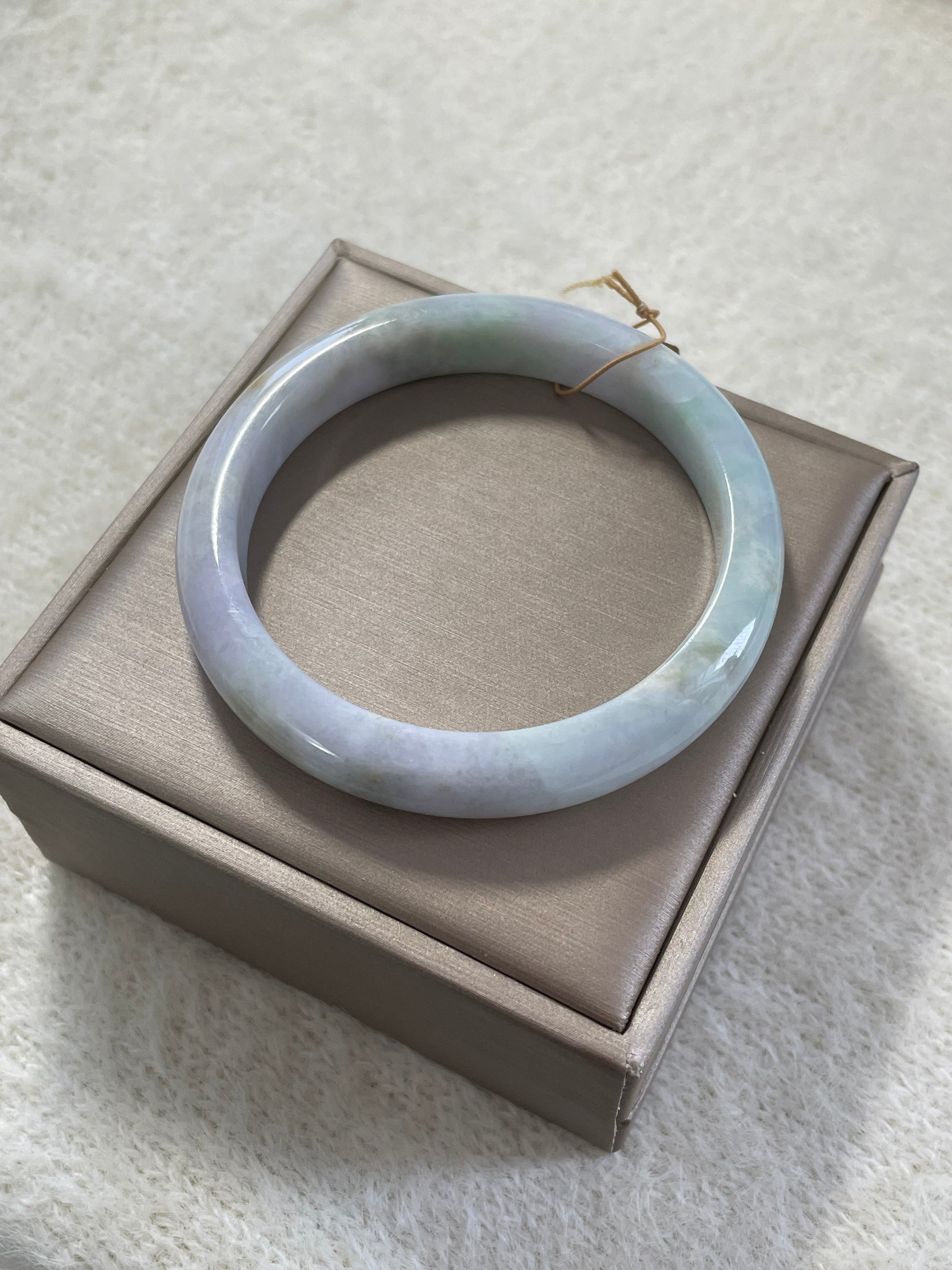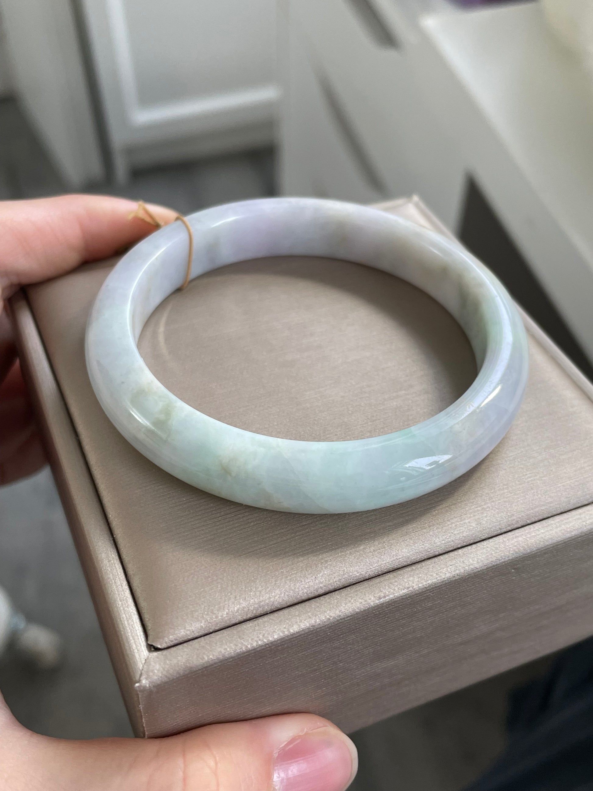 天然缅甸翡翠手镯,底色以浅紫浅绿为主,带少许黄色小雏菊点缀,很有花丛的氛围感。整体干净柔和,颜色过渡细腻,日常佩戴柔和耐看。