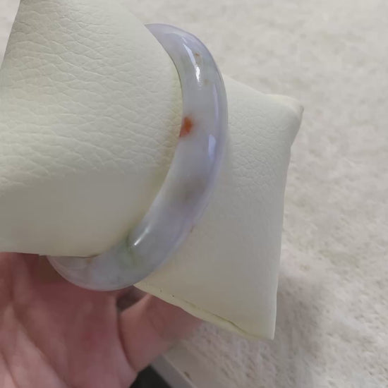 天然缅甸翡翠贵妃条形手镯,整体色调柔和多彩,带紫底,红、绿色点缀,清新又有层次感,佩戴上手十分耐看。尺寸为 55.4–49.3mm,圈口52/53,条宽约 11.1mm,厚度约 7.2mm。