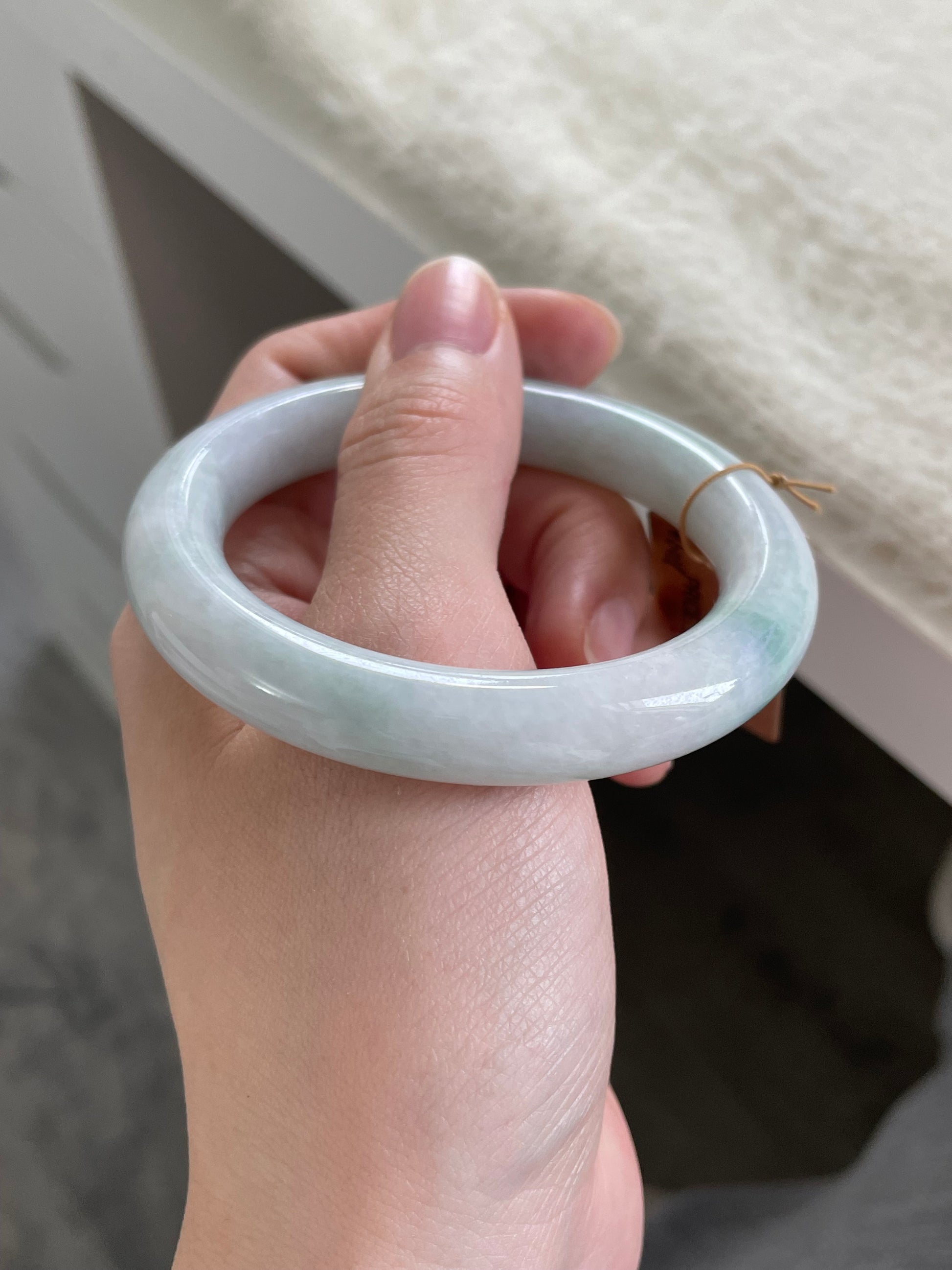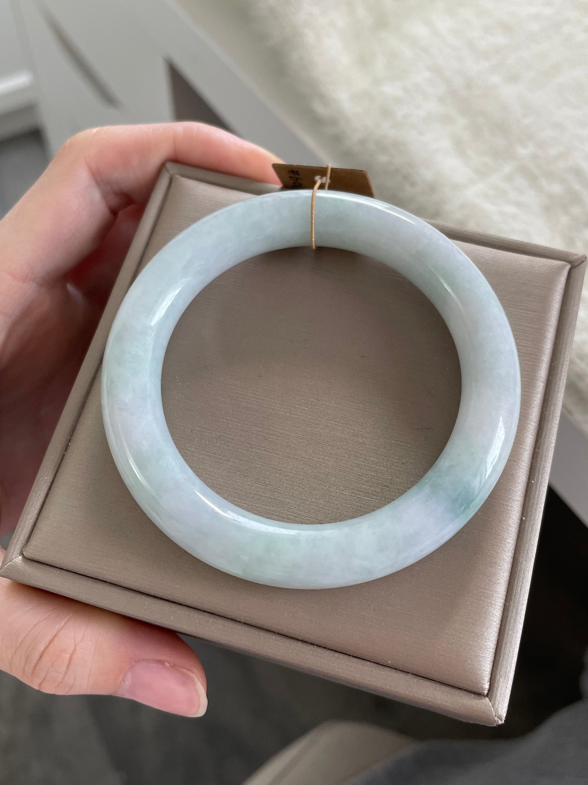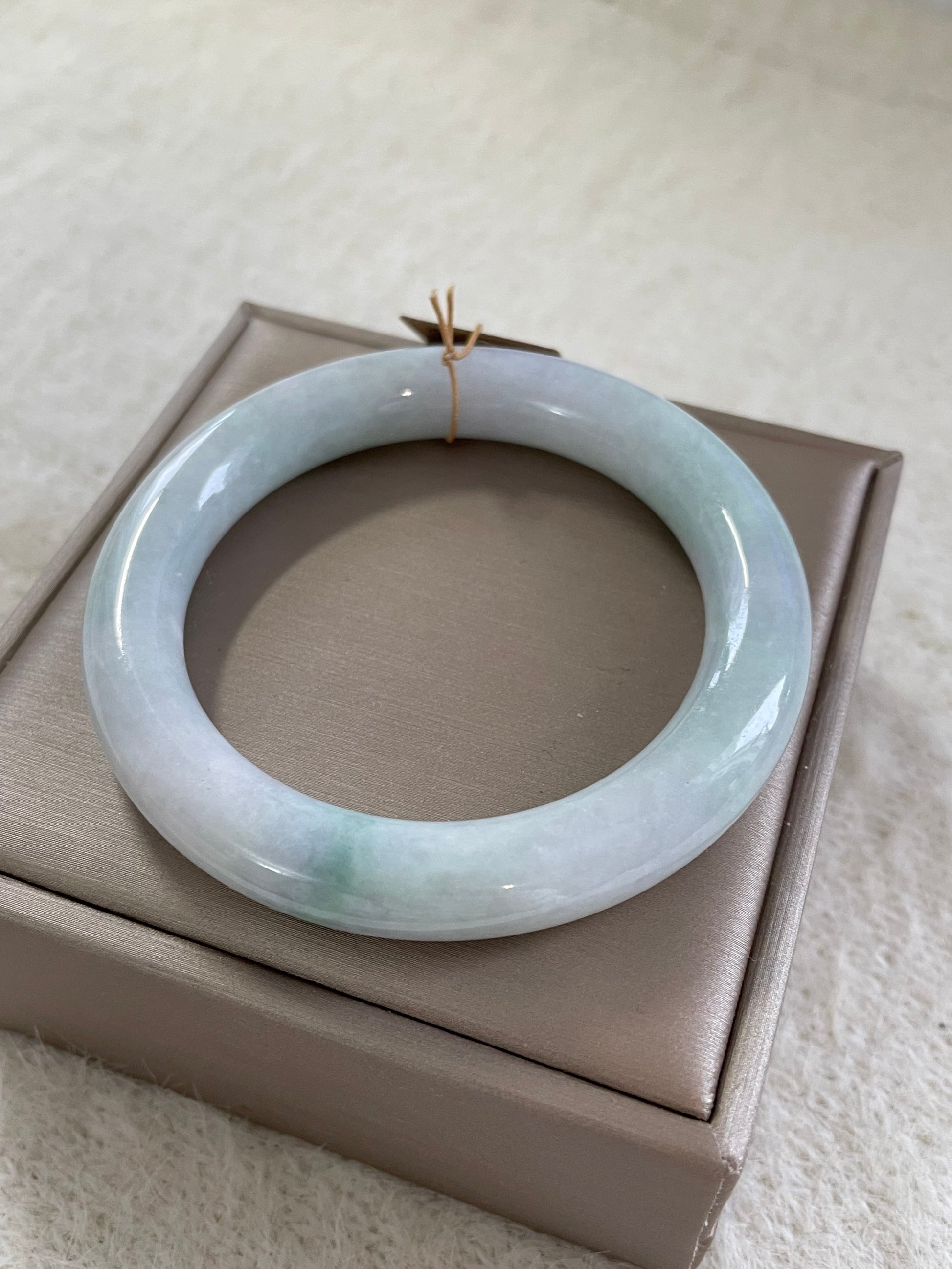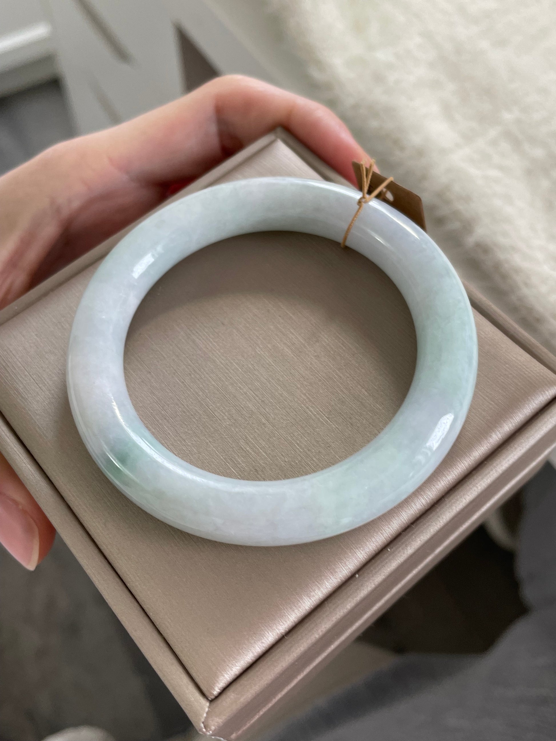 以浅绿色和牛奶白为底色,少量阳绿色和紫色点缀,颜色柔和干净,过渡的很自然,底子细腻,条形饱满圆润;上手显气质温柔耐看,适合日常佩戴通勤百搭;尺寸约 54mm,条宽约 9.4 mm,厚度约 9.4mm。