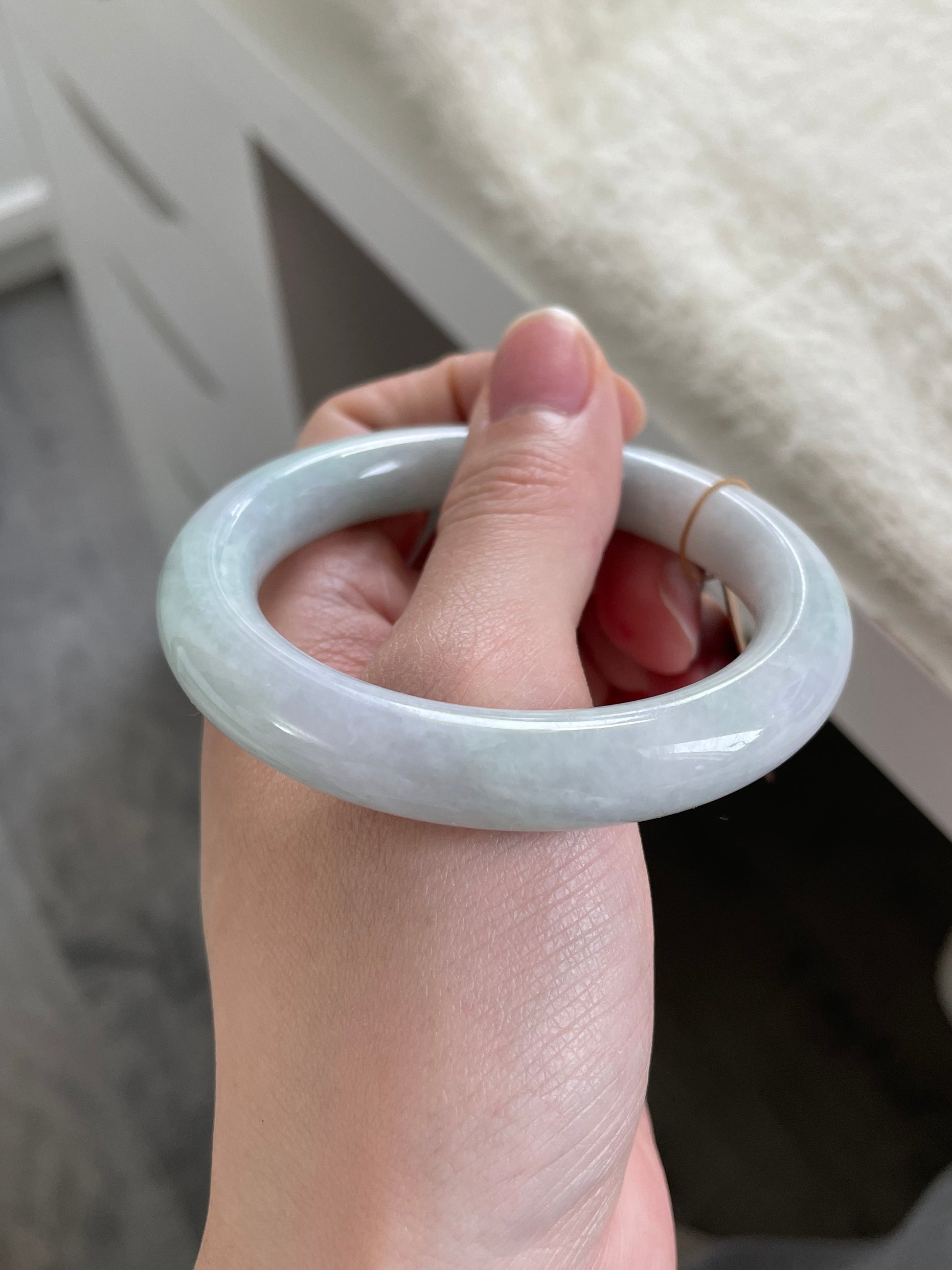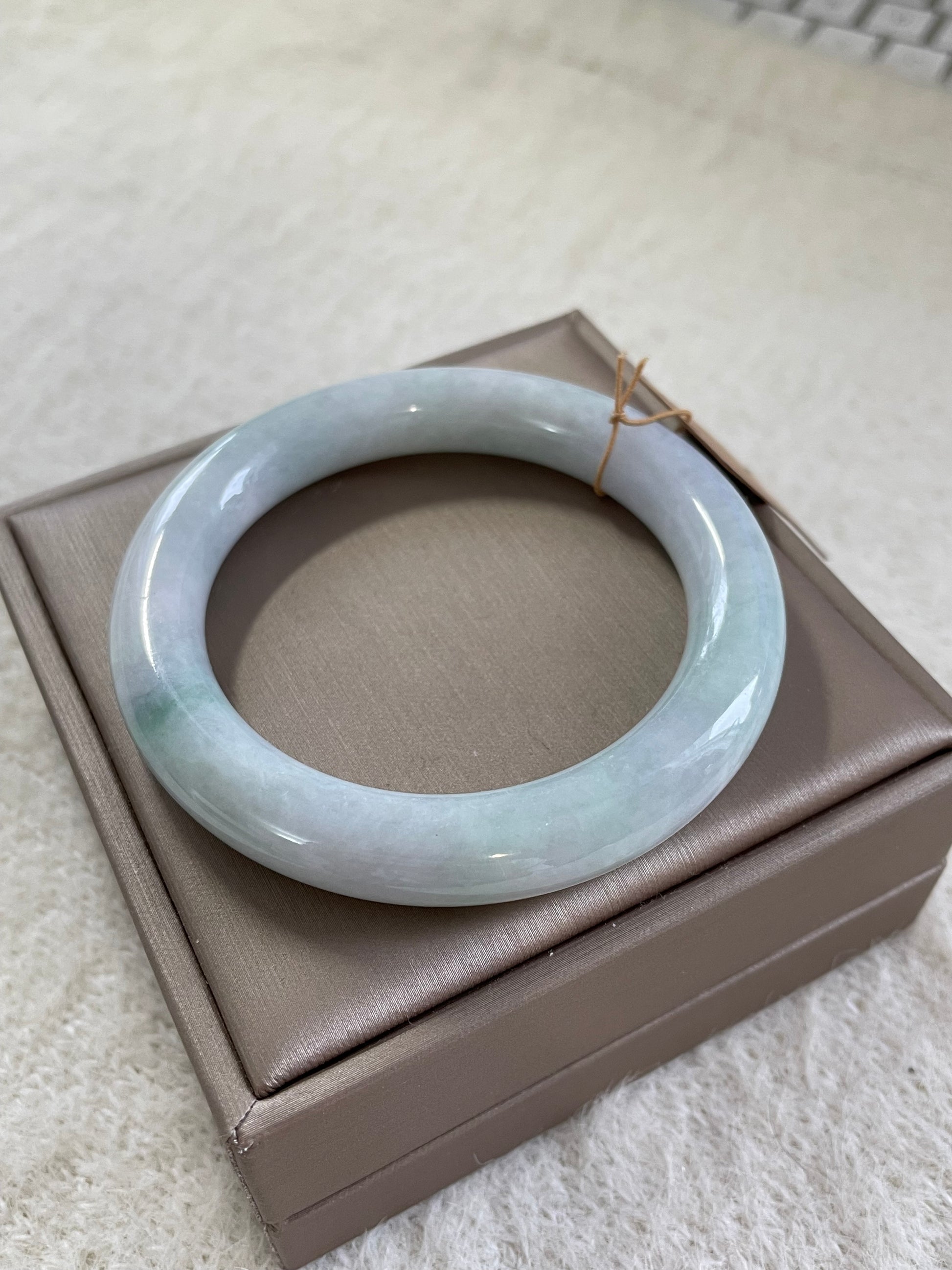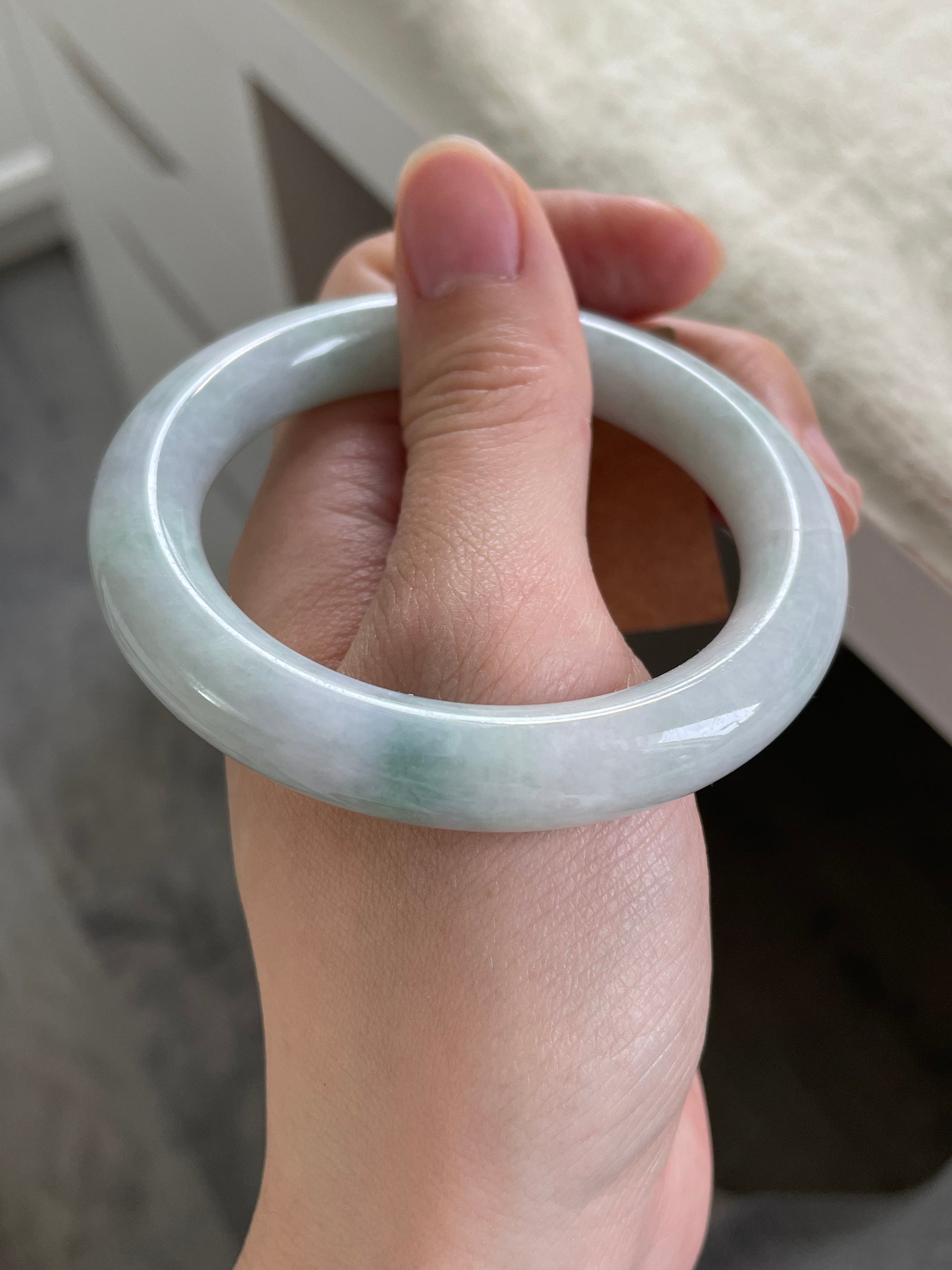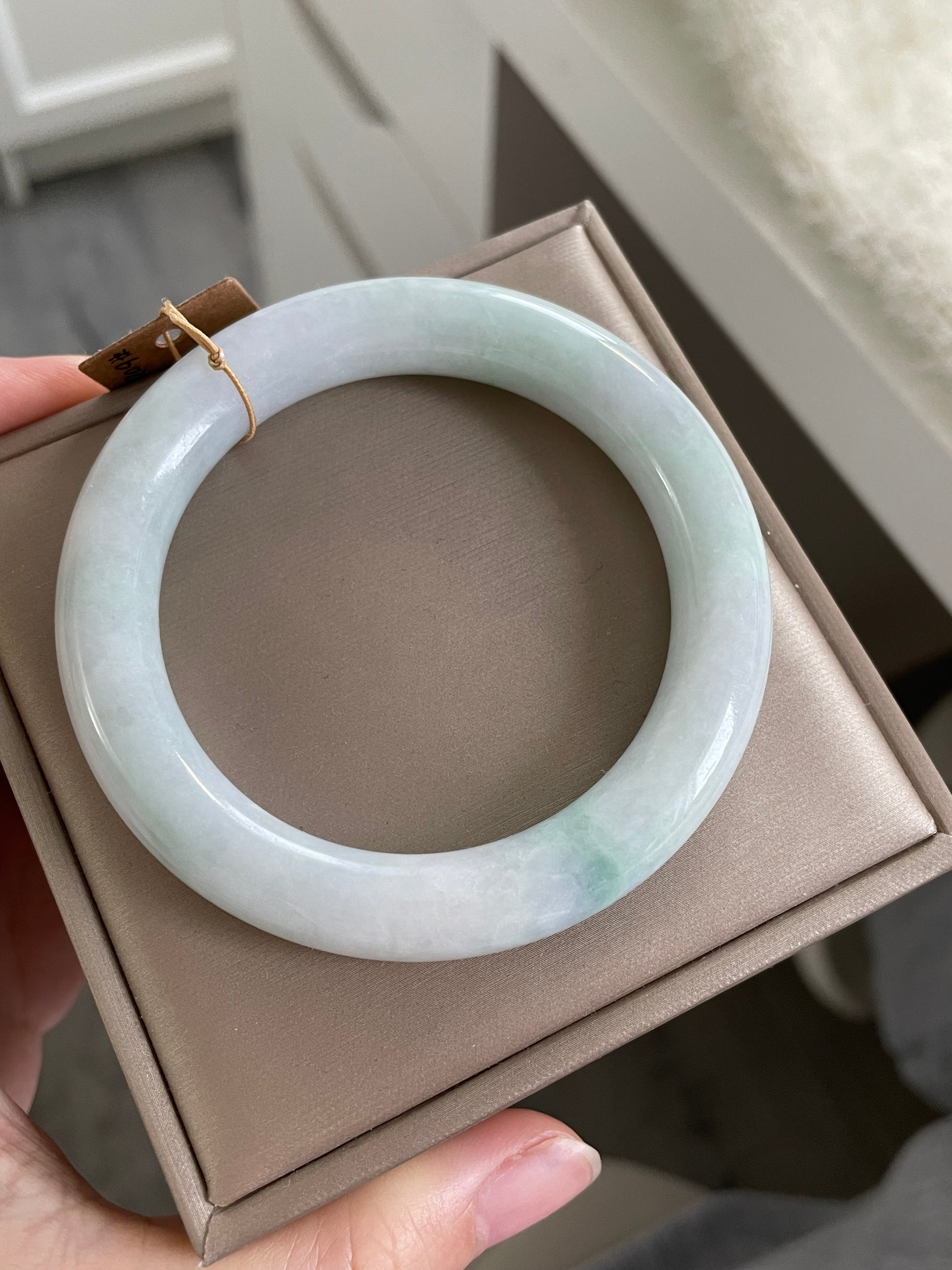 以浅绿色和牛奶白为底色,少量阳绿色和紫色点缀,颜色柔和干净,过渡的很自然,底子细腻,条形饱满圆润;上手显气质温柔耐看,适合日常佩戴通勤百搭;尺寸约 54mm,条宽约 9.4 mm,厚度约 9.4mm。