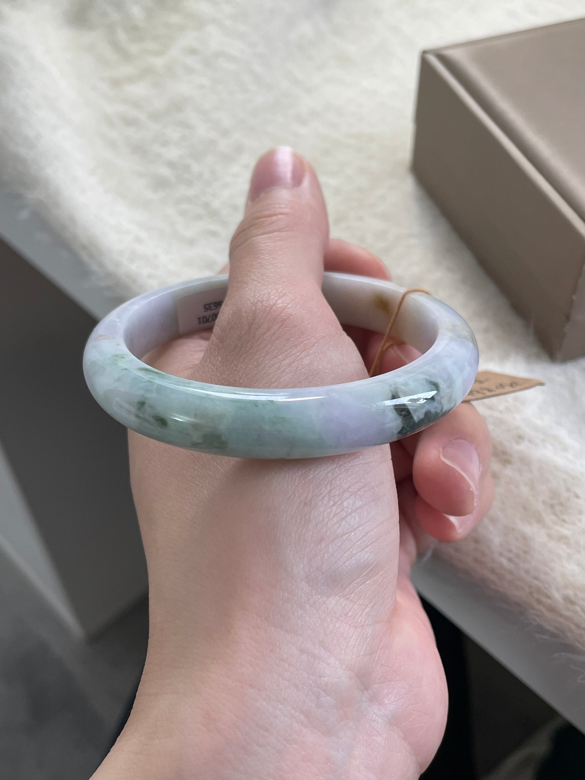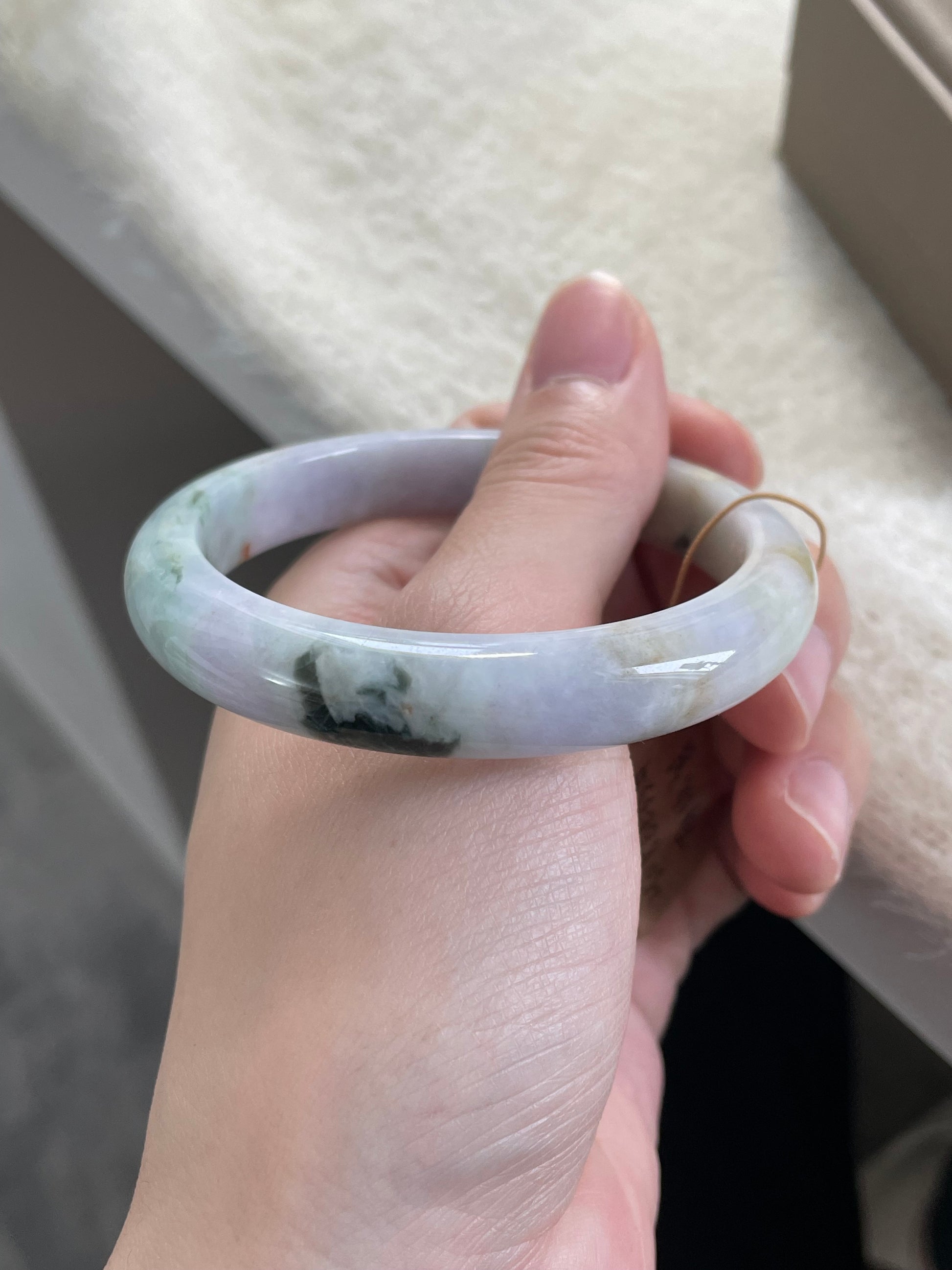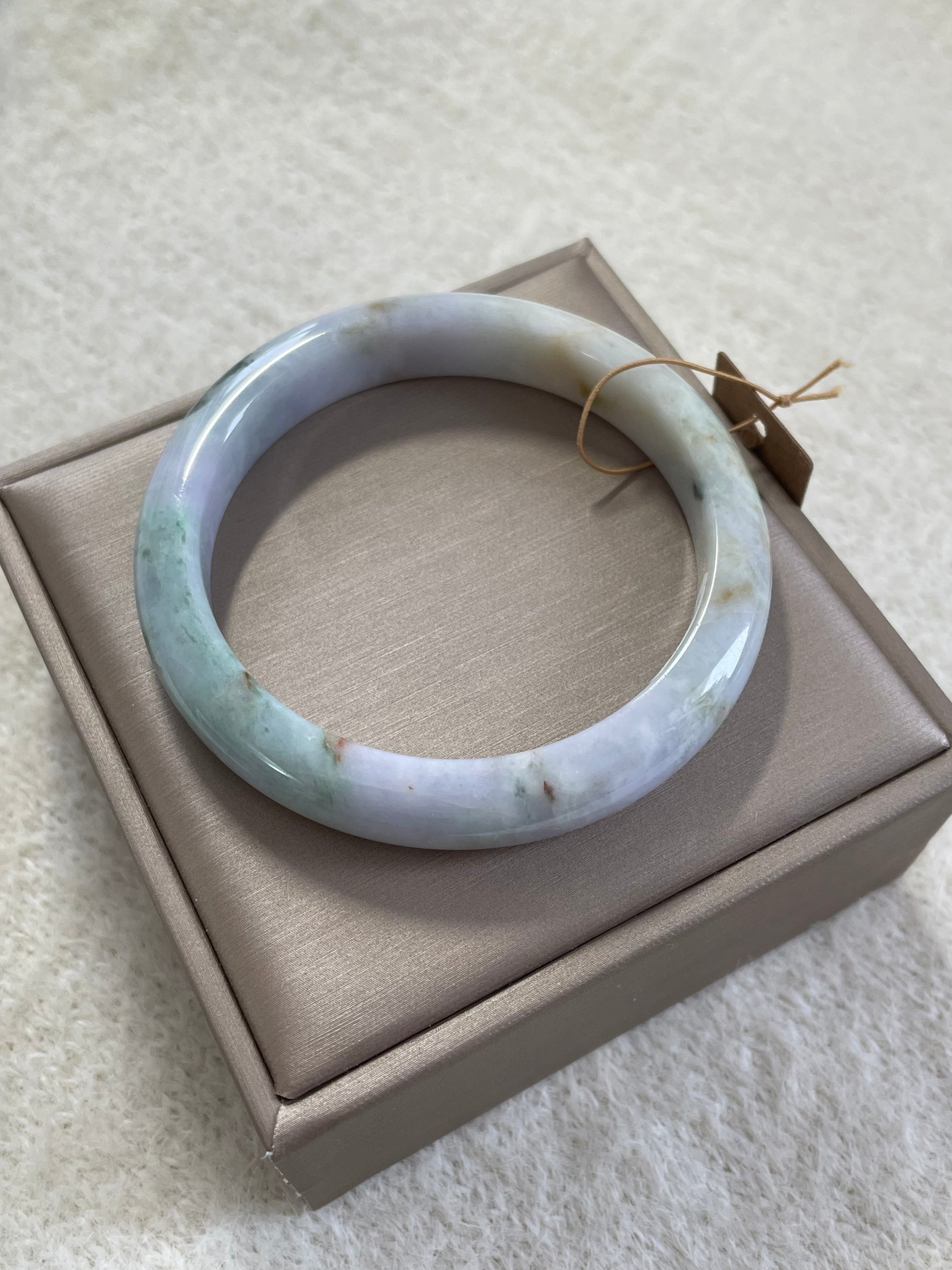 天然缅甸翡翠手镯,底色以柔和的淡紫与浅绿为主,点缀少量绿色、黄翡与红翡色调,颜色分布自然,整体有莫奈花园的氛围感,柔和耐看。尺寸为57.1mm,条宽约 10.2mm,厚度约 7.7mm。