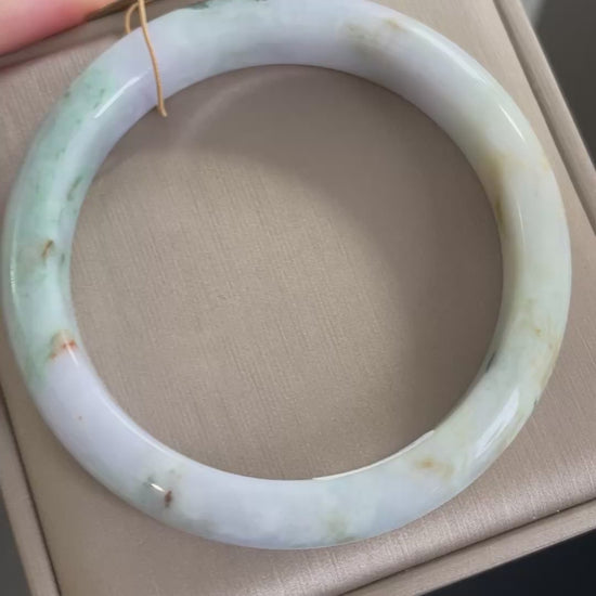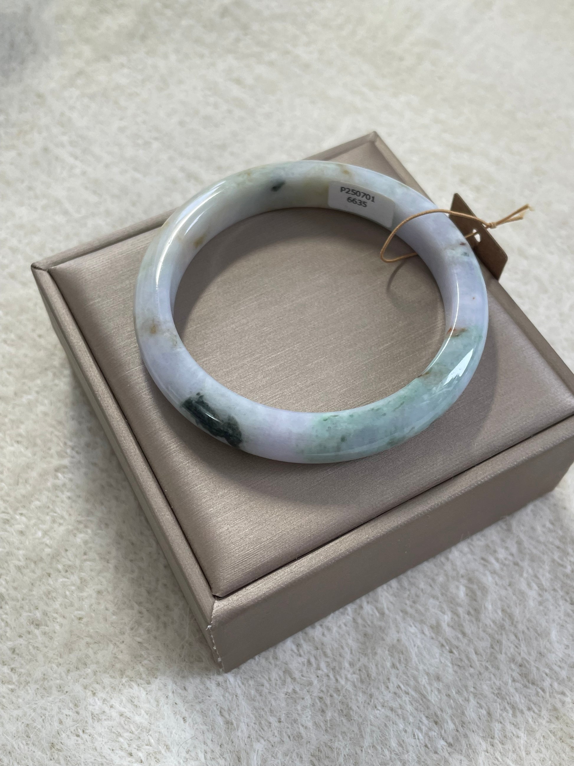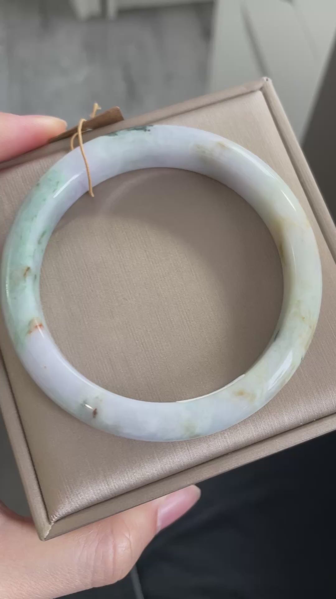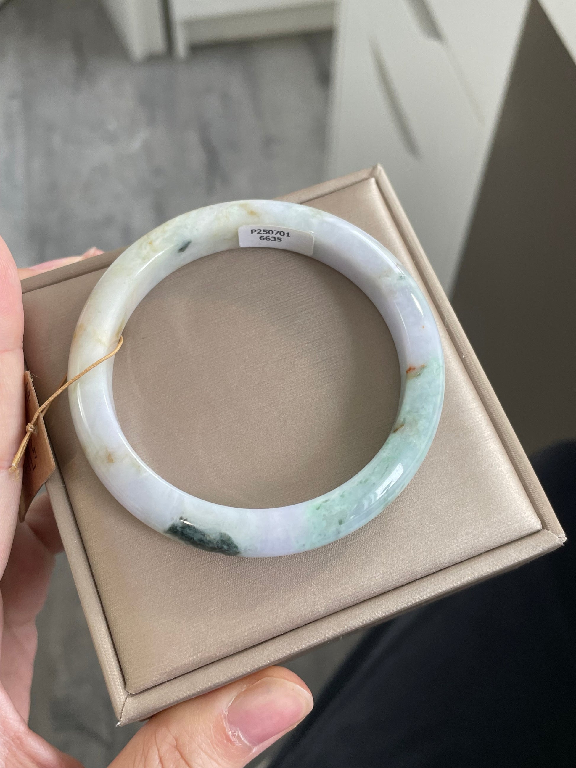 天然缅甸翡翠手镯,底色以柔和的淡紫与浅绿为主,点缀少量绿色、黄翡与红翡色调,颜色分布自然,整体有莫奈花园的氛围感,柔和耐看。尺寸为57.1mm,条宽约 10.2mm,厚度约 7.7mm。