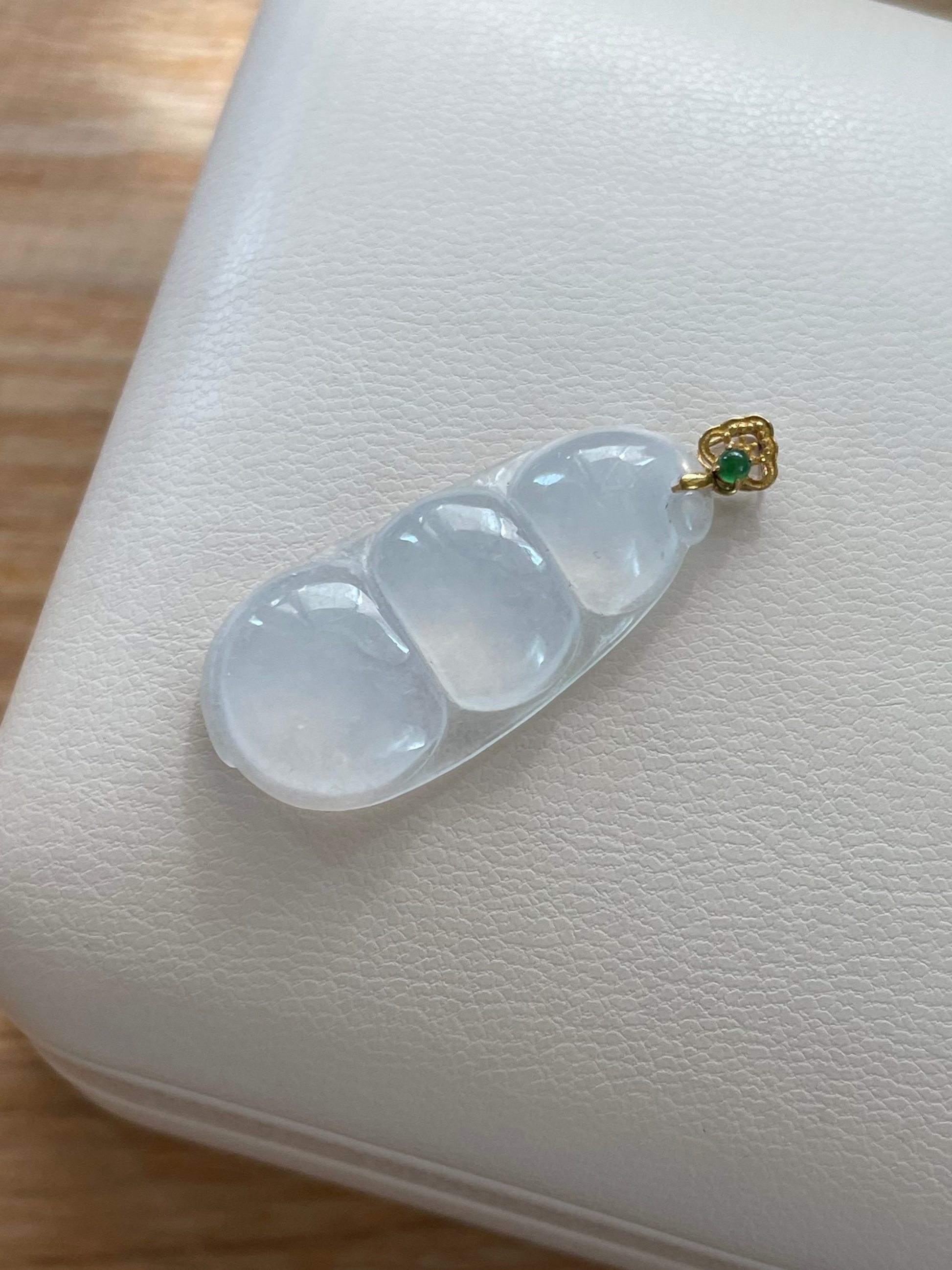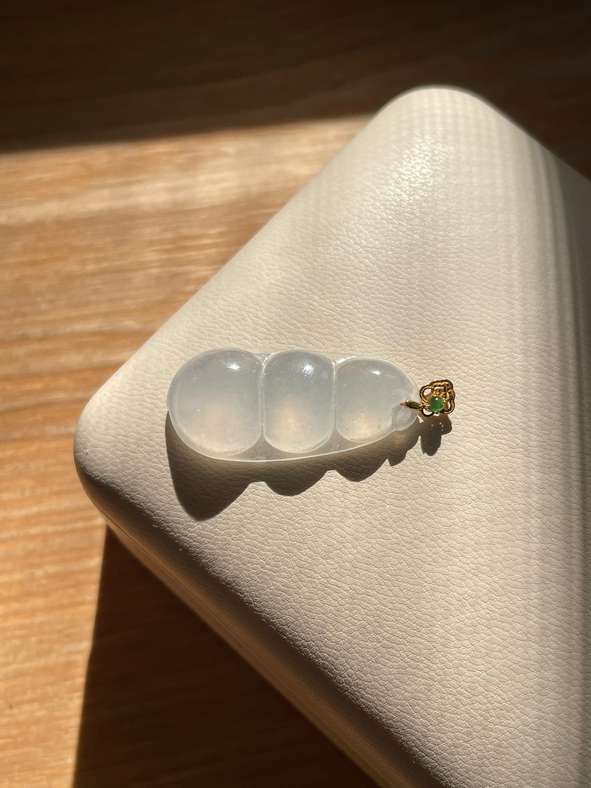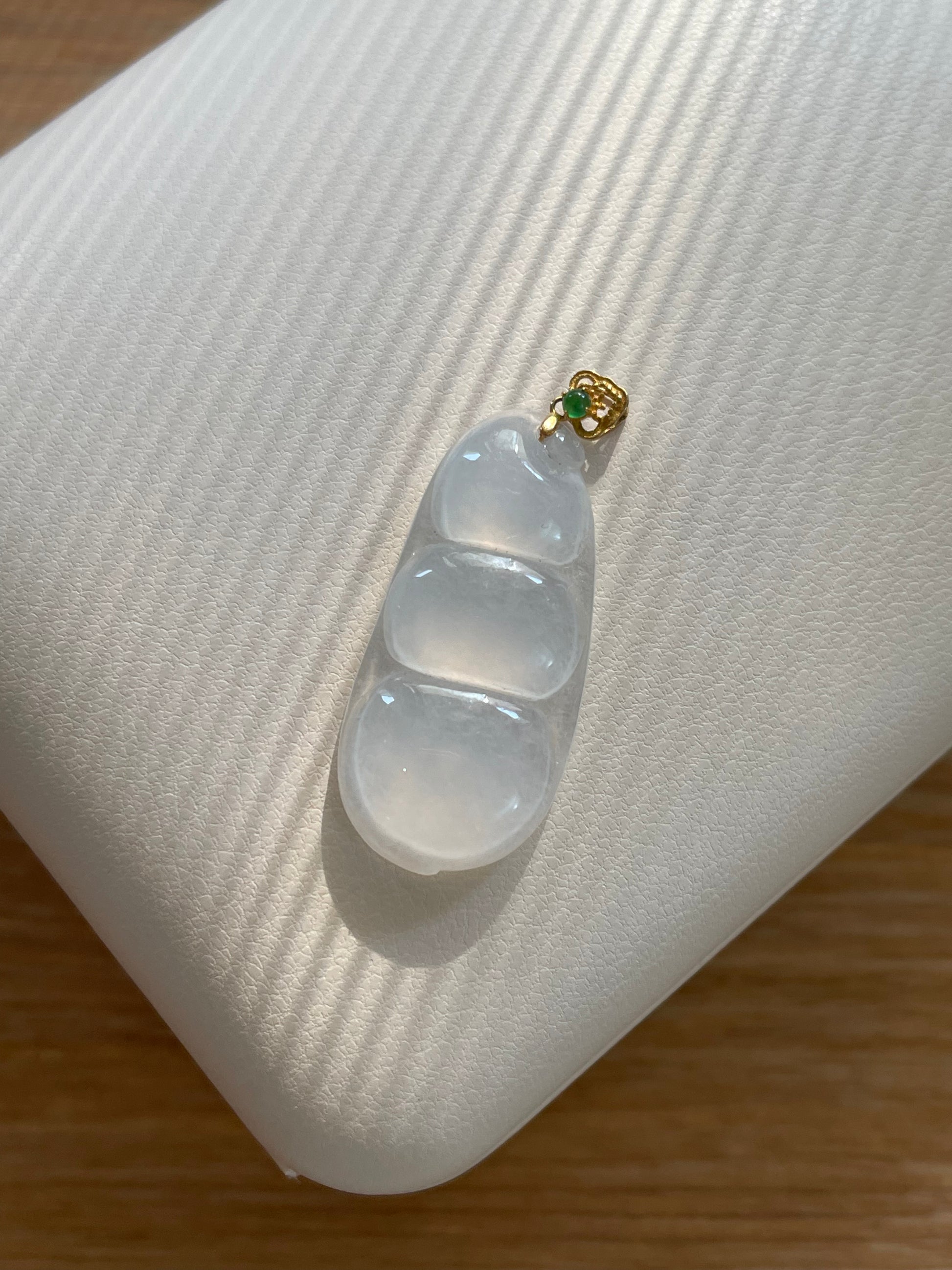 冰透起莹起光,底可透手,福豆寓意好,18k金扣头,裸石约29.4 × 13.8 × 4.2mm,含镶嵌整体约34.5 × 13.8 × 4.2mm,天然缅甸翡翠a货带证书。