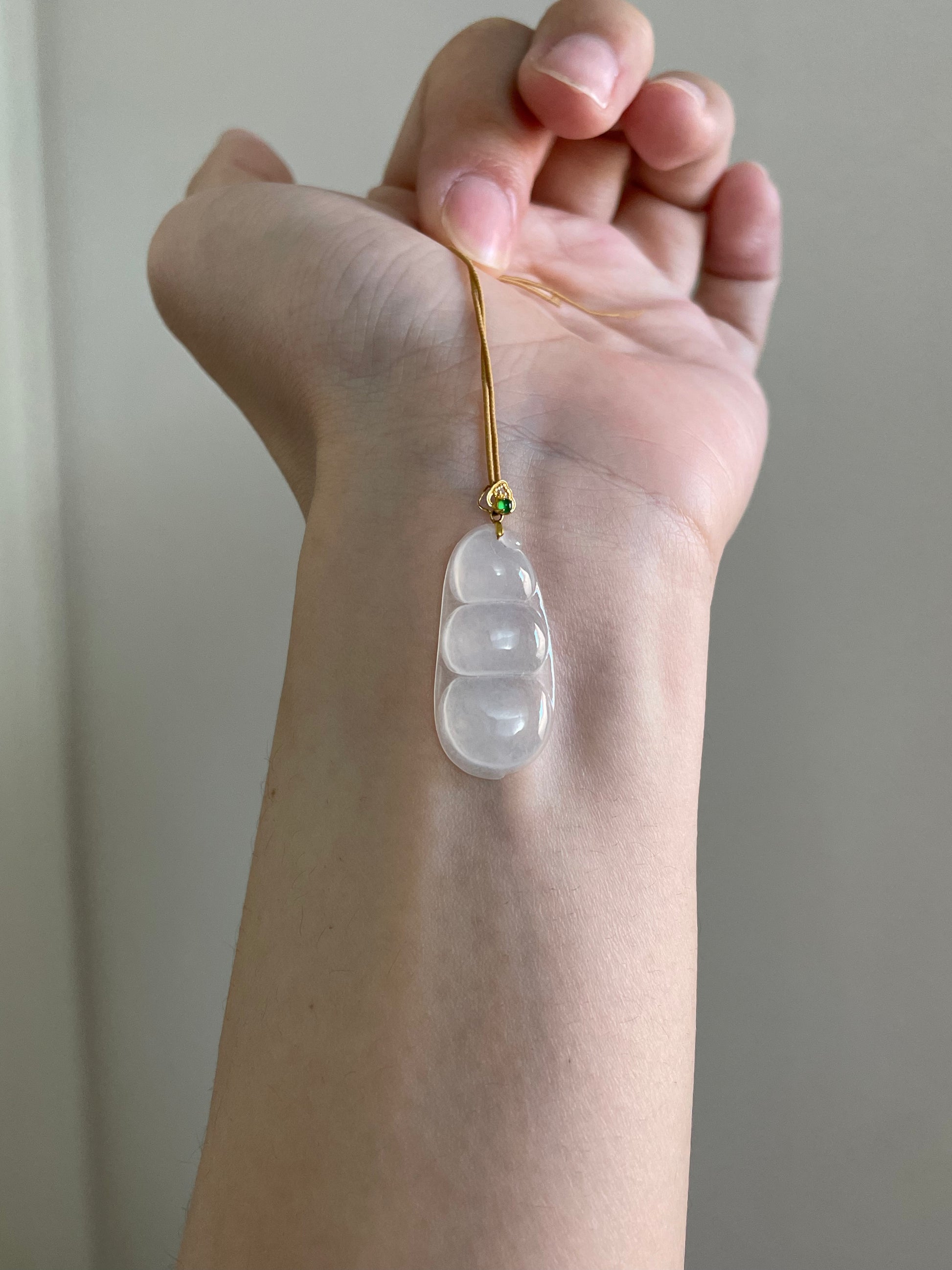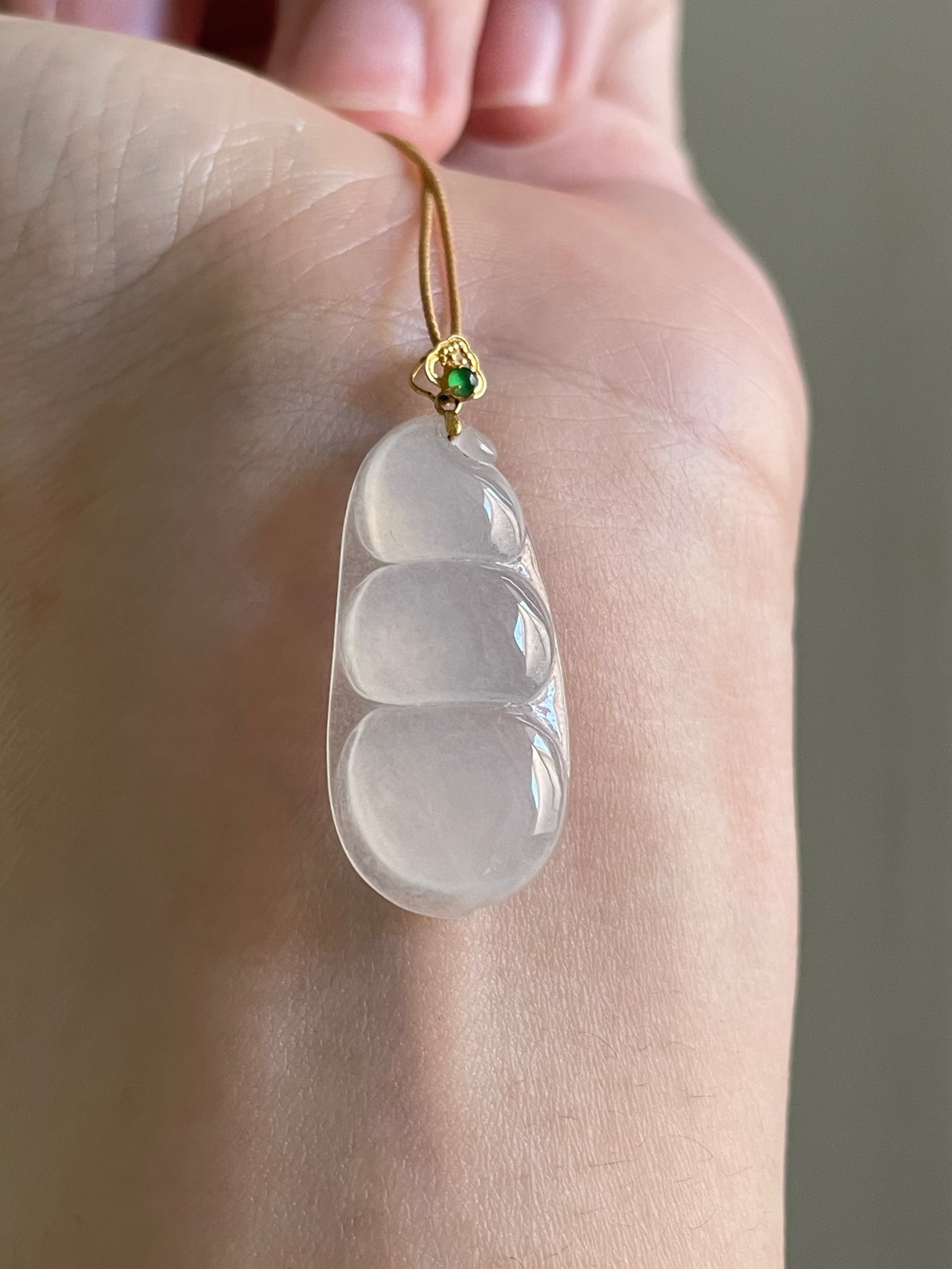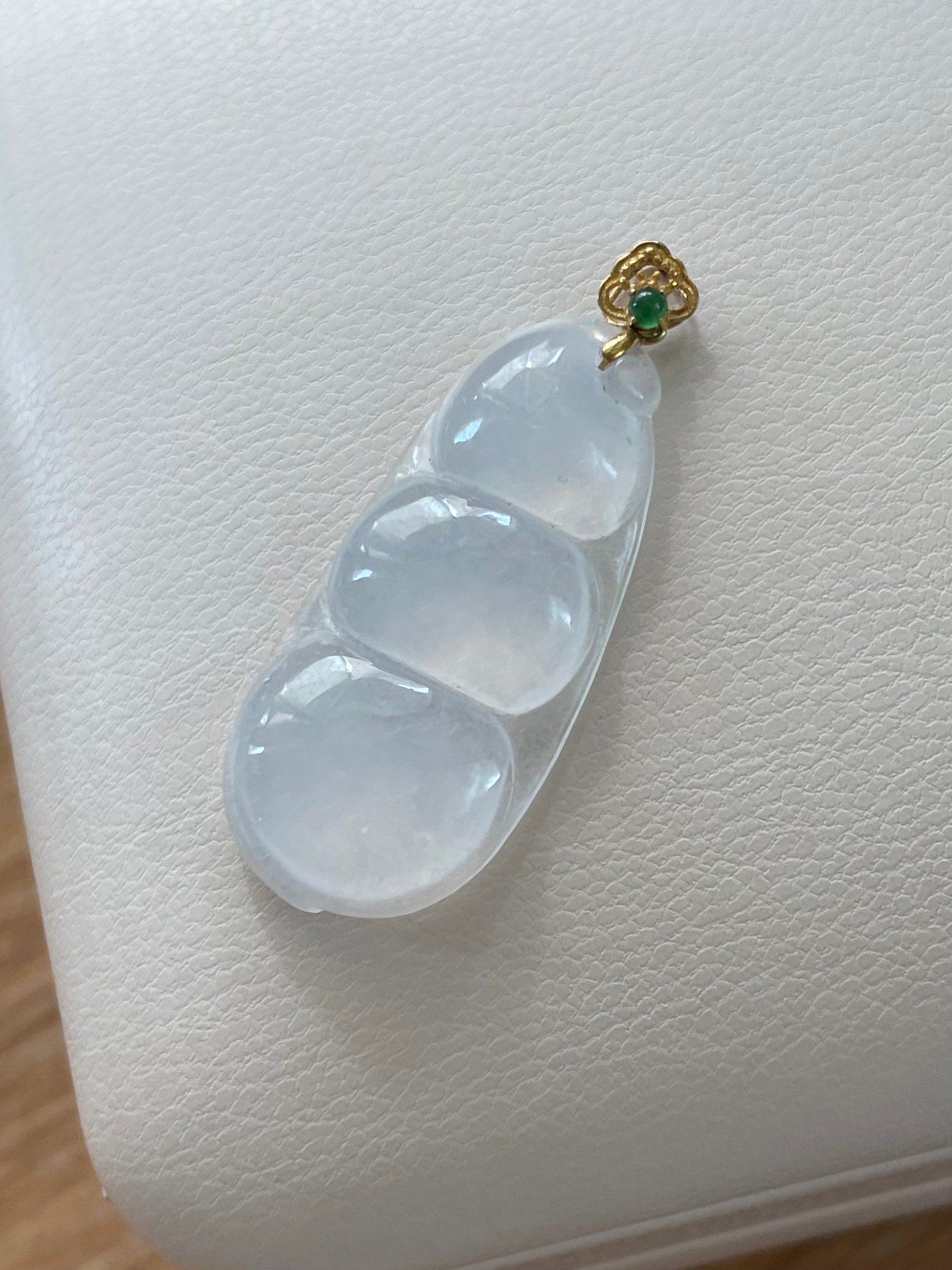 冰透起莹起光,底可透手,福豆寓意好,18k金扣头,裸石约29.4 × 13.8 × 4.2mm,含镶嵌整体约34.5 × 13.8 × 4.2mm,天然缅甸翡翠a货带证书。