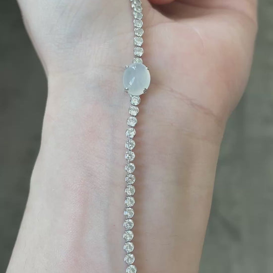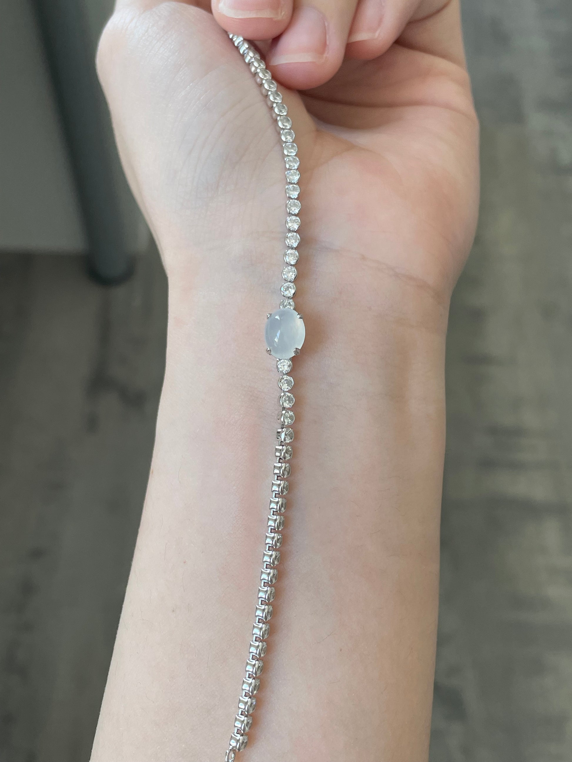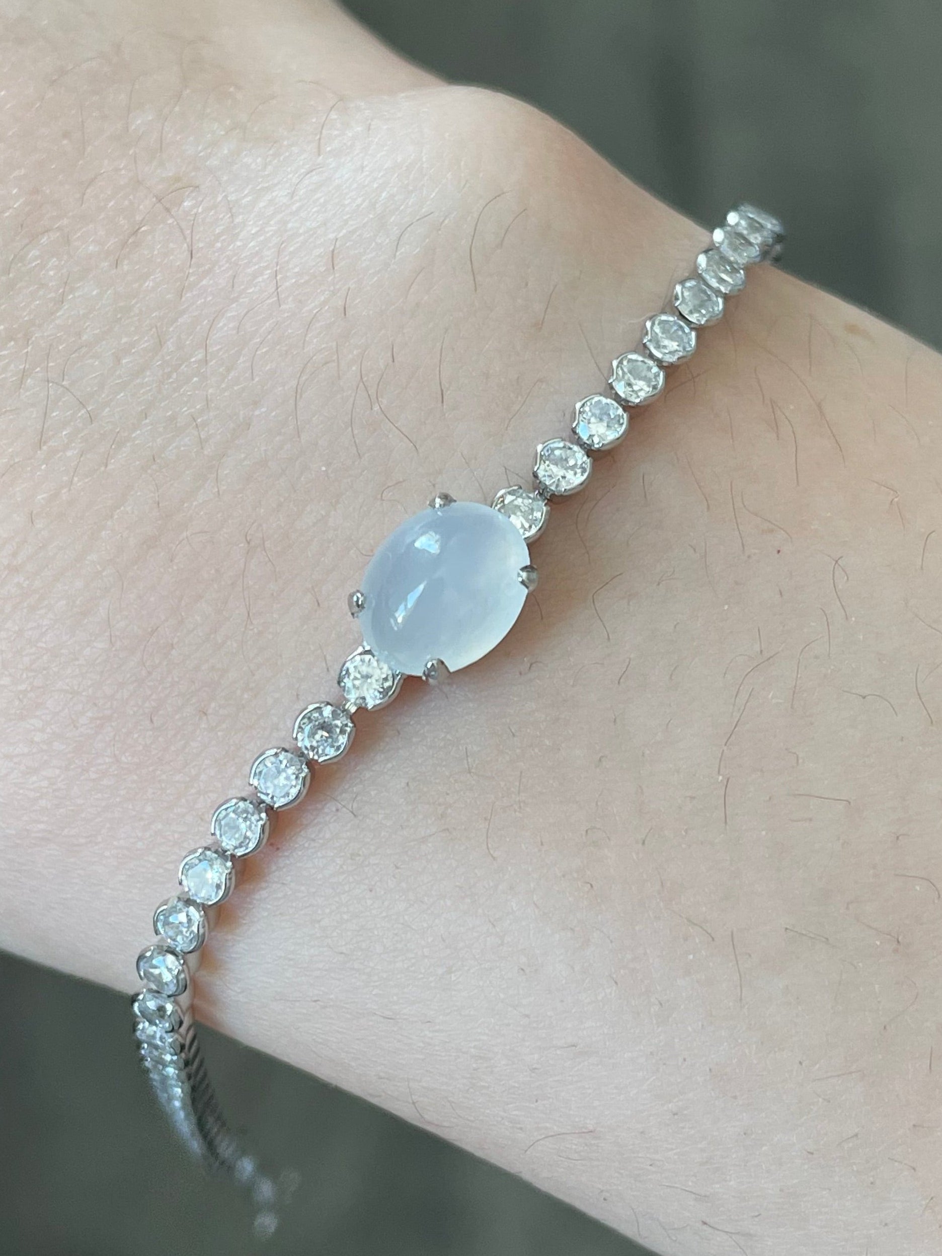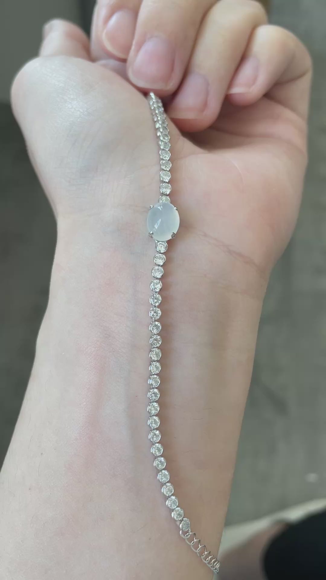 手链以单颗白冰翡翠蛋面与排钻交替排列,网球手链同款~925银镶锆石,简约精致,日常百搭